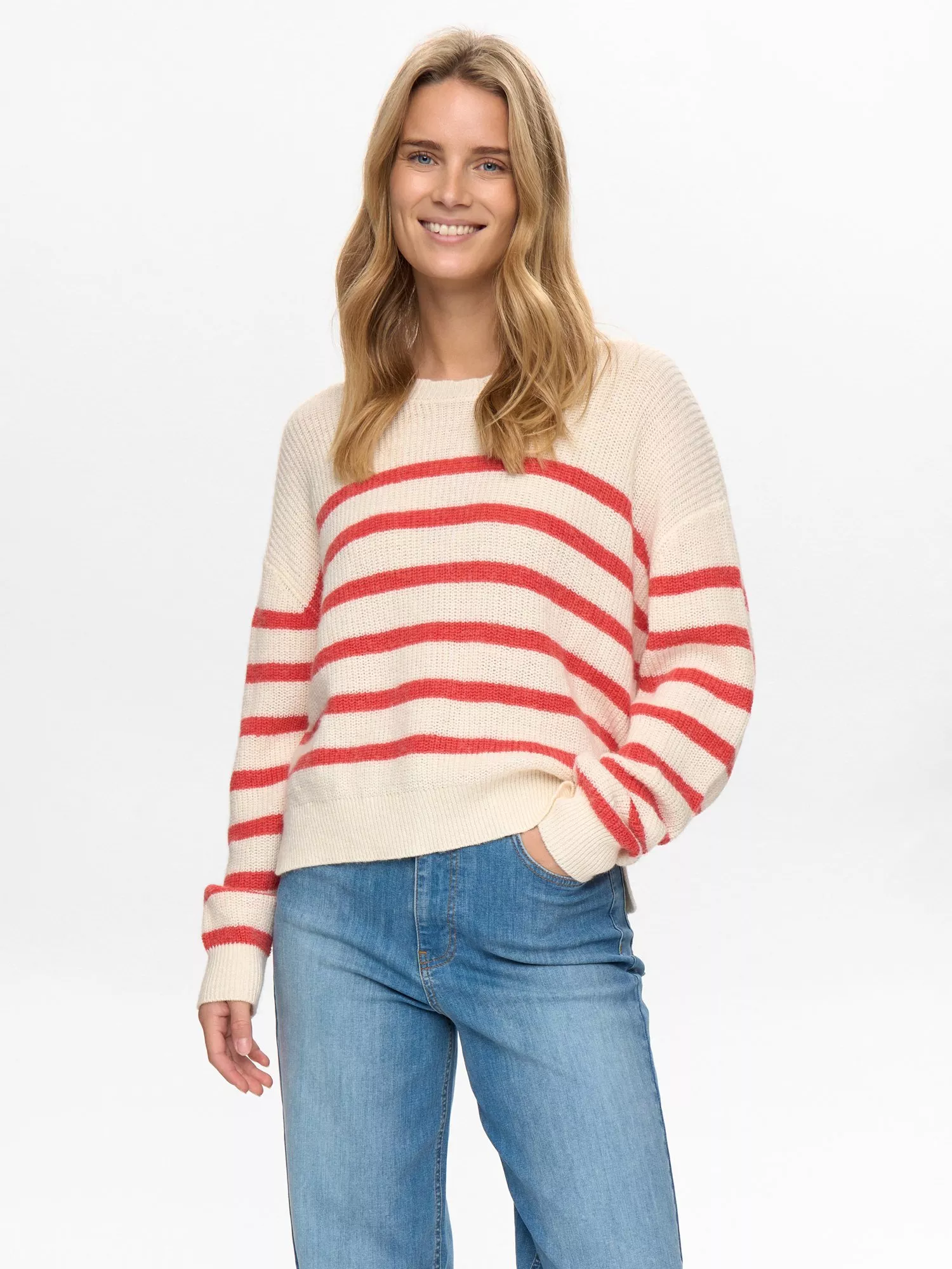 Bold stripes create a striking look on this knitted jumper, completed with a ribbed knit hem and cuffs. Subtle scalloping on the neckline adds a feminine touch. Made from a soft cotton blend with wool and luxurious alpaca in the mix.