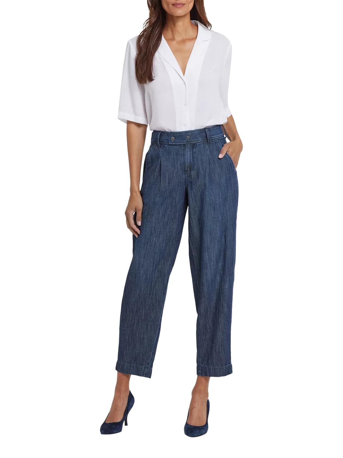 A trending silhouette meets flattering fit in NYDJ's Balloon Trouser Jeans with Drop Waist and Pleats. These relaxed jeans in soft and lightweight cotton denim have a roomy thigh, and the leg tapers from knee to ankle, ending in a trouser-style hem with a back pleat above it. Designed to sit a little lower on the waist, they can also be worn as a high-rise style pulled up to the natural waist. Finished with a zip fly, a tab waistband with snap closures, front pleats, front slash pockets and back patch pockets. La Mer is a classic dark indigo wash with softly blended sanding.