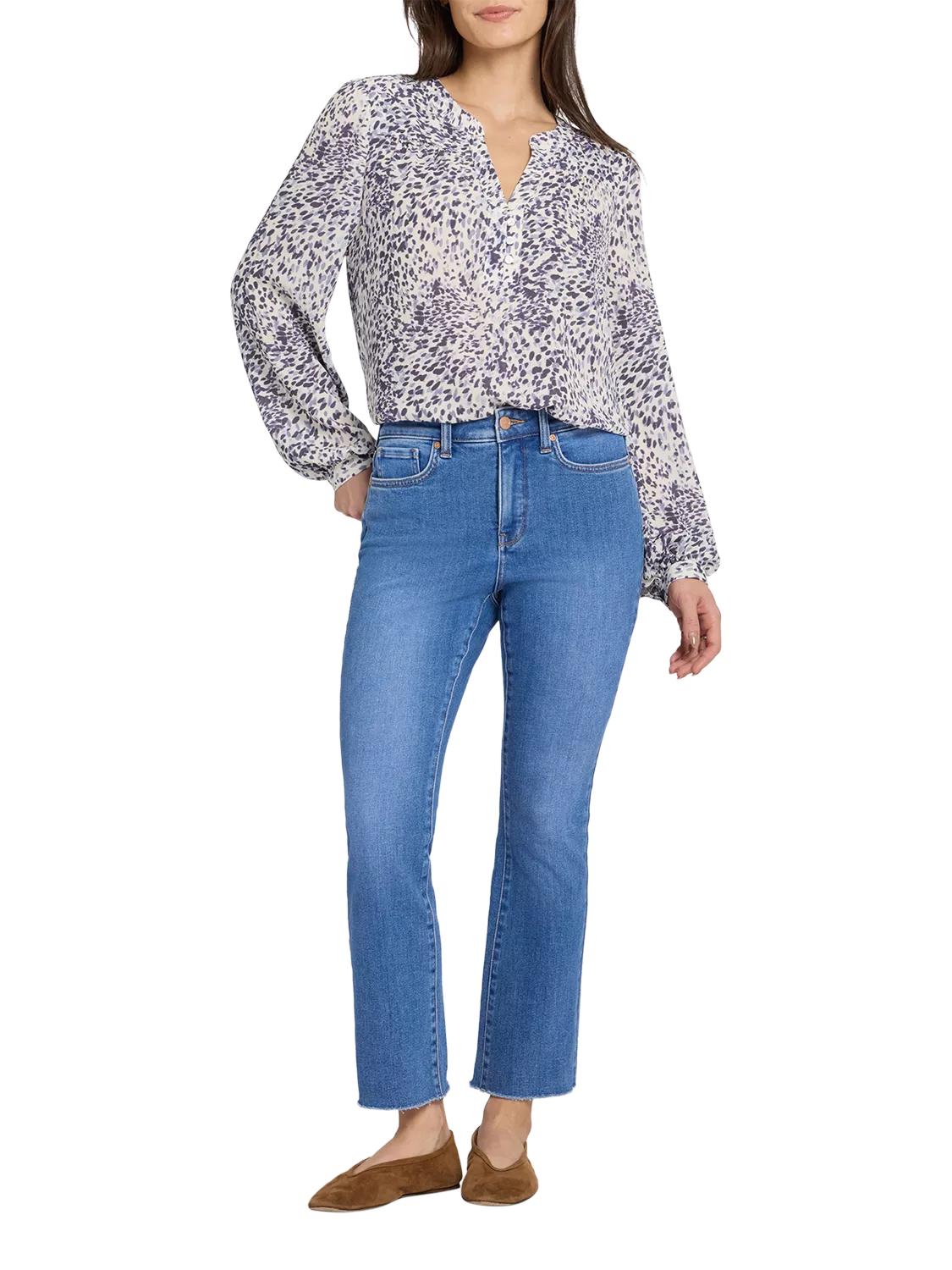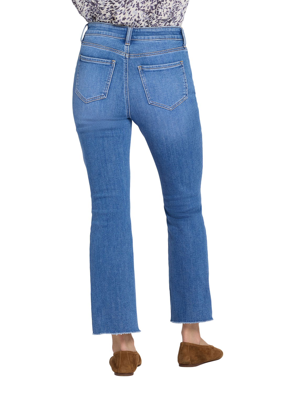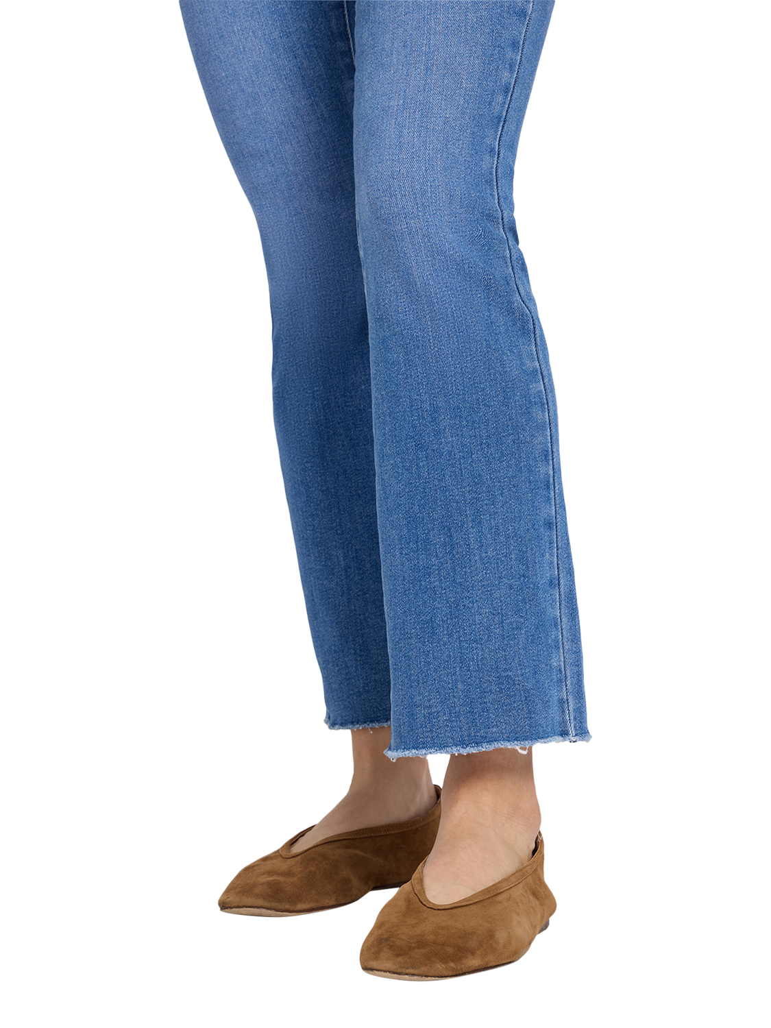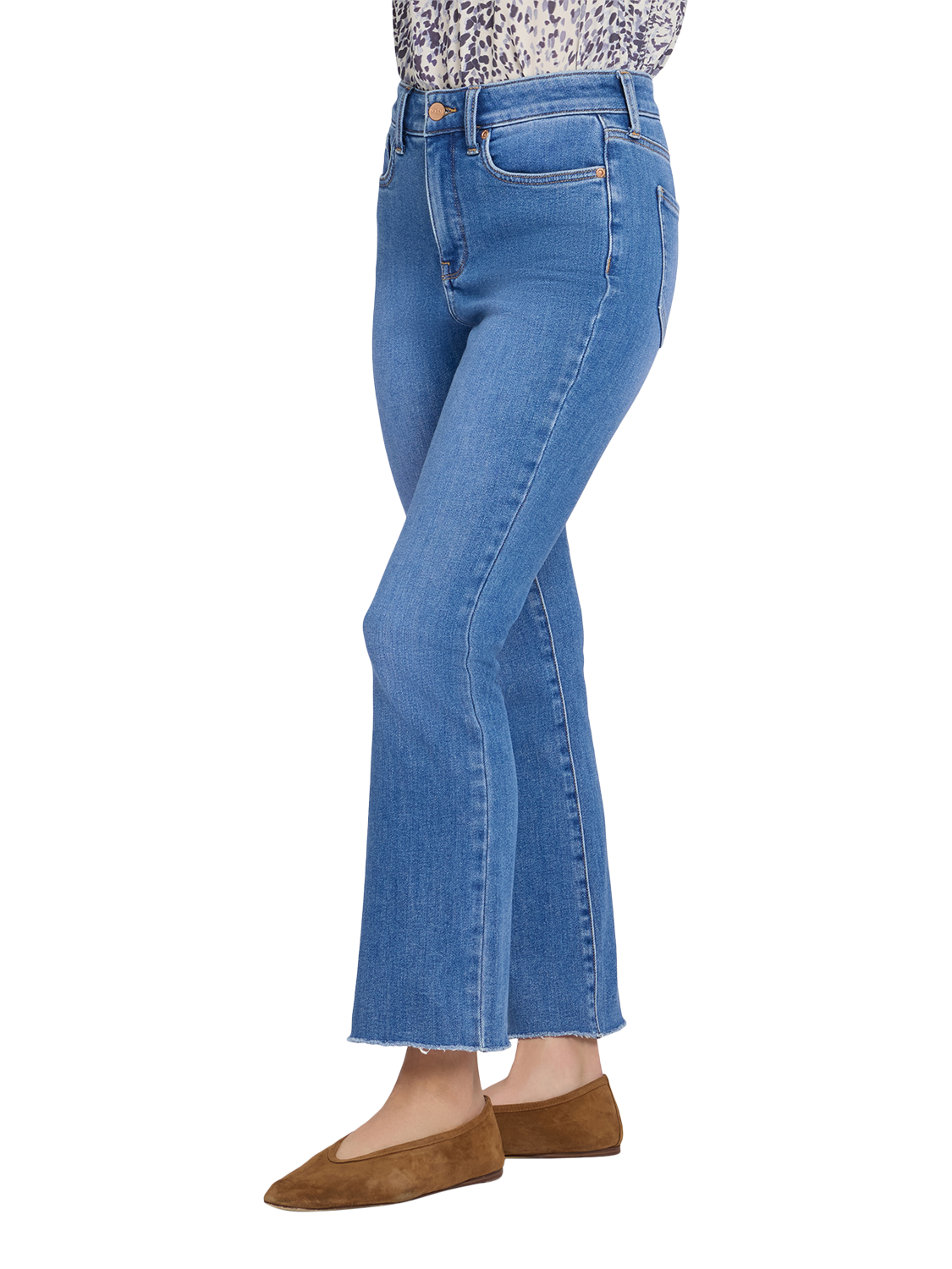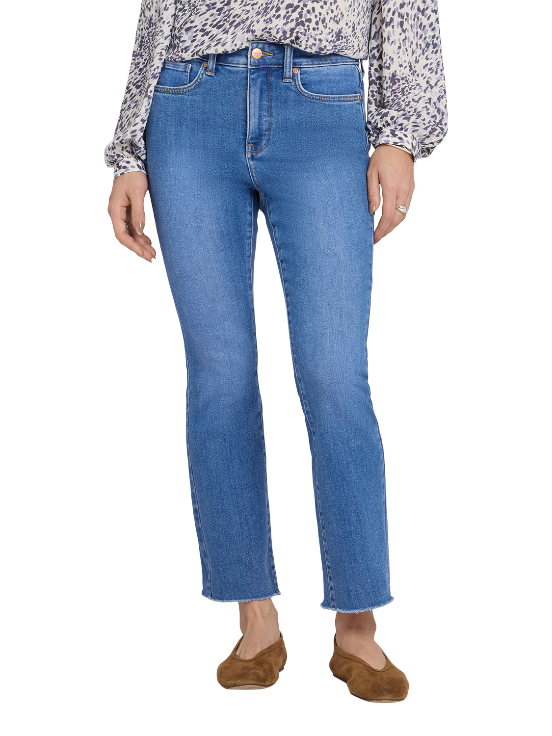 The Billie Mini Bootcut Ankle Jeans with High Rise and Frayed Hems by NYDJ have a modern flared silhouette designed to ensure smooth, sculpted curves. Sleek and slimming, these jeans feature a narrower fit from the hip through the knee, with bootcut flare at the ankle. Lift Tuck® Technology uses a proprietary slimming panel with a patented criss-cross design to shape and support. Finished with a zip and button fly, classic five-pocket styling and frayed hems.