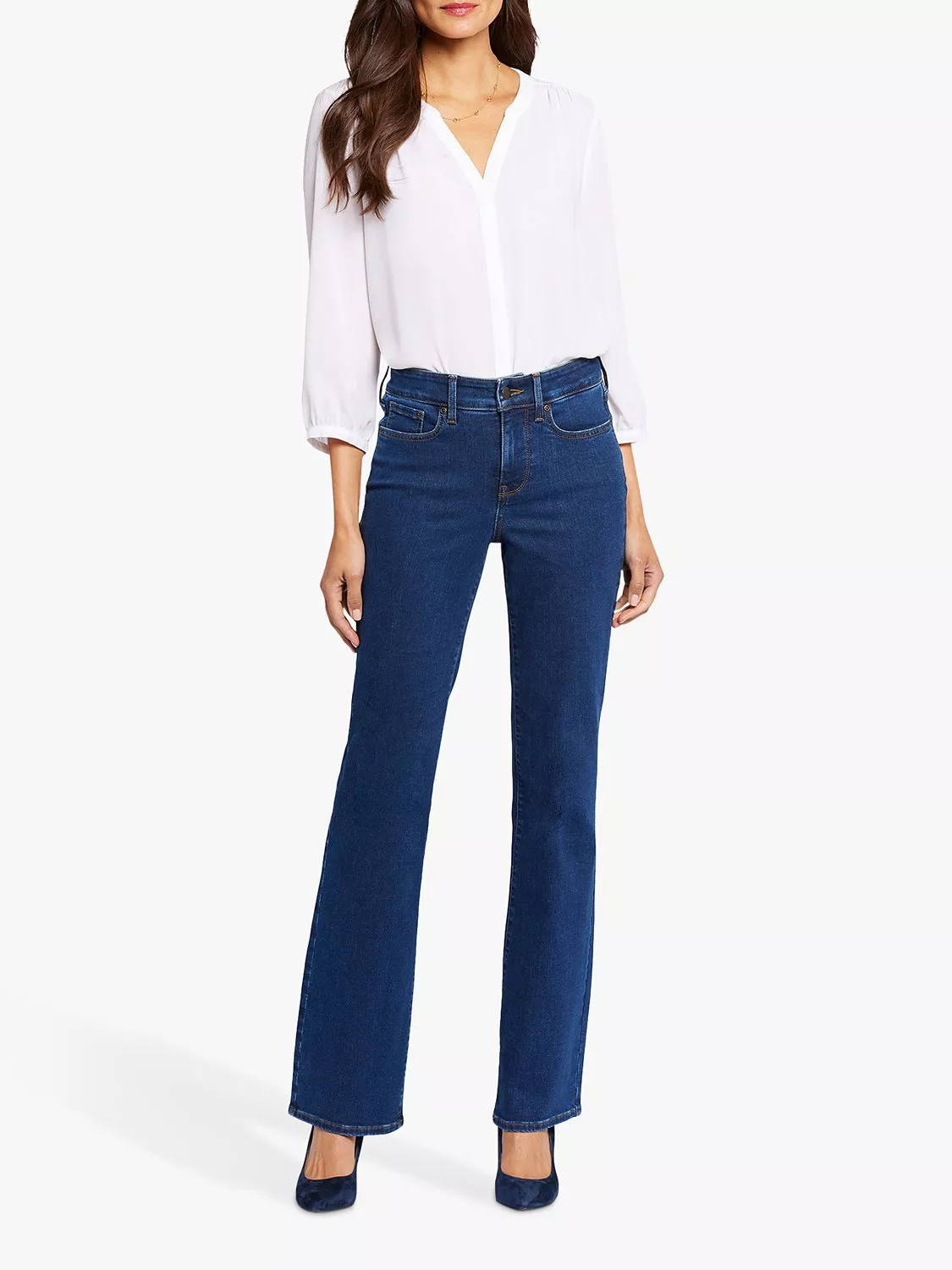 Effortlessly chic, NYDJ's Blake Slim Flared Jeans with High Rise have an elongated inseam, perfect for dressing up or down. This pair features a flattering slim leg that flares out at the hem for a bold statement. The Lift Tuck® Technology uses a proprietary slimming panel with a patented criss-cross design to shape and support your curves. Finished with five-pocket styling, zip fly and button closure.