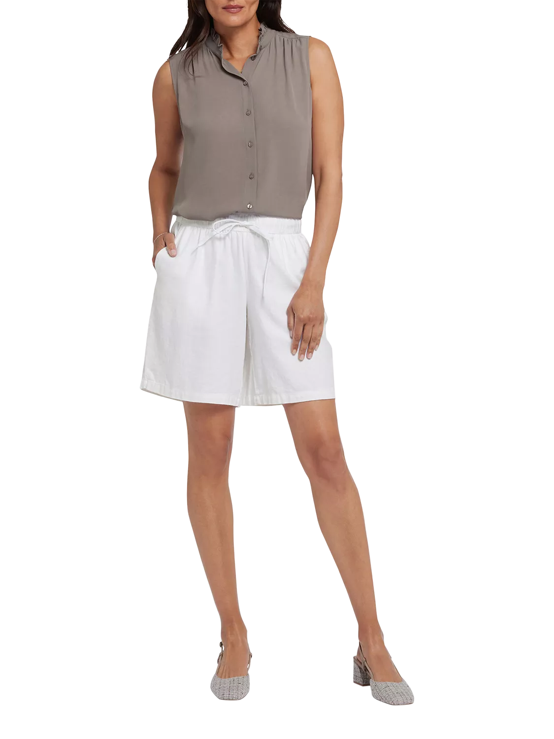 Hot days are a breeze in the Breezy Bermuda Shorts by NYDJ. These stretch linen shorts have a light, airy feel made extra comfortable by a drawstring stretch waist. Finished with front slash pockets and back welt details.