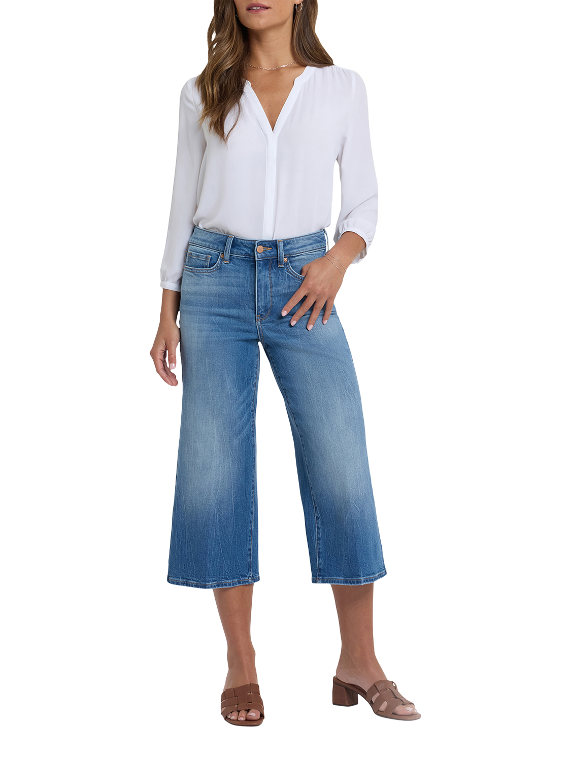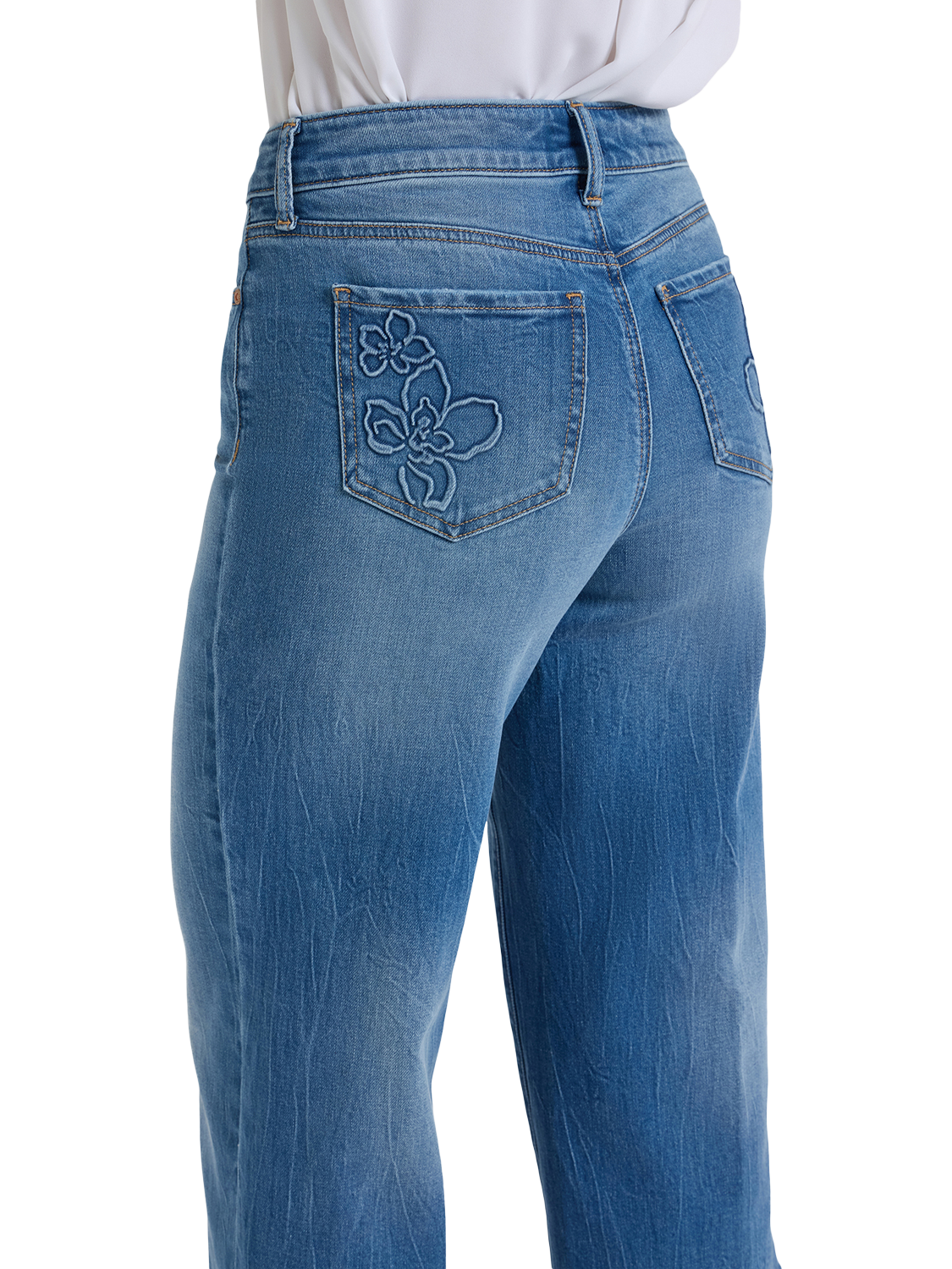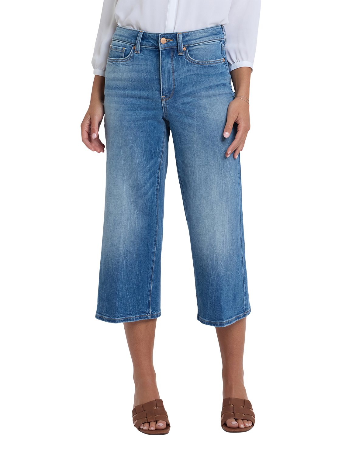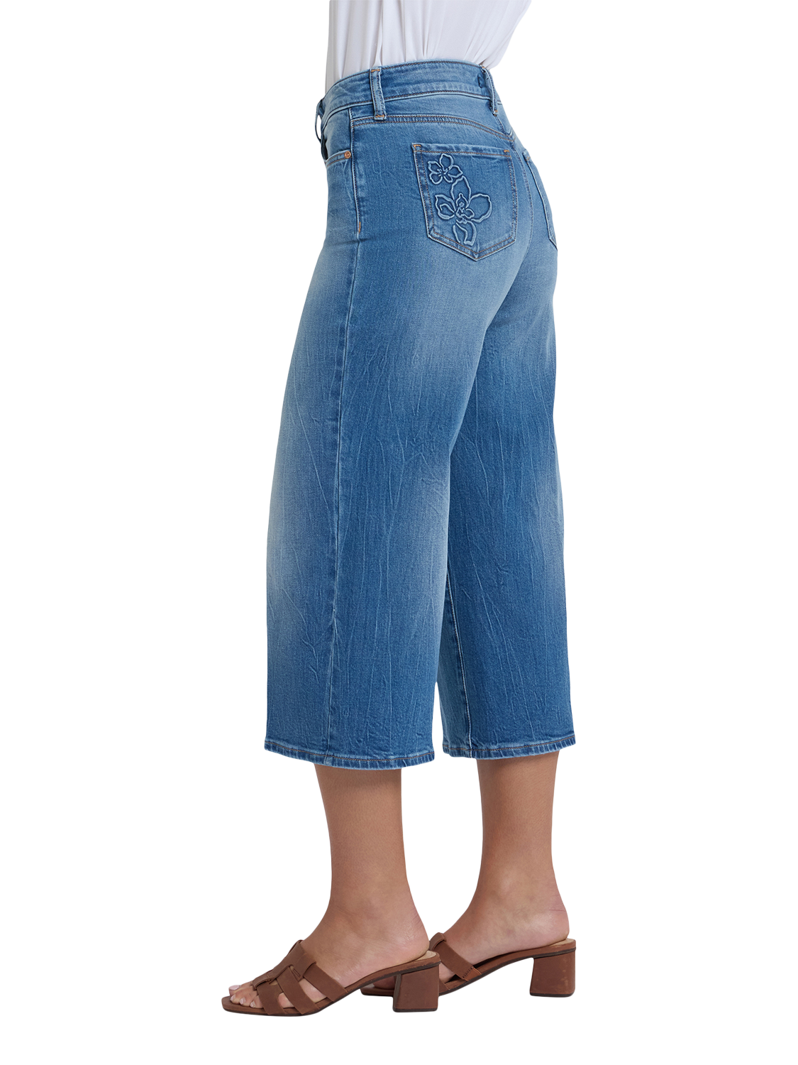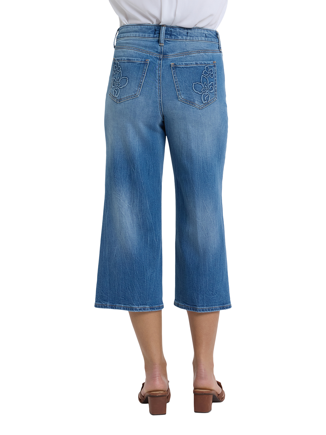 A major wide leg gives NYDJ's Brigitte Wide Leg Capri Jeans a dramatic look, while a body-hugging design through the waist and hips enhances your natural silhouette. This Brigitte style features unique floral designs on the back pockets. Lift Tuck® Technology uses a proprietary slimming panel with a patented criss-cross design to shape and support your curves, providing a smoother fit in front and boosting in back. Finished with five-pocket styling and a zip fly with button closure.