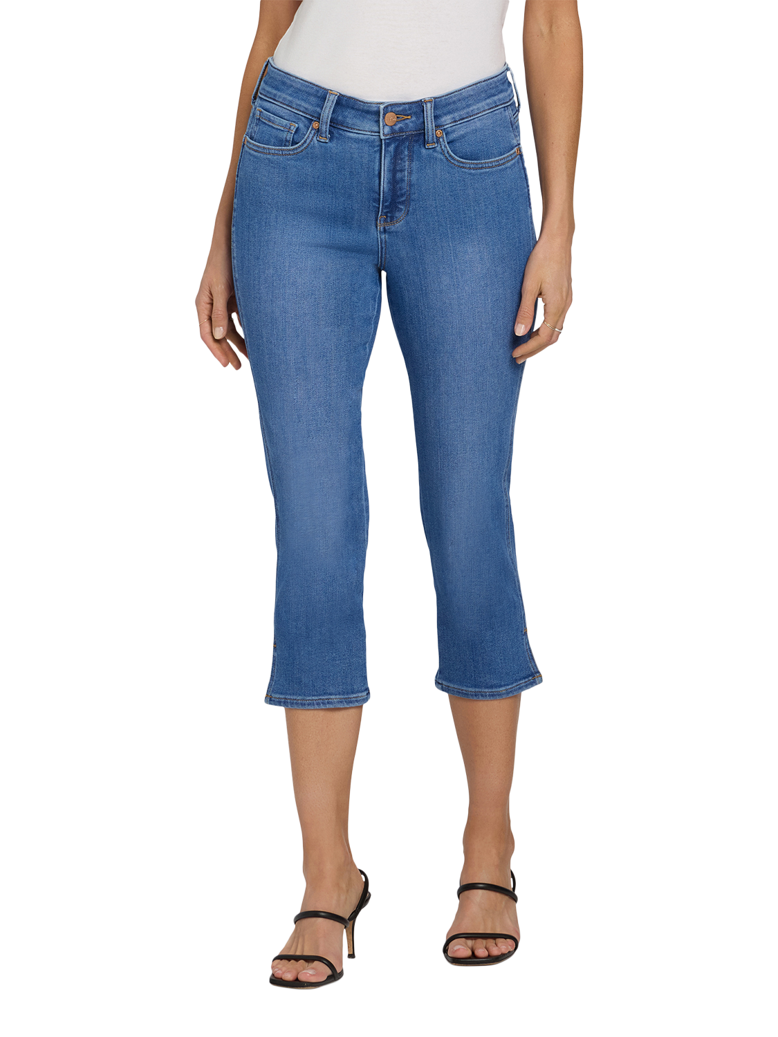 The Chloe Capri Jeans by NYDJ shape and enhance your curves in a slightly cropped silhouette that flatters from every angle. NYDJ’s signature Lift Tuck® Technology uses a proprietary slimming panel with a patented criss-cross design to give a smoother appearance. Features classic five-pocket styling, a zip fly with button closure and side slits at the hems.