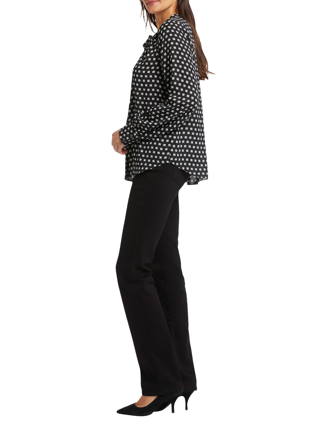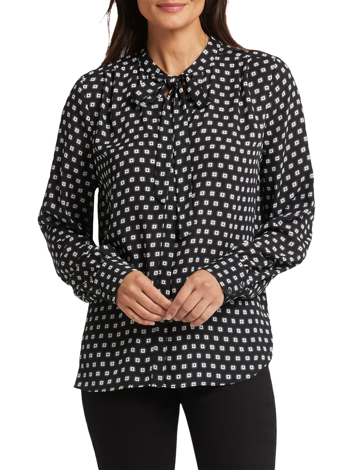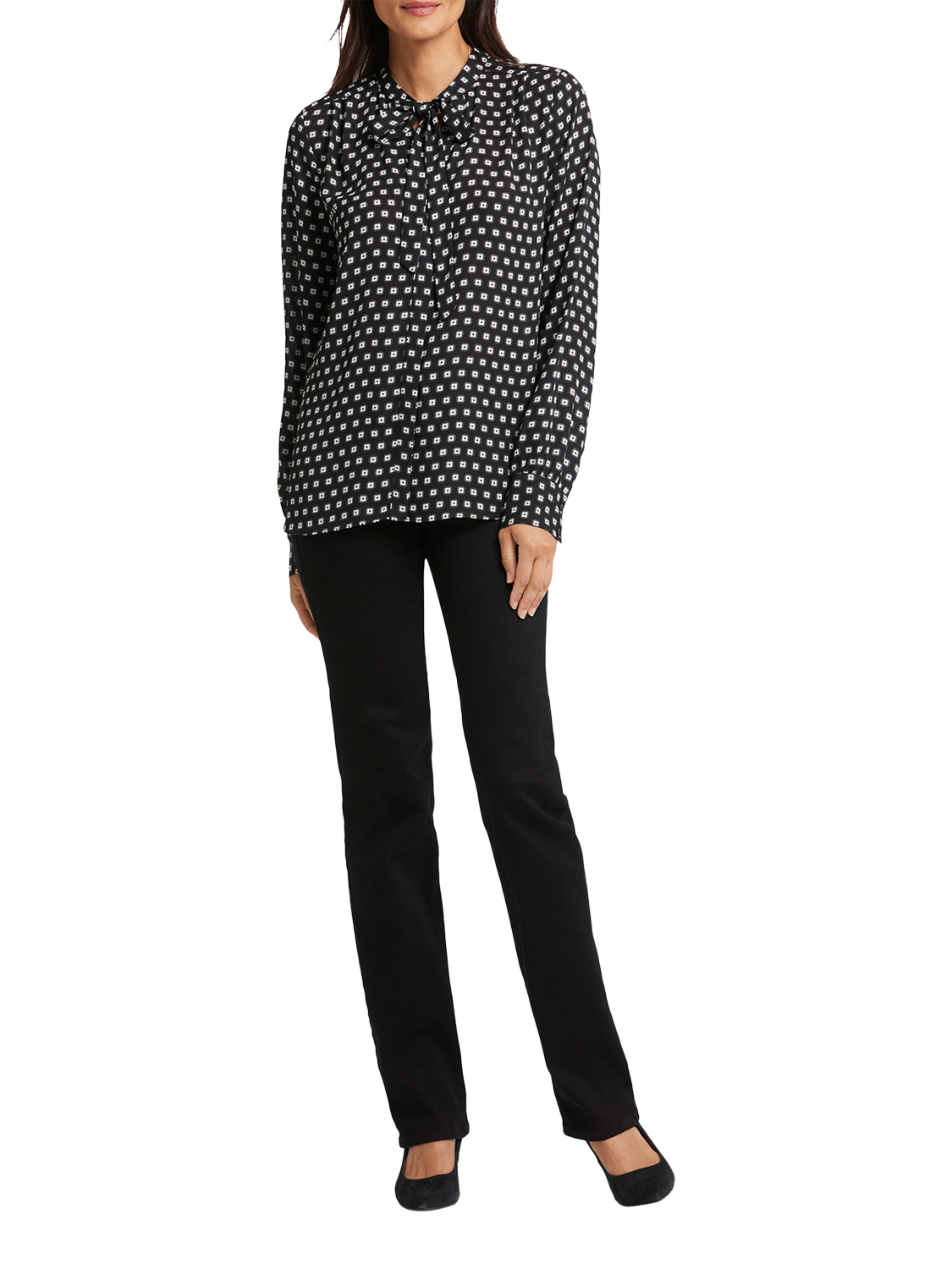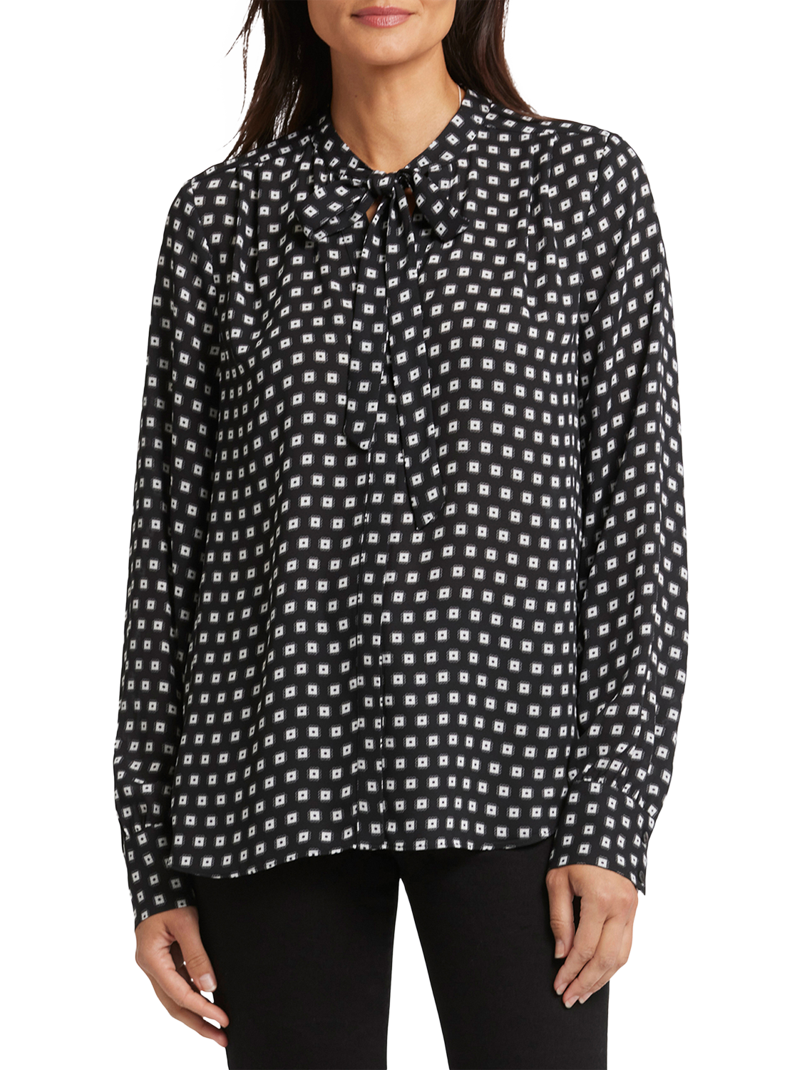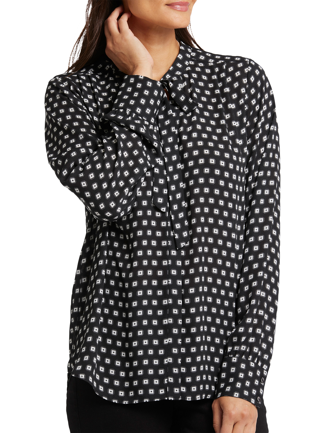 NYDJ's Tie-Neck Blouse makes an elegant statement. With its versatile neck tie that can be styled up or left down and its long blouson sleeves, this blouse exudes sophistication. Offering timeless style with a contemporary twist, this blouse effortlessly pairs with your favourite jeans or trousers for a chic and polished look.