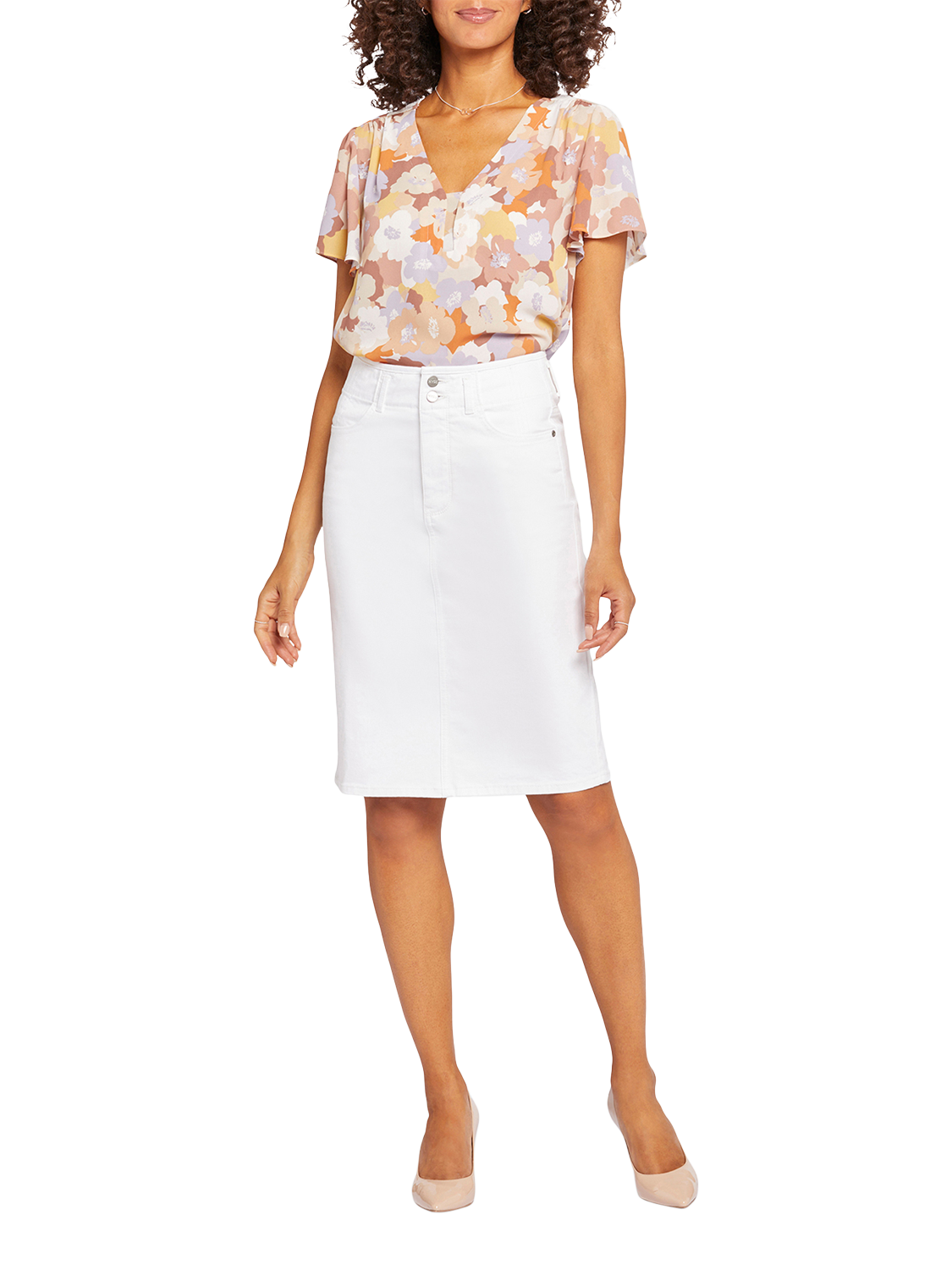 NYDJ's High Waist Skirt can take you everywhere you need to go. The waistband sits high on the nipped-in waist, instantly adding polish and definition to this knee-grazing style. Our signature Lift Tuck® Technology provides just the right amount of support for a smooth, flawless figure—all thanks to an innovative, proprietary slimming panel with a patented criss-cross design. Finished with a zip fly with two button closures and four-pocket styling.