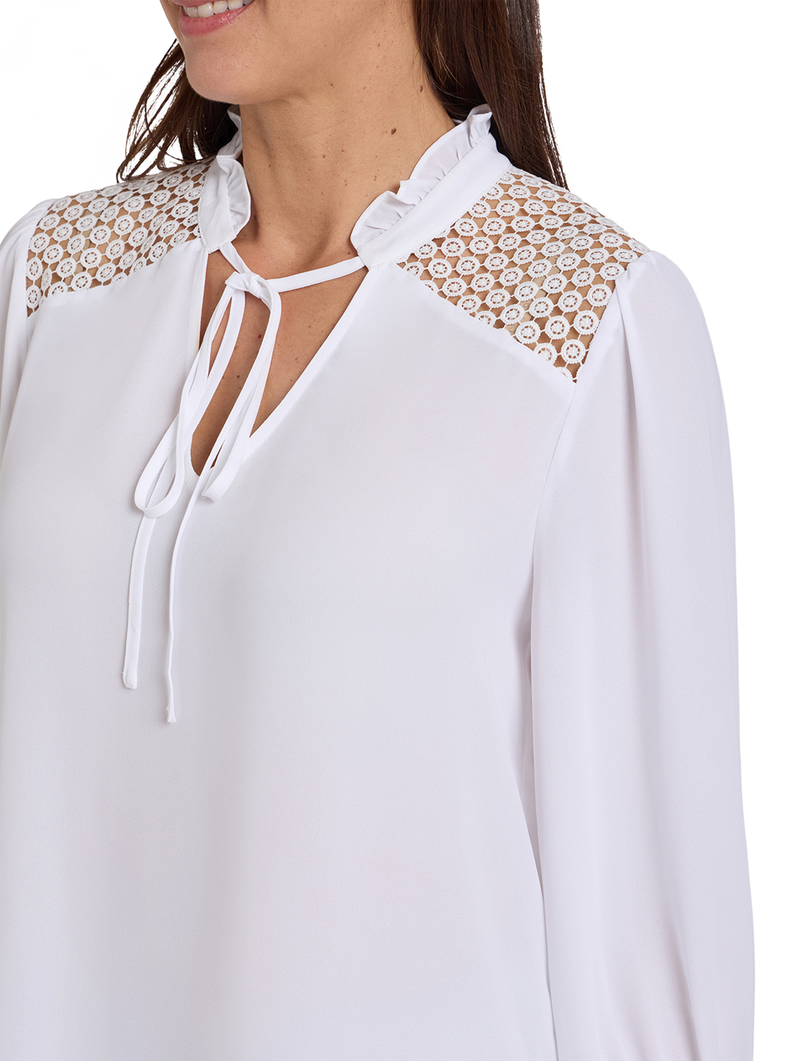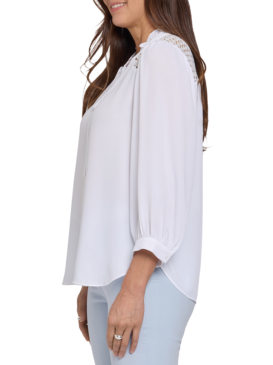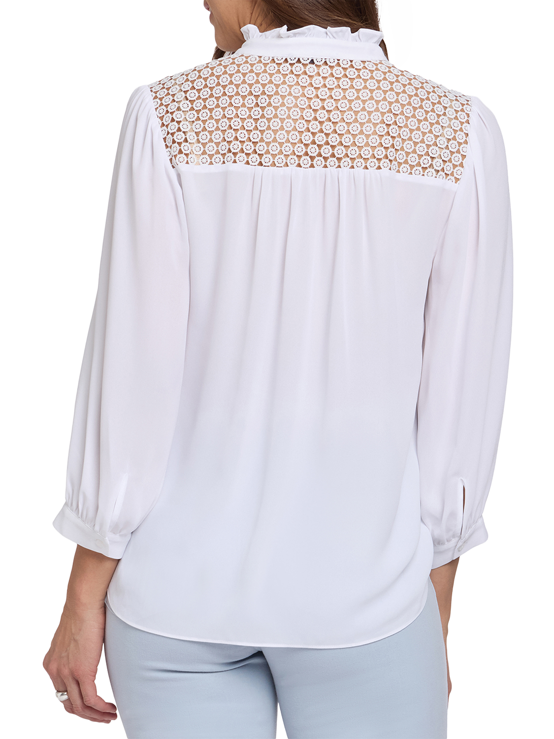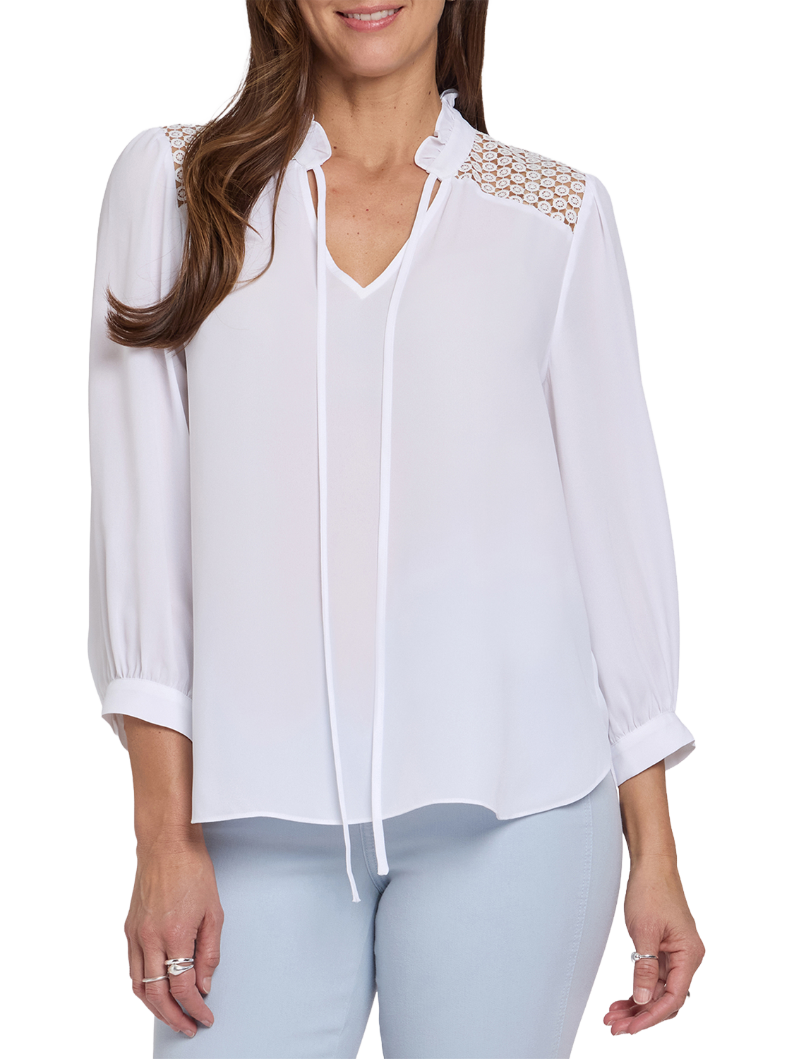 The Lorelei Lace Yoke Blouse by NYDJ makes a gorgeous addition to jeans. Designed with attention to every detail, it features a ruffle collar, a sheer lace yoke and a split neck with ties that look stylish in a bow or undone. Finished with long sleeves gathered into button cuffs and a flattering curved hem.
