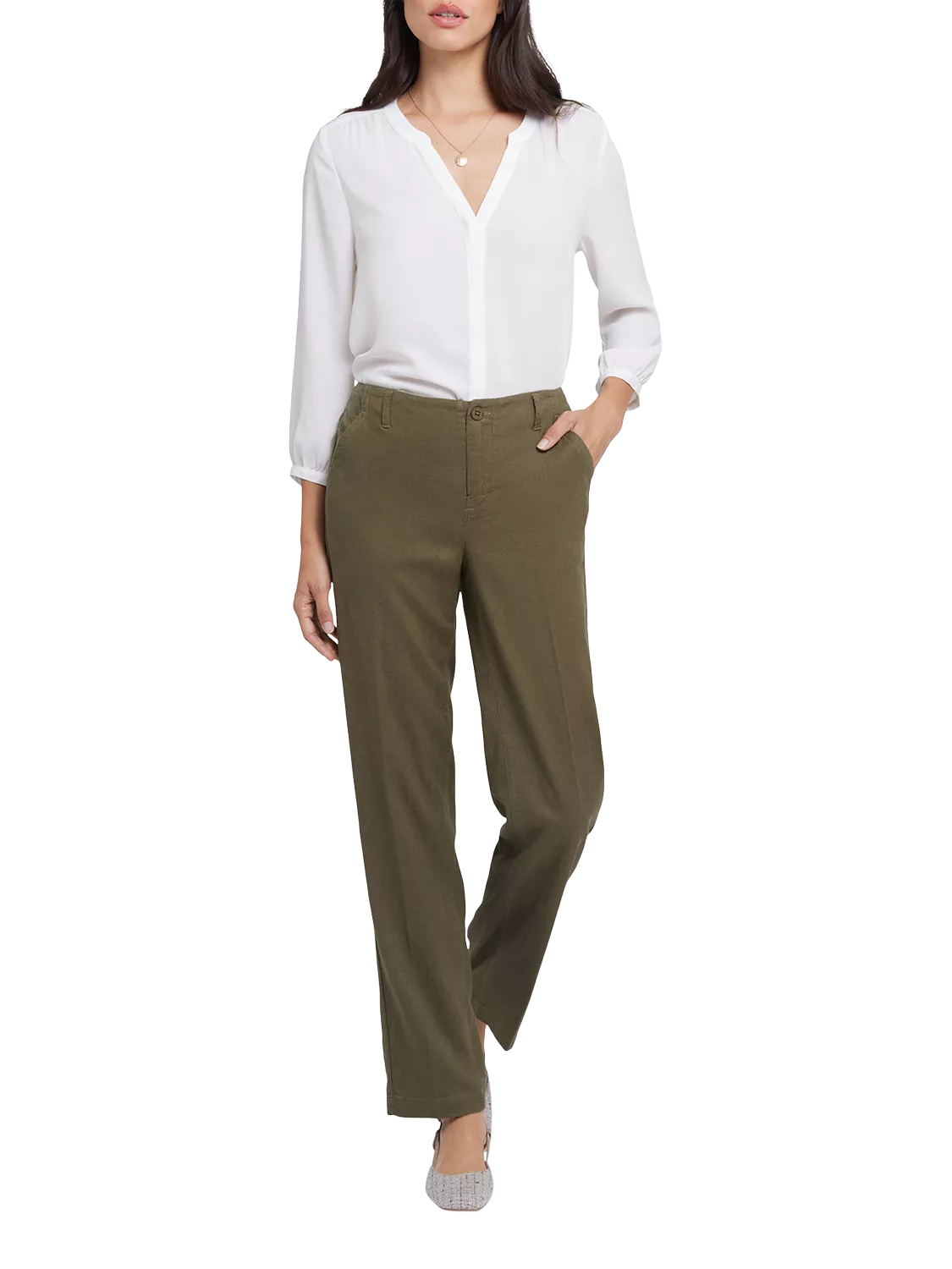 Our best-selling Marilyn Straight silhouette meets our deliciously cool and comfortable stretch linen. NYDJ's Marilyn Straight Trousers in Stretch Linen are a sophisticated warm-weather alternative to your favourite jeans. A high waist with a clean waistband and a versatile straight-leg design make them so flattering and easy to wear, while our Lift Tuck® Technology enhances the fit even more by using a proprietary slimming panel to shape and support your curves. Finished with a zip fly and button closure, front slash pockets and back patch pockets.