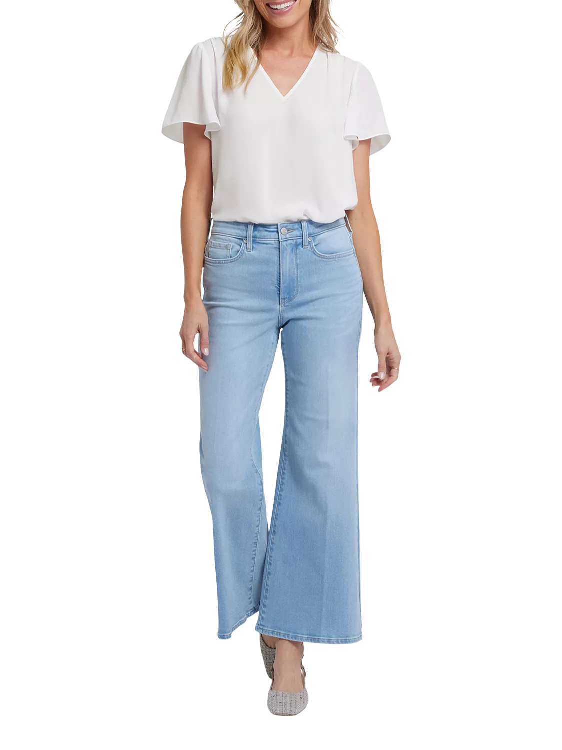 NYDJ's Mia Palazzo Ankle Jeans with High Rise make a bold, breezy statement with their super-flared legs. This pair has a flattering fit that hugs the hips and thighs and is detailed with centre-leg creases. Our Lift Tuck® Technology uses a proprietary slimming panel with a patented criss-cross design to shape and support your curves for an always-sleek silhouette. Features five-pocket styling and a zip fly with button closure.