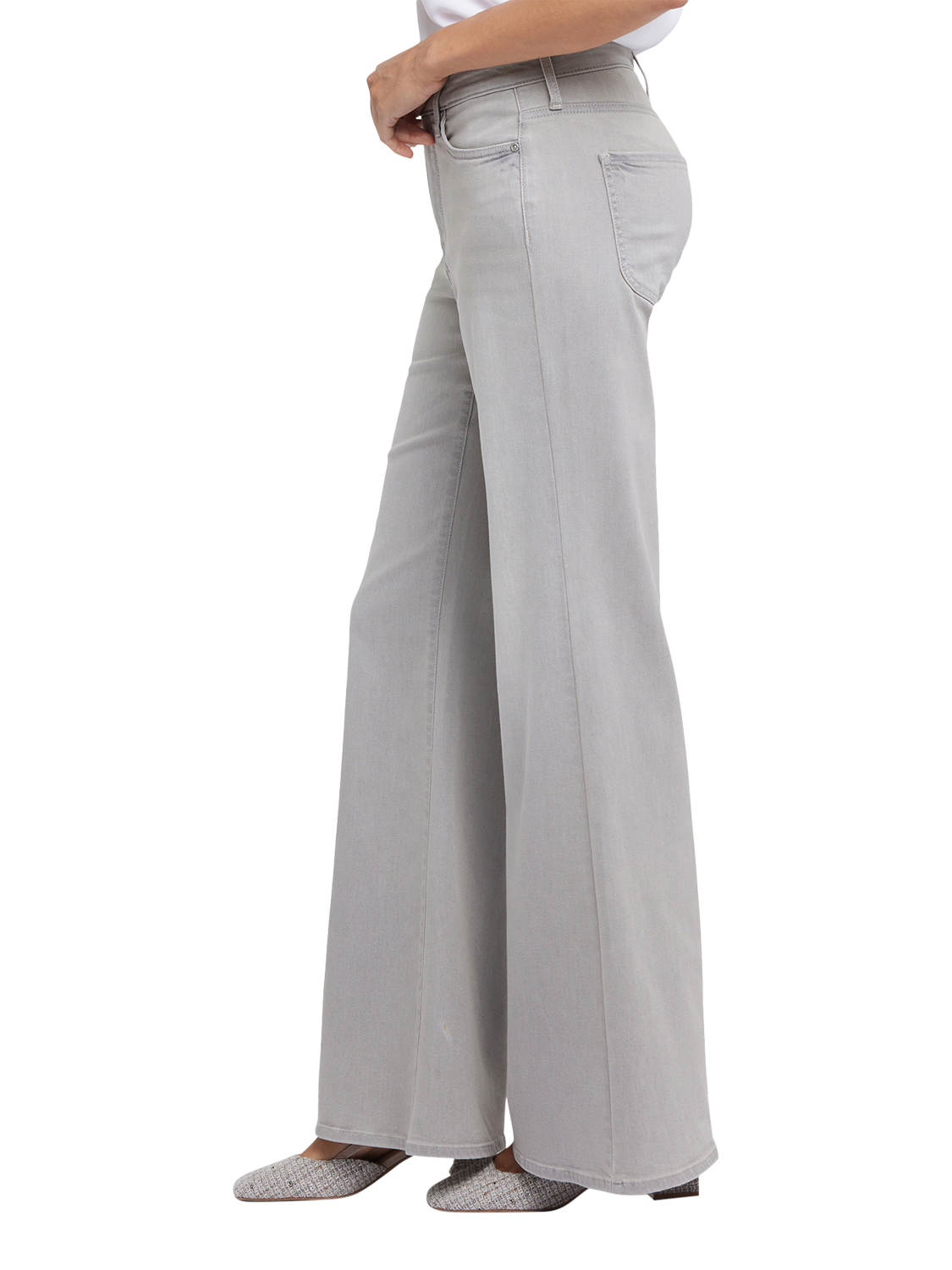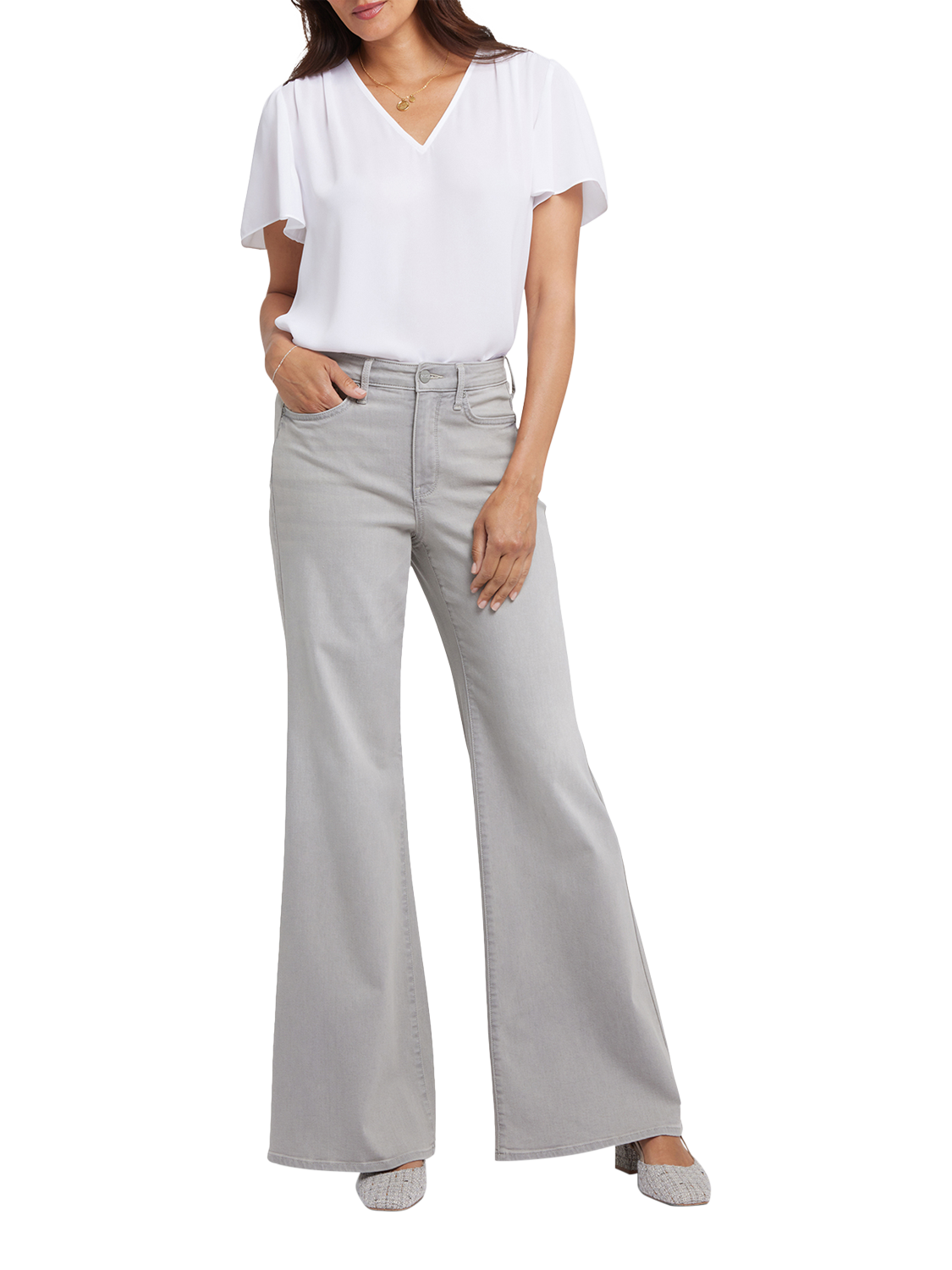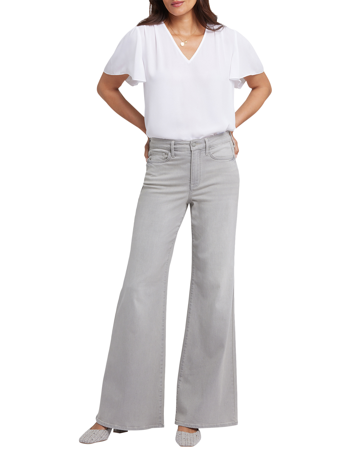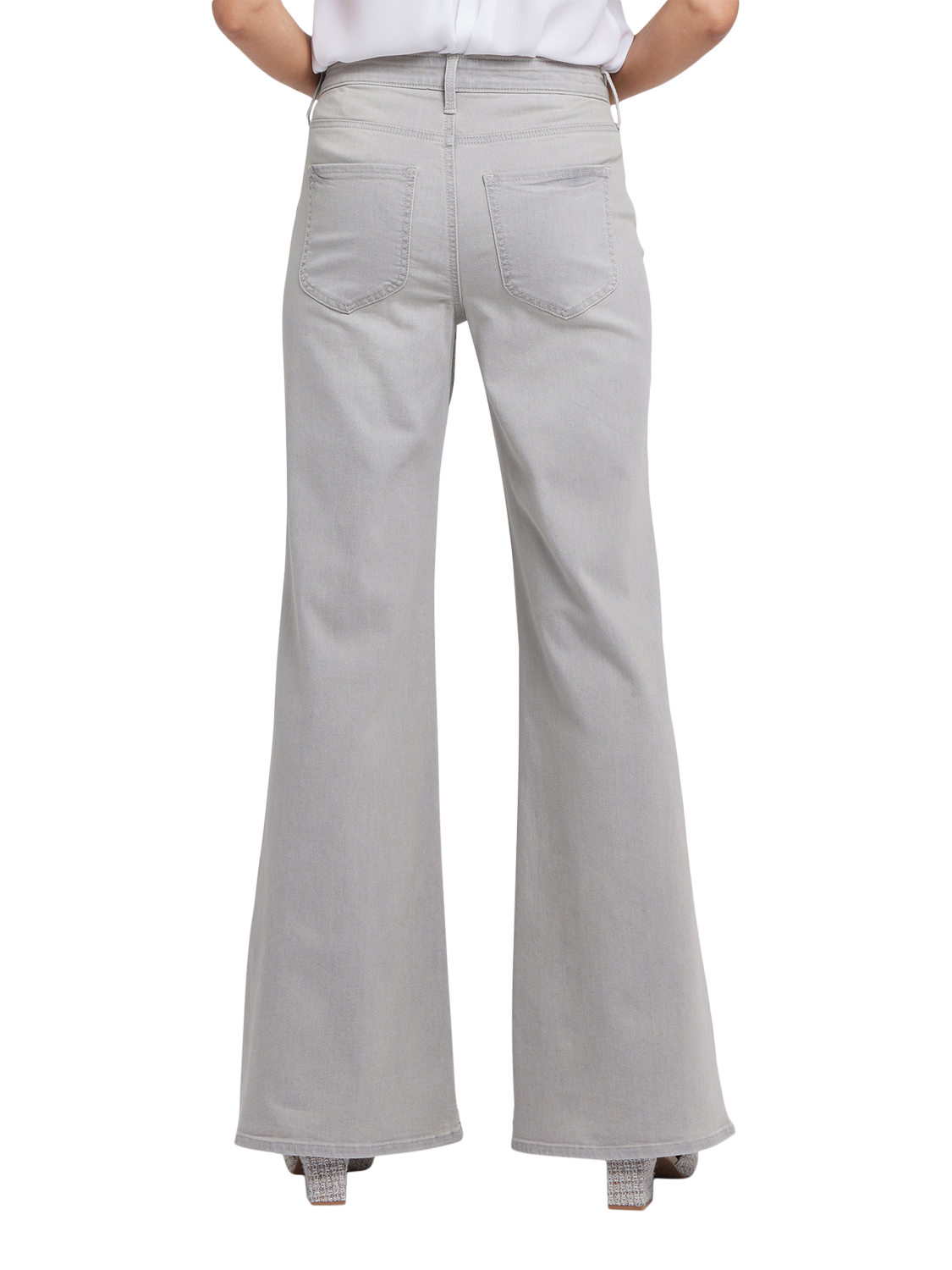 NYDJ's Mia Palazzo Jeans make a bold, breezy statement with their super-flared legs. Sitting high on the waist, this pair has a flattering fit that hugs the hips and thighs and is detailed with centre-leg creases. Our Lift Tuck® Technology uses a proprietary slimming panel with a patented criss-cross design to shape and support your curves for an always-sleek silhouette. Features five-pocket styling and a zip fly with button closure.