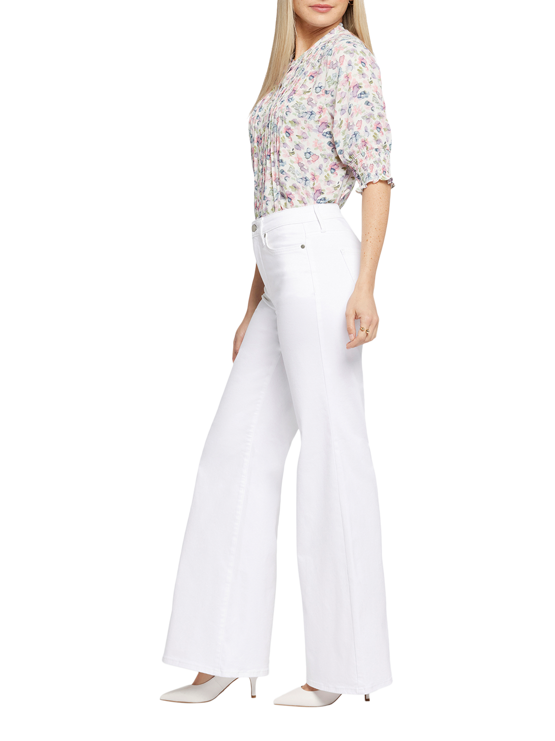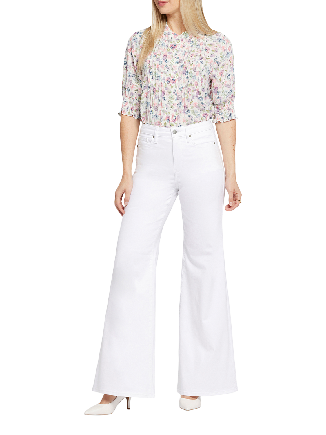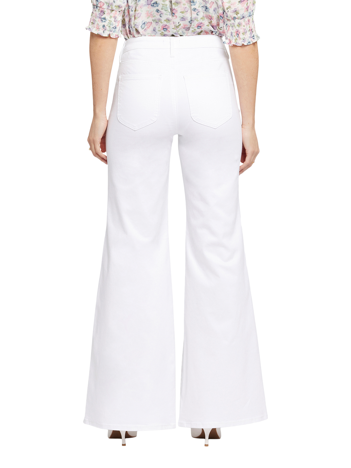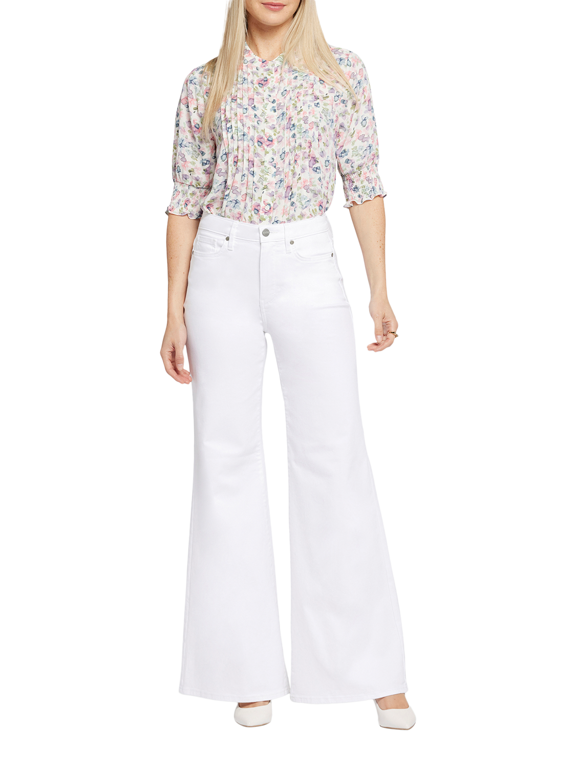 NYDJ's Mia Palazzo Jeans make a bold, breezy statement with their super-flared legs. Sitting high on the waist, this pair has a flattering fit that hugs the hips and thighs and is detailed with centre-leg creases. Our Lift Tuck® Technology uses a proprietary slimming panel with a patented criss-cross design to shape and support your curves for an always-sleek silhouette. Features five-pocket styling and a zip fly with button closure.