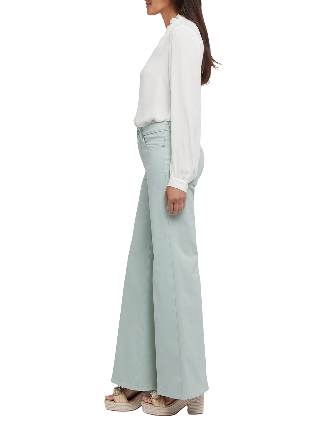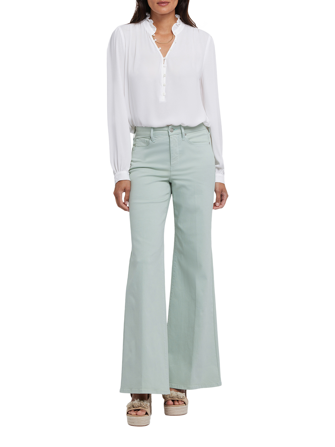 NYDJ's Mia Palazzo Jeans make a bold, breezy statement with their super-flared legs. Sitting high on the waist, this pair has a flattering fit that hugs the hips and thighs and is detailed with centre-leg creases. Our Lift Tuck® Technology uses a proprietary slimming panel with a patented criss-cross design to shape and support your curves for an always-sleek silhouette. Features five-pocket styling and a zip fly with button closure.