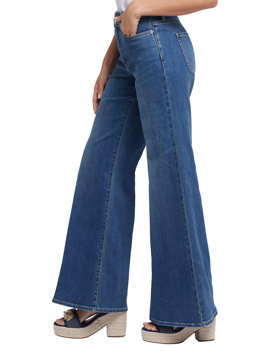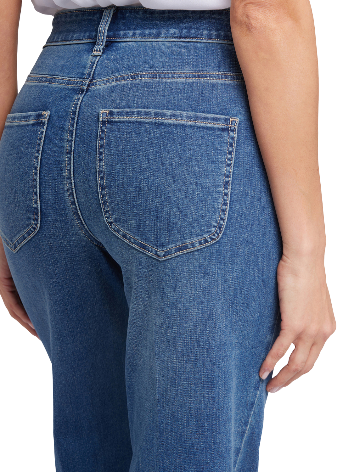NYDJ's Mia Palazzo Jeans in Petite make a bold, breezy statement with their super-flared legs. Sitting high on the waist, this pair has a flattering fit that hugs the hips and thighs and is detailed with centre-leg creases. Our Lift Tuck® Technology uses a proprietary slimming panel with a patented criss-cross design to shape and support your curves for an always-sleek silhouette. Features five-pocket styling and a zip fly with button closure.