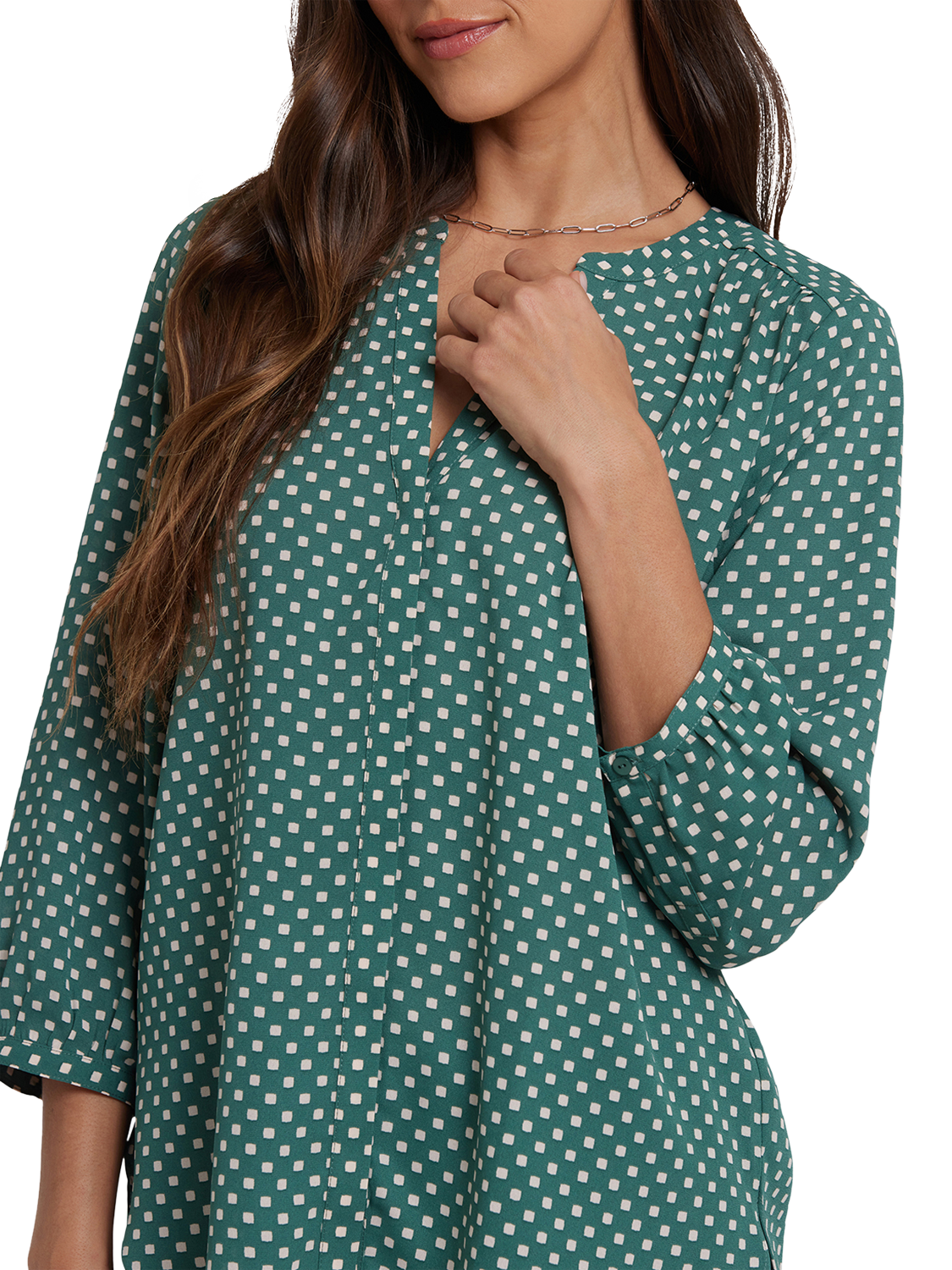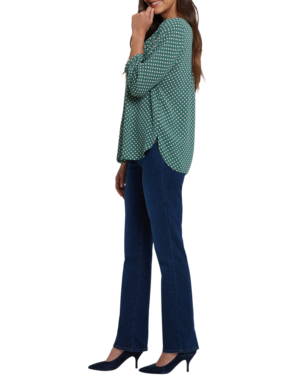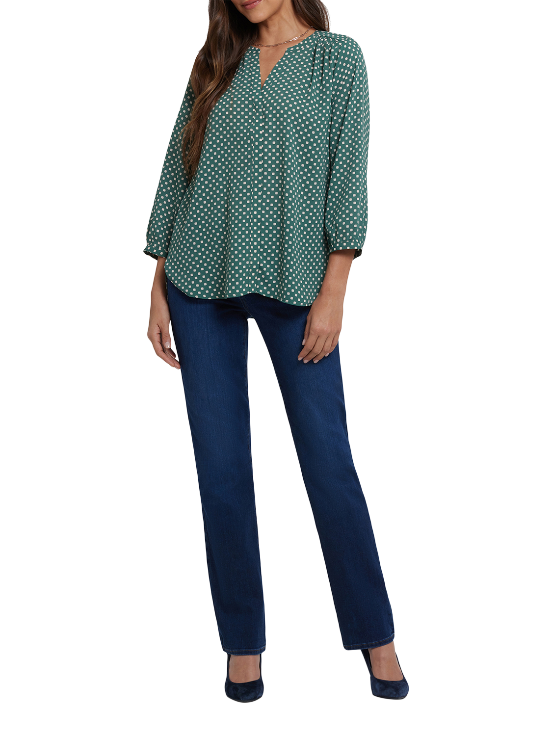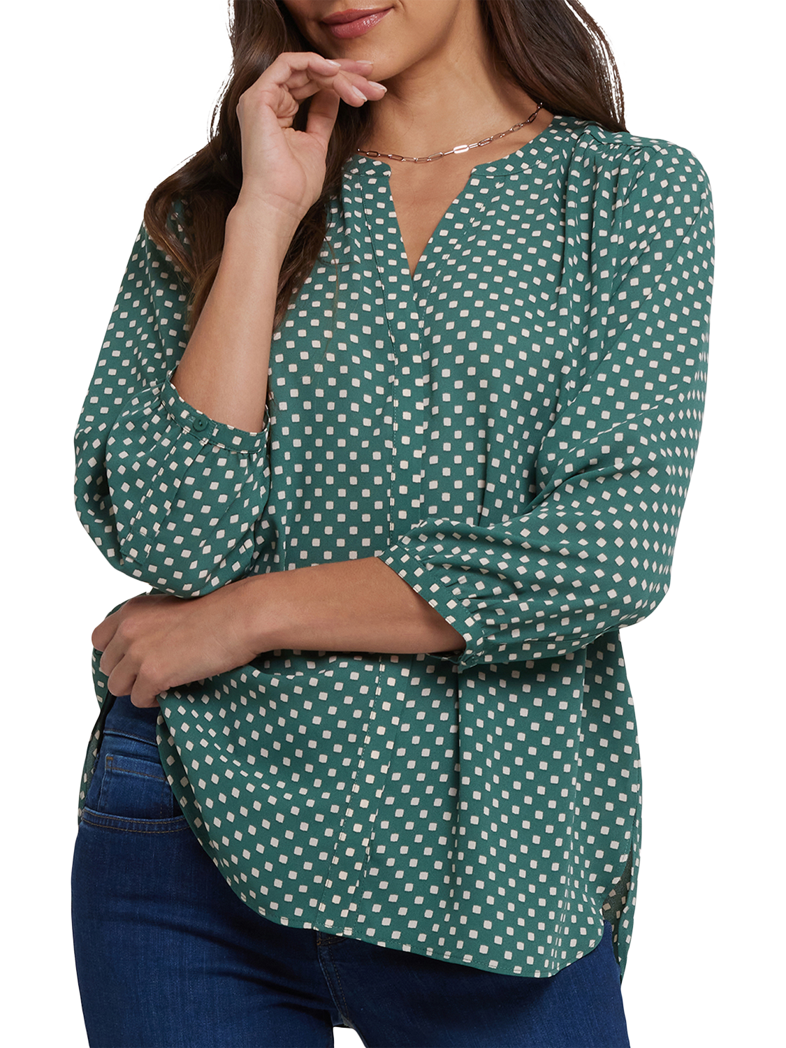 NYDJ's Pintuck Blouse has a billowy three-quarter-sleeved silhouette that's perfect when paired with any of our slimming denim styles. Pleating at the back yoke creates a sophisticated yet easy drape. Finished with a split round neckline, covered full front placket and button closures. This blouse's fabric is made with a sustainable polyester fibre created from 100% post-consumer plastic waste, resulting in less water and energy use and fewer greenhouse gas emissions without changing the look and feel of the fabric. The buttons are made with 50% post-consumer recycled polyester.