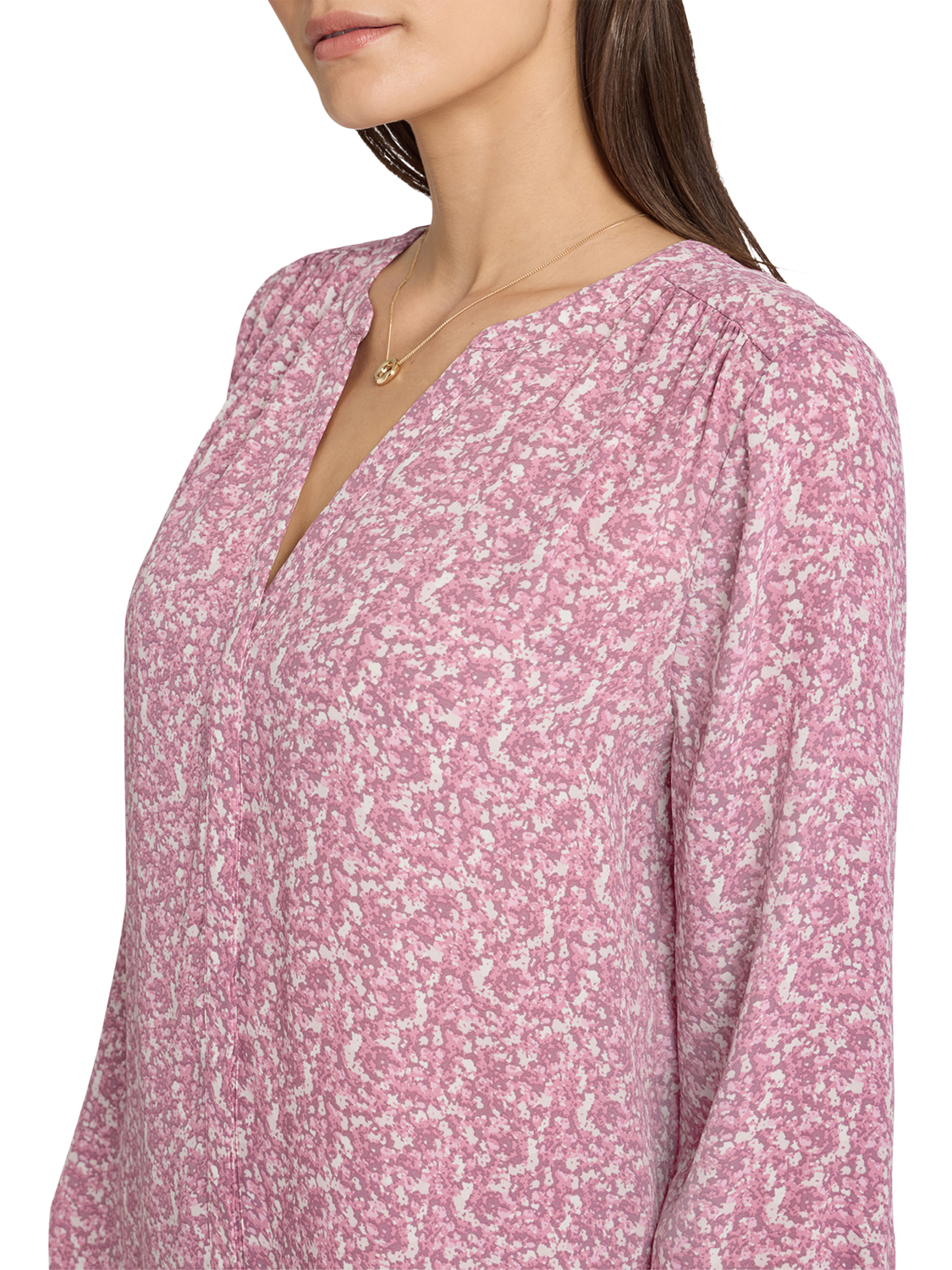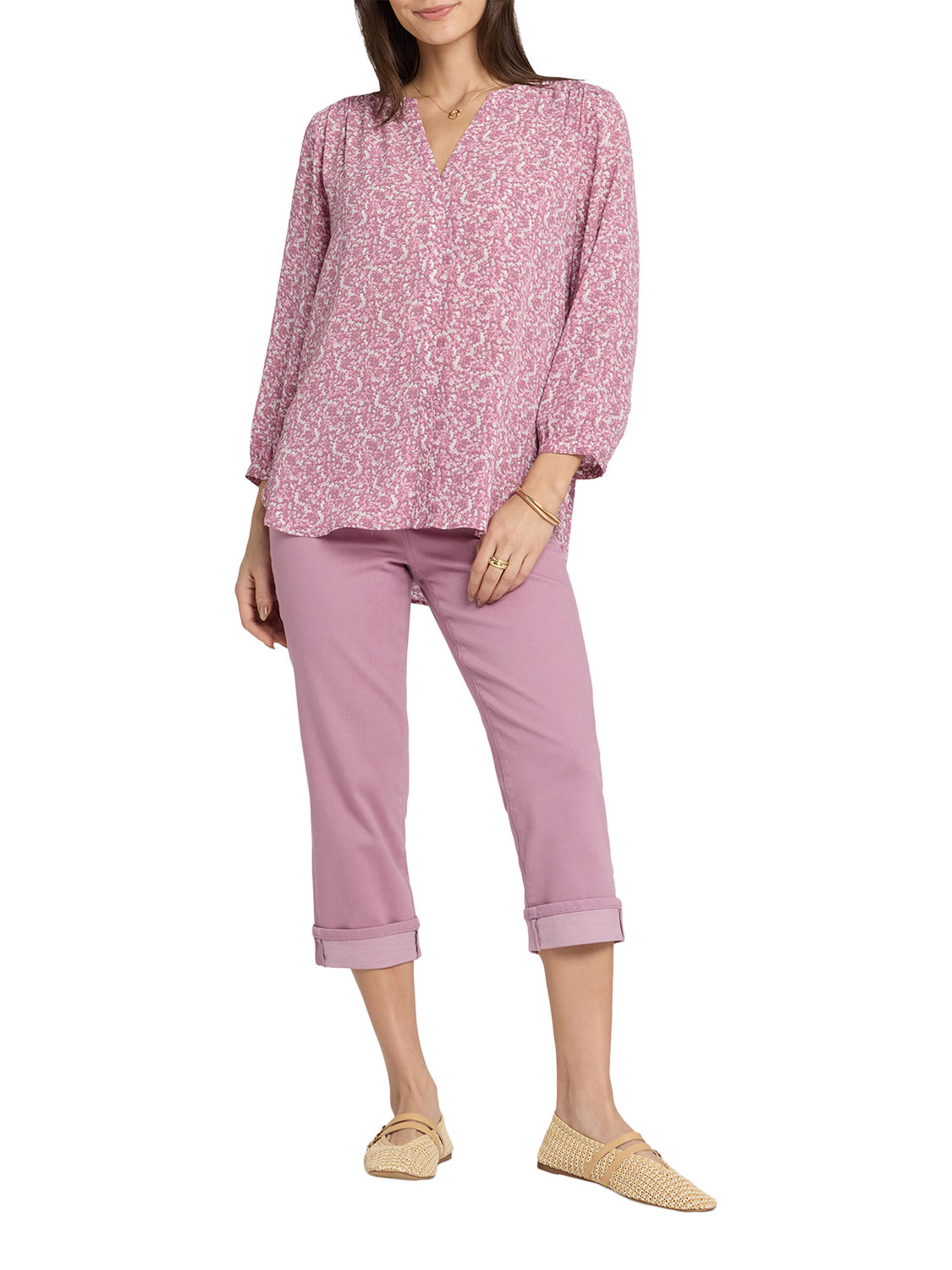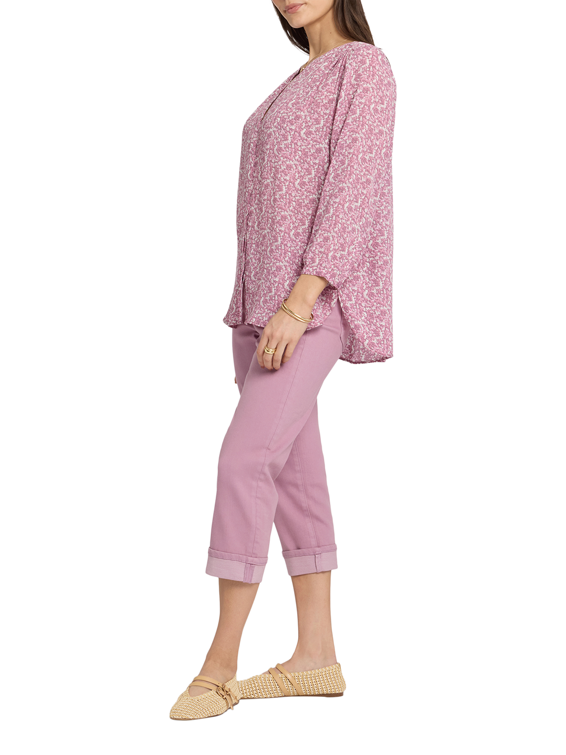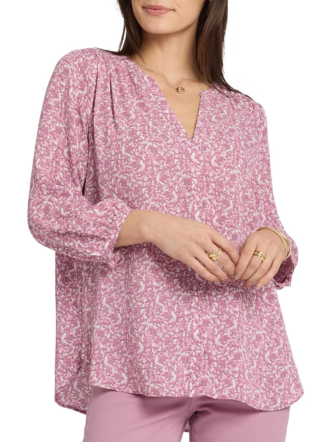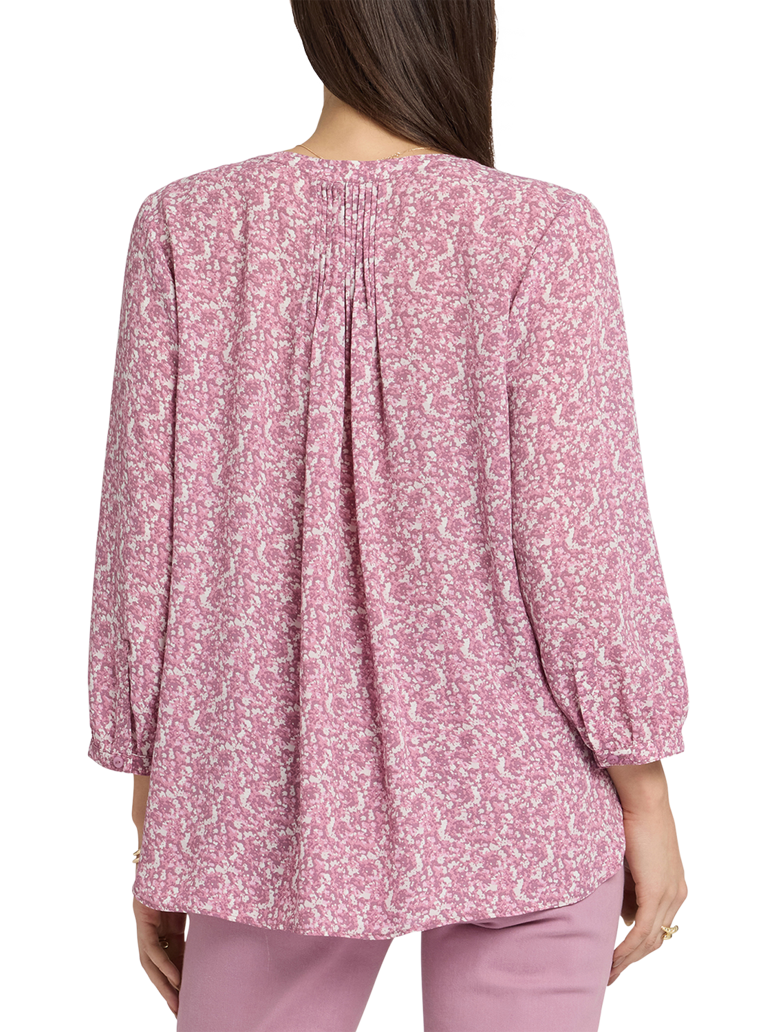 NYDJ's Pintuck Blouse has a billowy three-quarter-sleeved silhouette that's perfect when paired with any of our slimming denim styles. Pleating at the back yoke creates a sophisticated yet easy drape. Finished with a split round neckline, covered full front placket and button closures.
