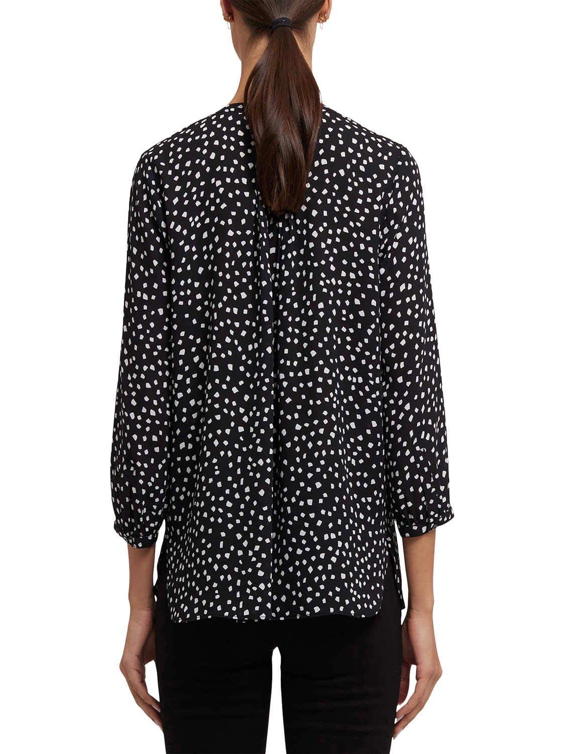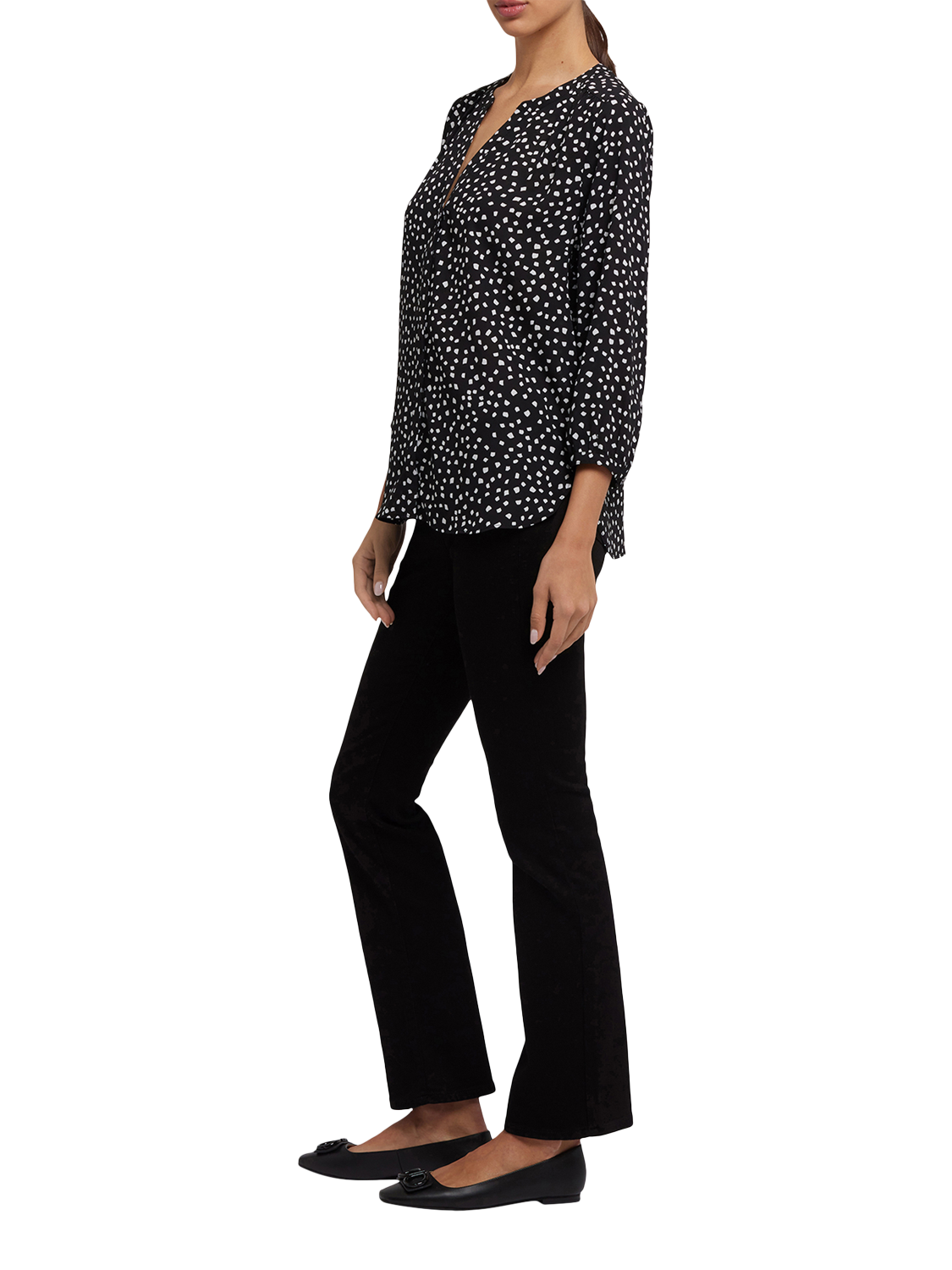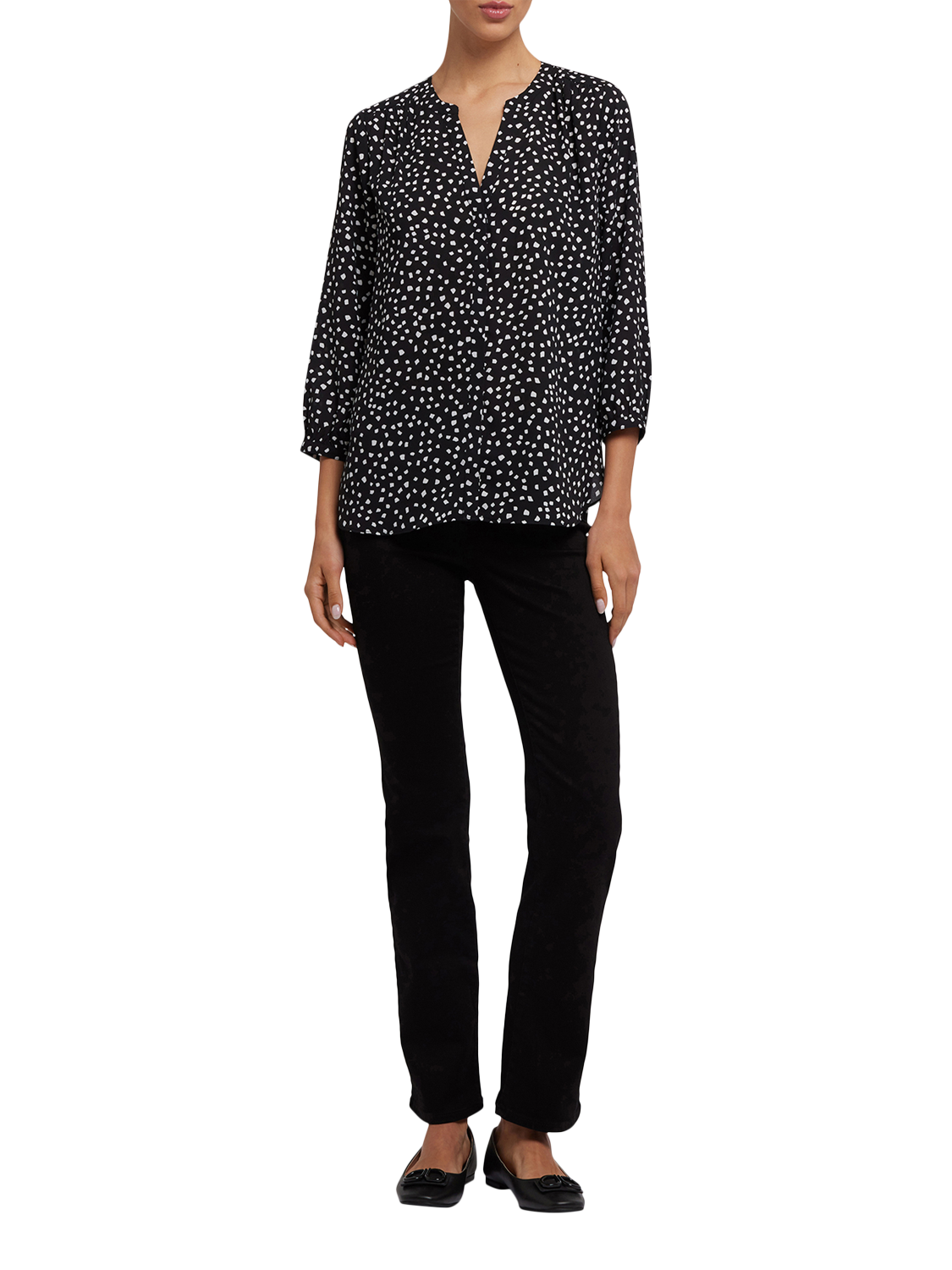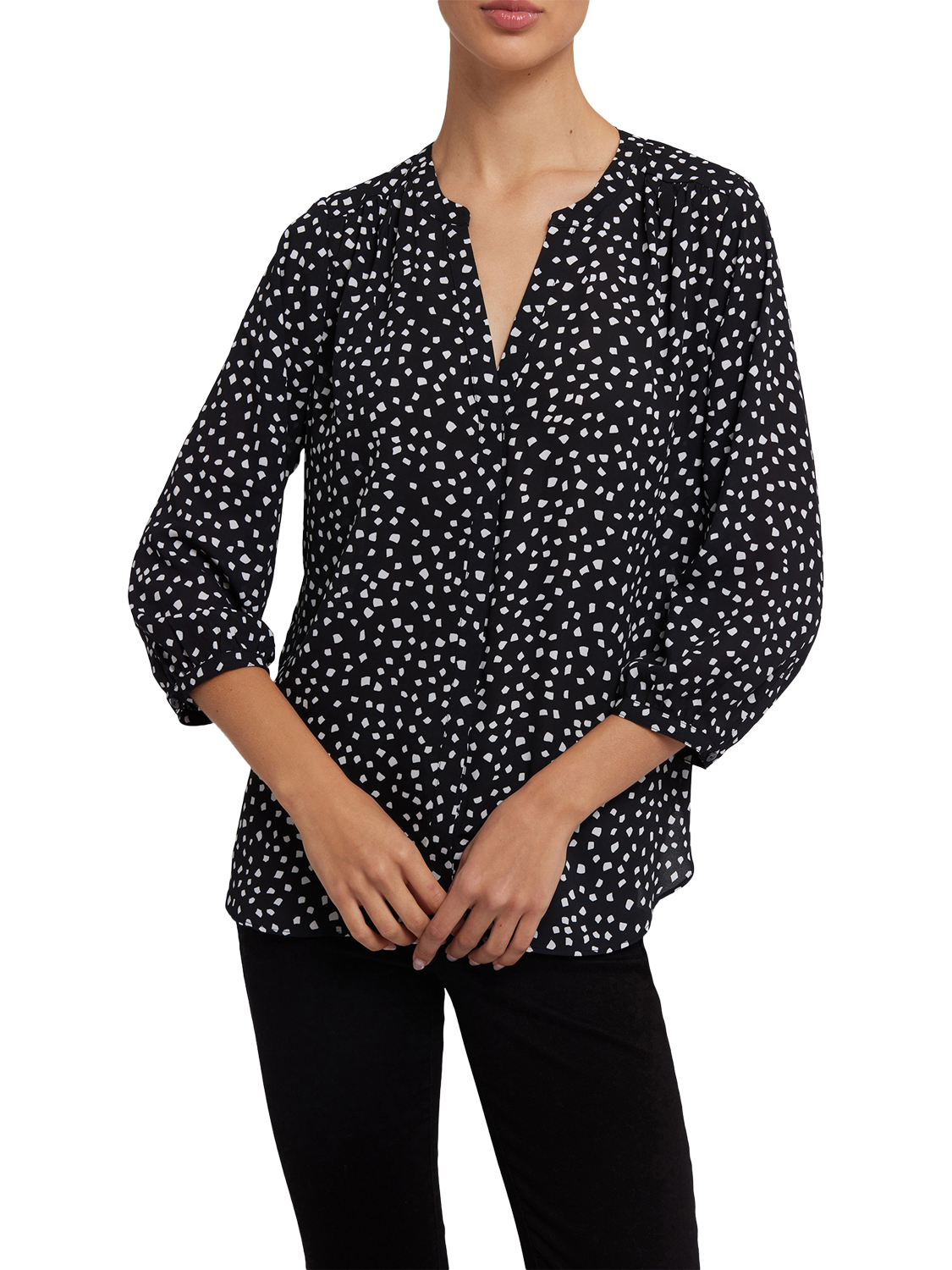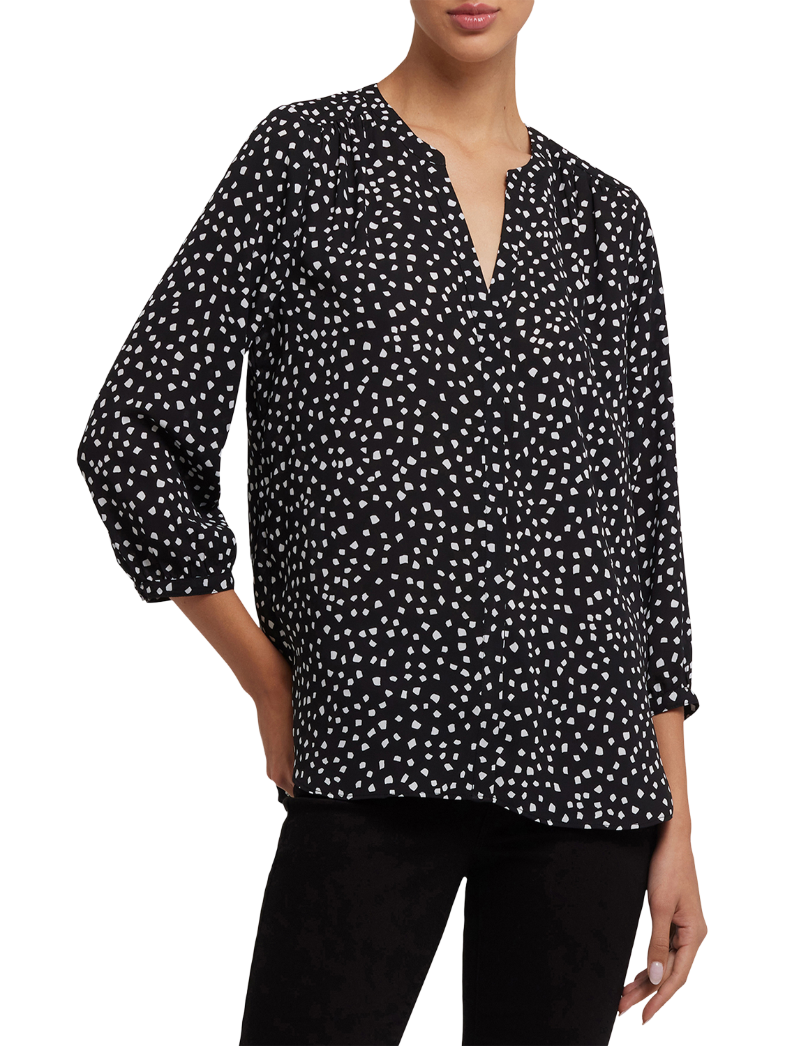 NYDJ's Pintuck Blouse has a billowy three-quarter-sleeved silhouette that's perfect when paired with any of our slimming denim styles. Pleating at the back yoke creates a sophisticated yet easy drape. Finished with a split round neckline, covered full front placket and button closures. This blouse's fabric is made with a sustainable polyester fibre created from 100% post-consumer plastic waste, resulting in less water and energy use and fewer greenhouse gas emissions without changing the look and feel of the fabric. The buttons are made with 50% post-consumer recycled polyester.