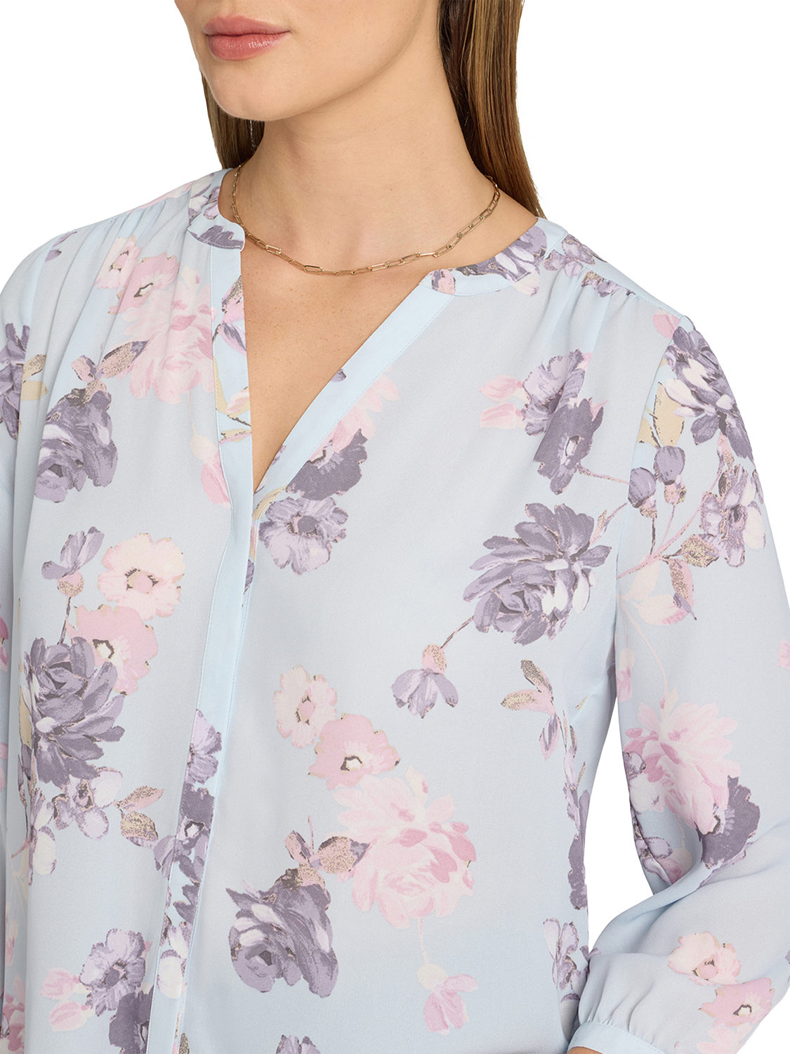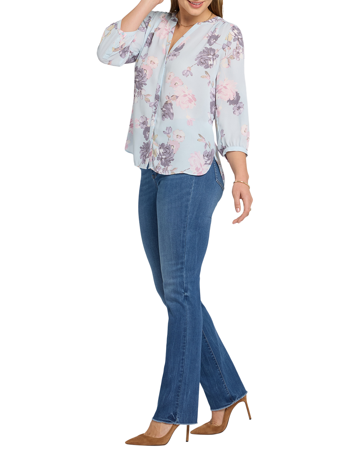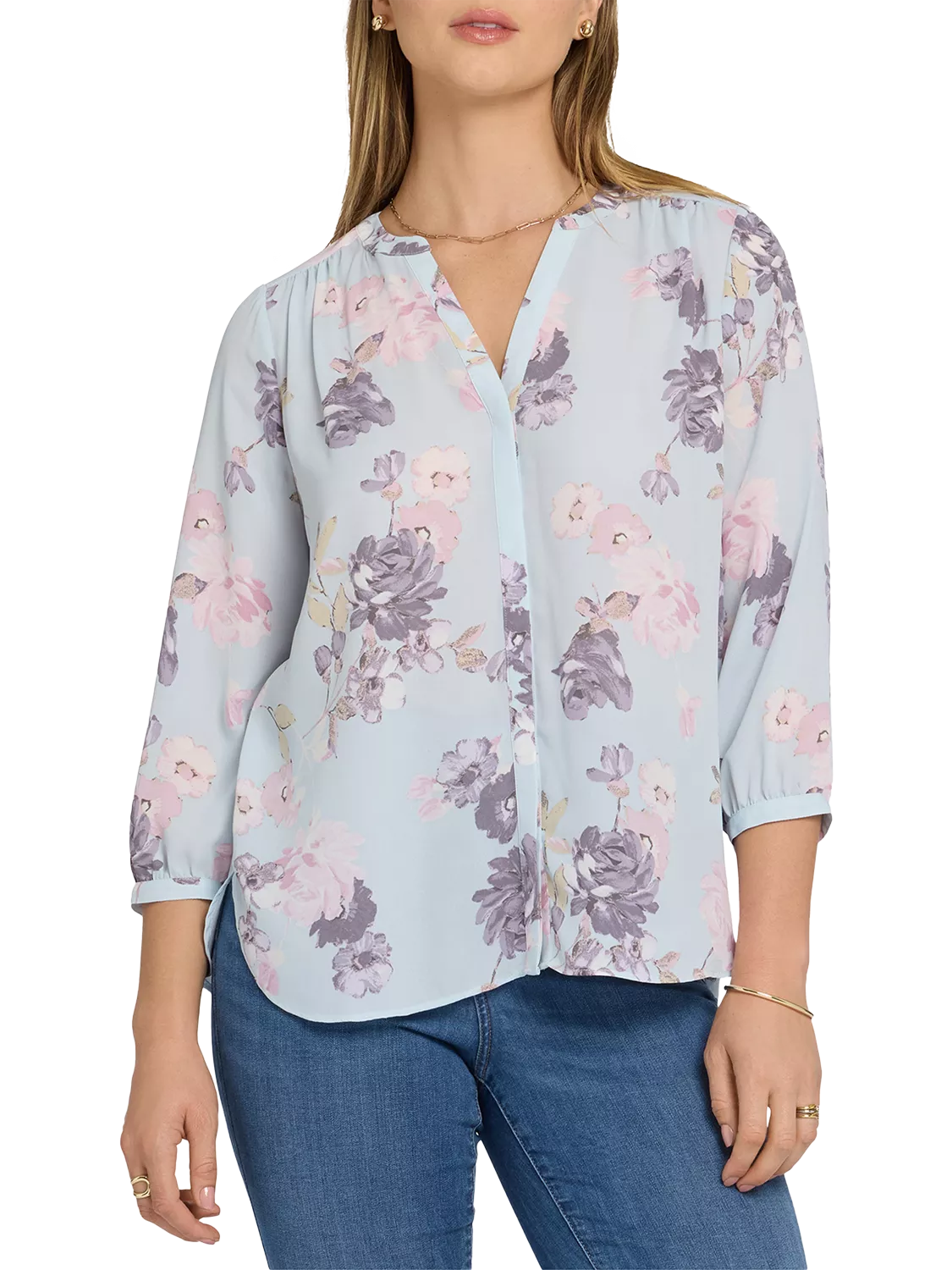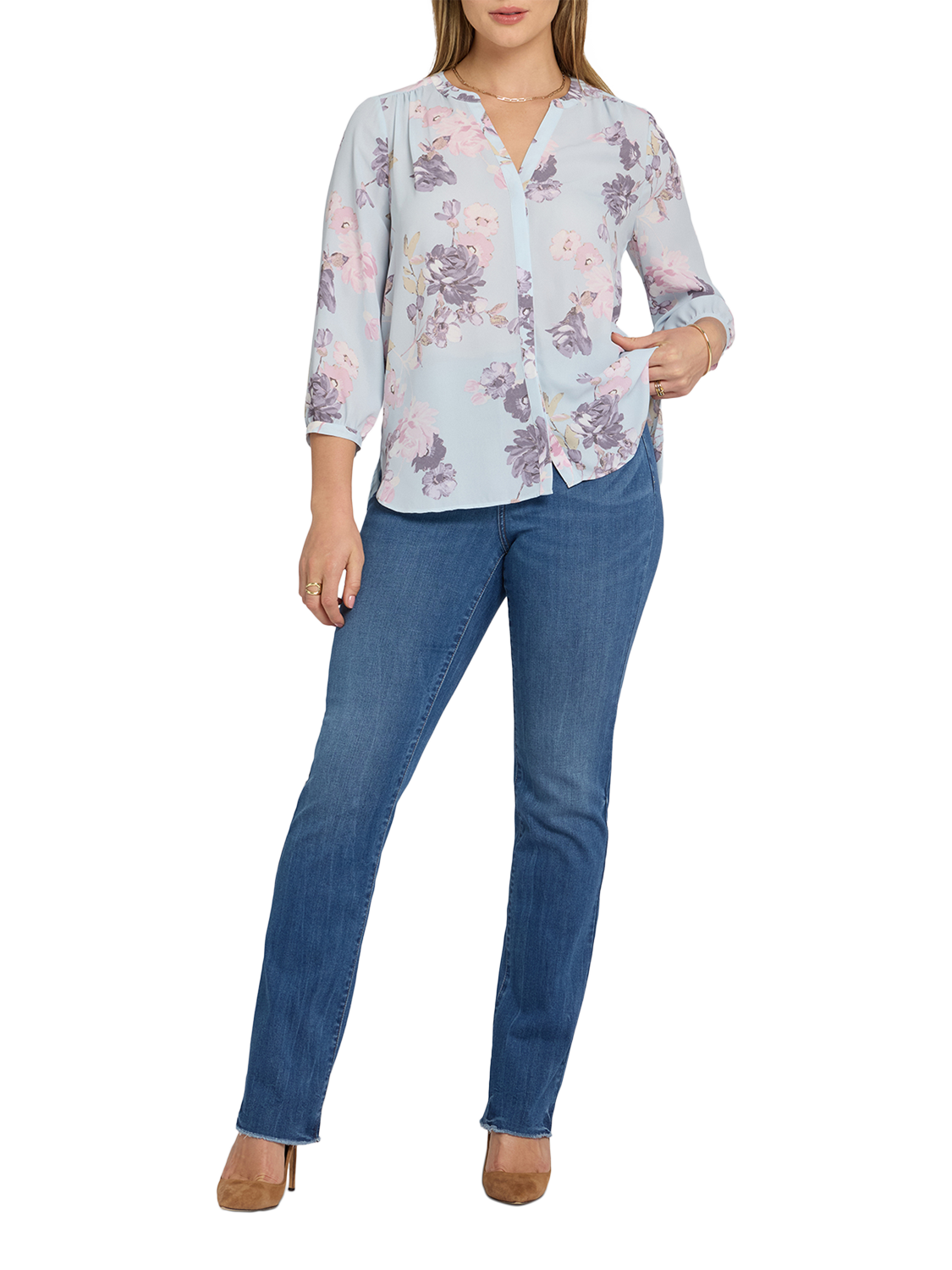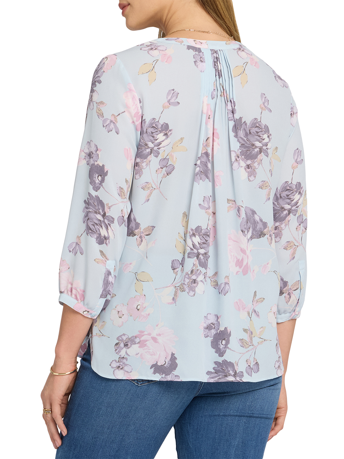 NYDJ's Pintuck Blouse has a billowy three-quarter-sleeved silhouette that's perfect when paired with any of our slimming denim styles. Pleating at the back yoke creates a sophisticated yet easy drape. Finished with a split round neckline, covered full front placket and button closures.