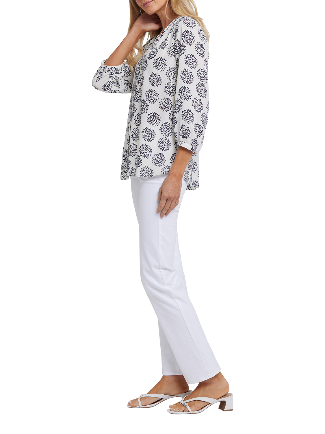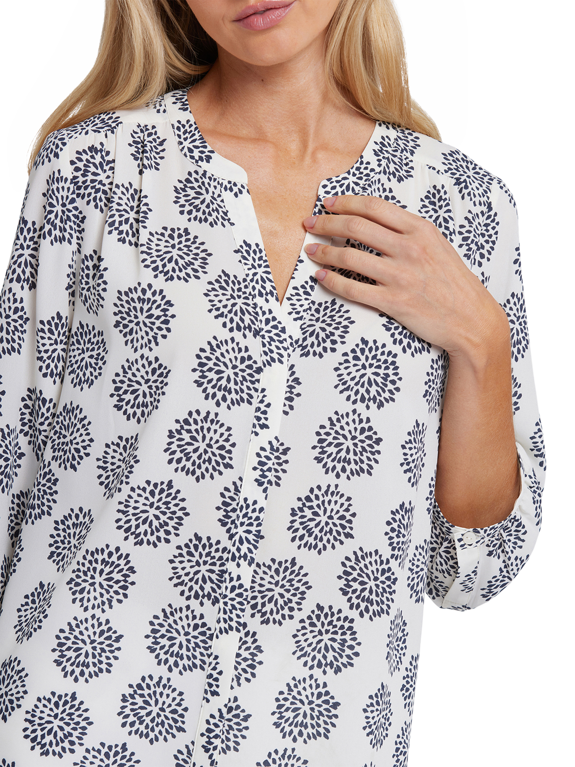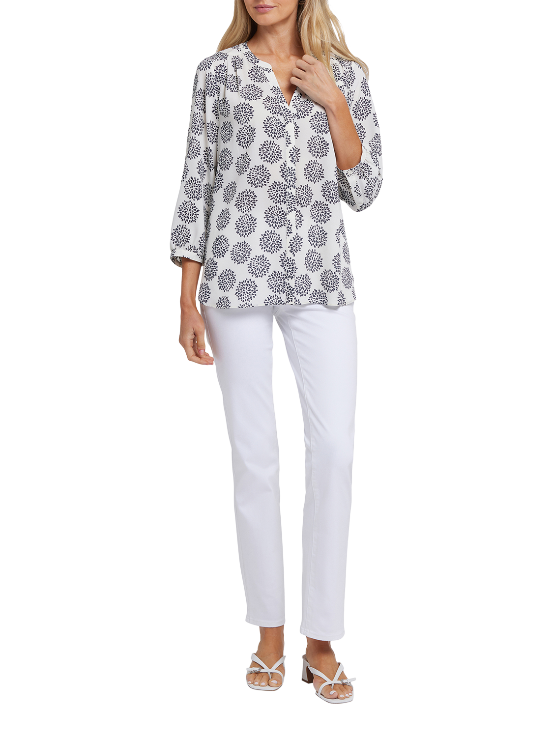 NYDJ's Pintuck Blouse boasts a billowy three-quarter-sleeved silhouette that's perfect when paired with denim styles. Pleating at the back yoke creates a sophisticated yet easy drape. Split round neckline with covered full front placket and button closures.