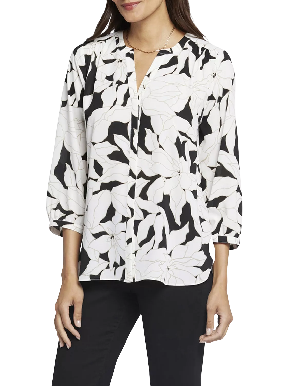 NYDJ's Pintuck Blouse boasts a billowy three-quarter-sleeved silhouette that's perfect when paired with denim styles. Pleating at the back yoke creates a sophisticated yet easy drape. Split round neckline with covered full front placket and button closures.