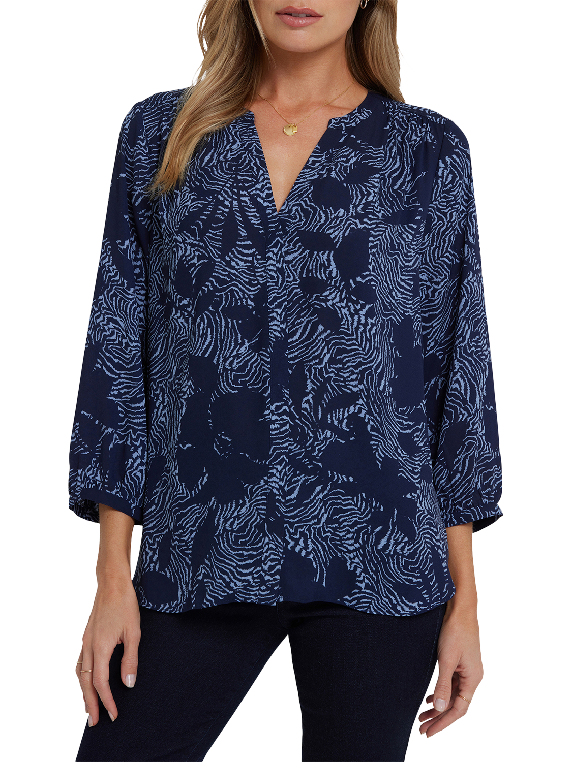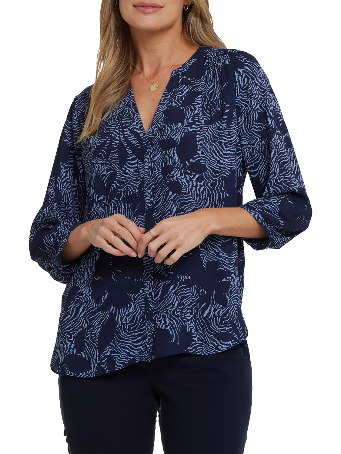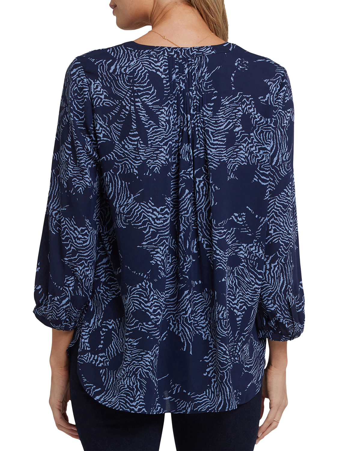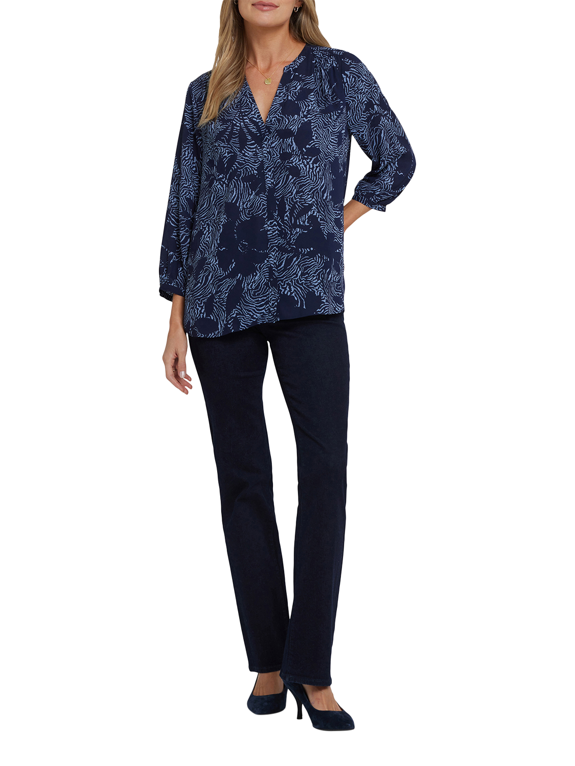 NYDJ's Pintuck Blouse has a billowy three-quarter-sleeved silhouette that's perfect when paired with any of our slimming denim styles. Pleating at the back yoke creates a sophisticated yet easy drape. Finished with a split round neckline, covered full front placket and button closures. This blouse's fabric is made with a sustainable polyester fibre created from 100% post-consumer plastic waste, resulting in less water and energy use and fewer greenhouse gas emissions without changing the look and feel of the fabric. The buttons are made with 50% post-consumer recycled polyester.