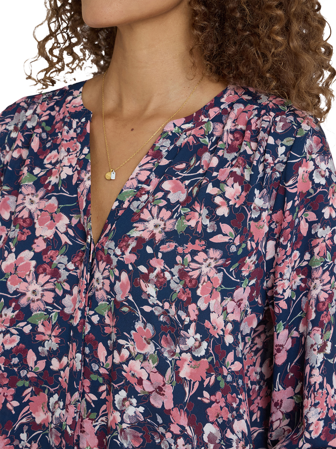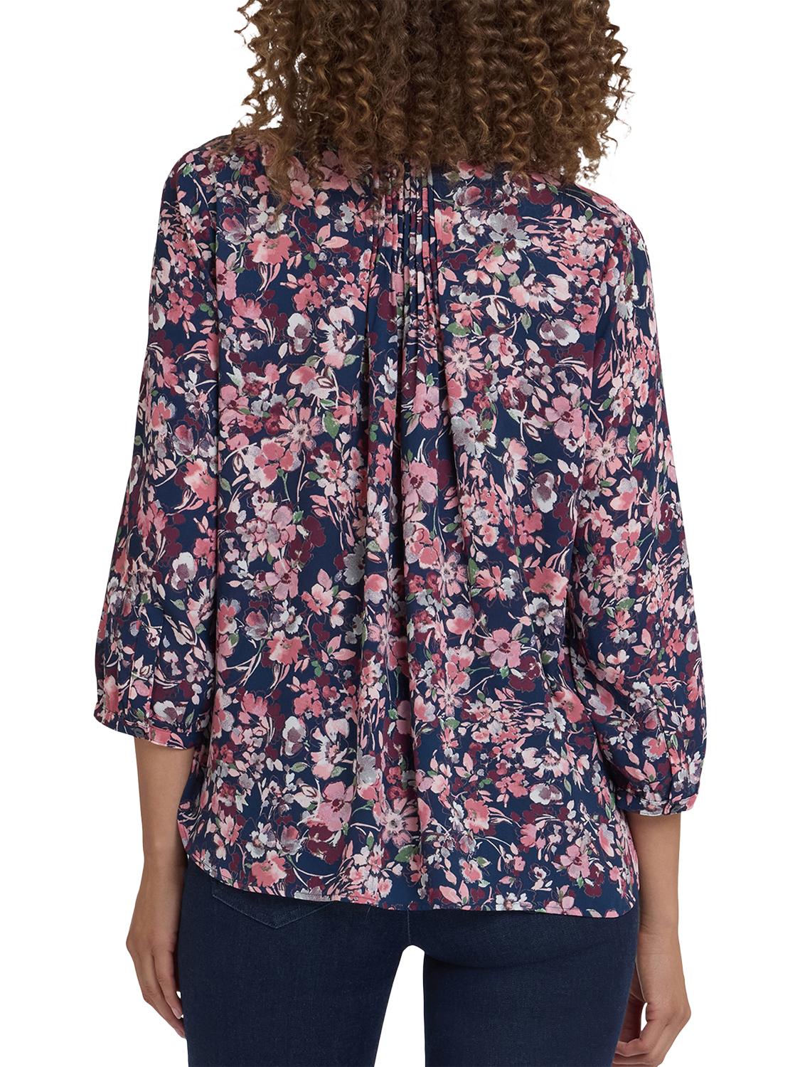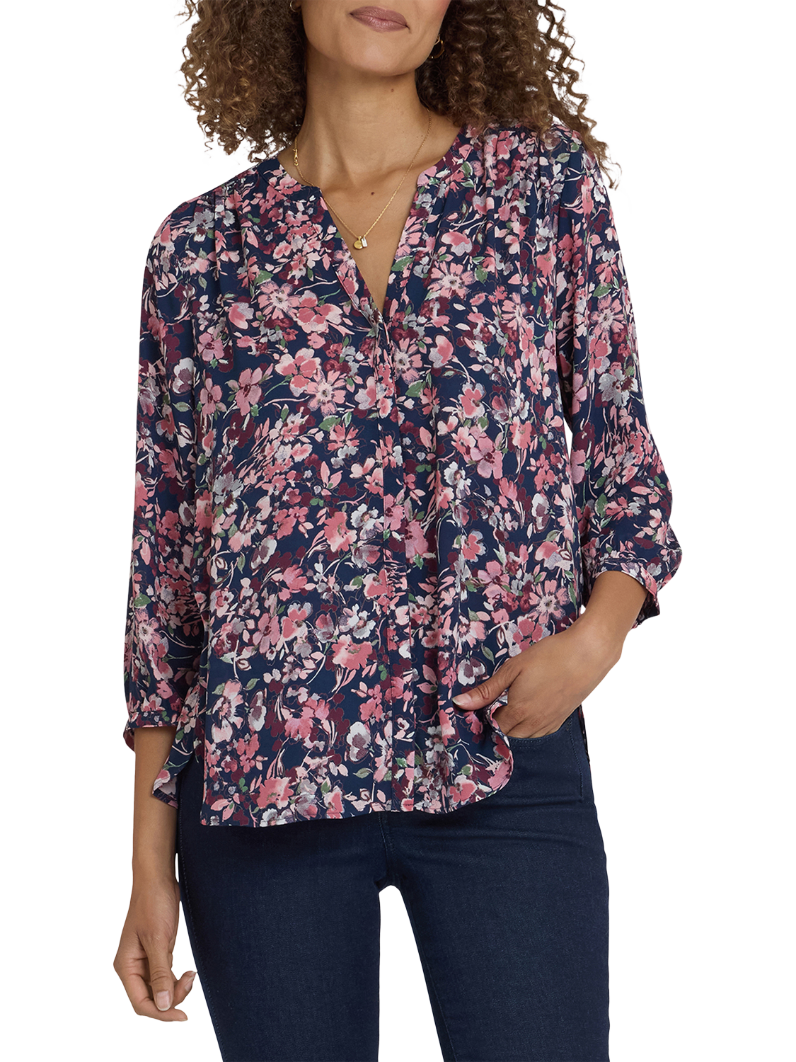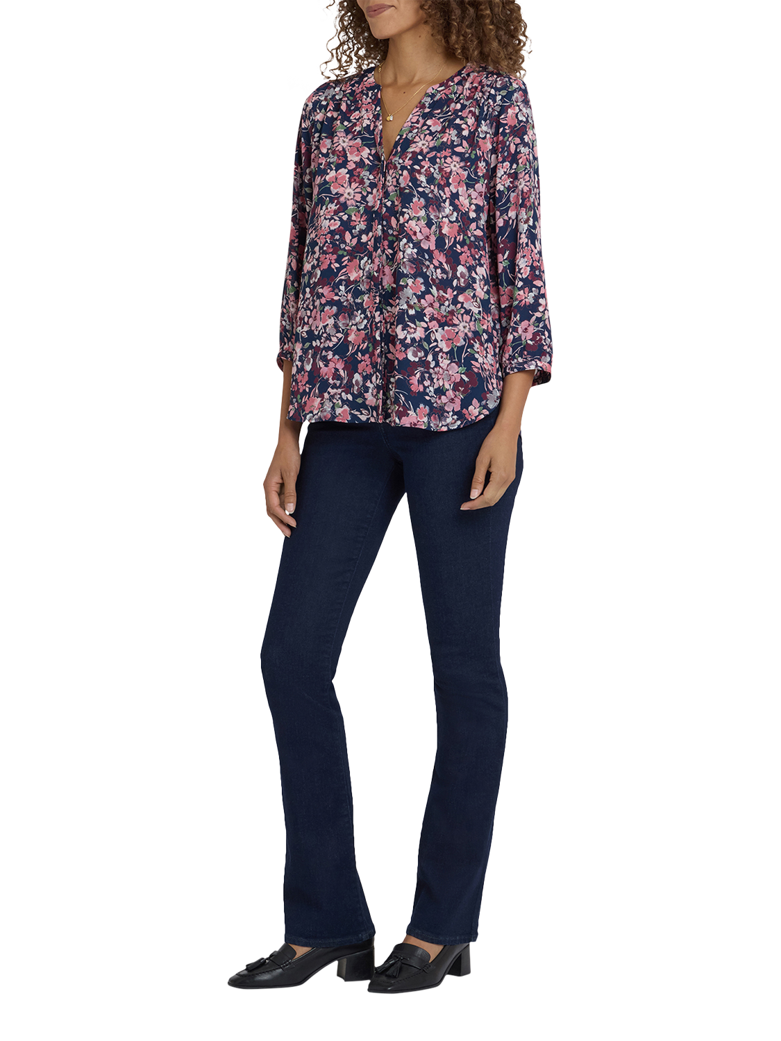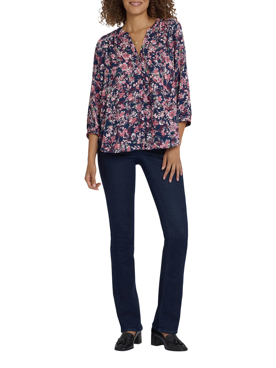 NYDJ's Pintuck Blouse has a billowy three-quarter-sleeved silhouette that's perfect when paired with any of our slimming denim styles. Pleating at the back yoke creates a sophisticated yet easy drape. Finished with a split round neckline, covered full front placket and button closures. This blouse's fabric is made with a sustainable polyester fibre created from 100% post-consumer plastic waste, resulting in less water and energy use and fewer greenhouse gas emissions without changing the look and feel of the fabric. The buttons are made with 50% post-consumer recycled polyester.