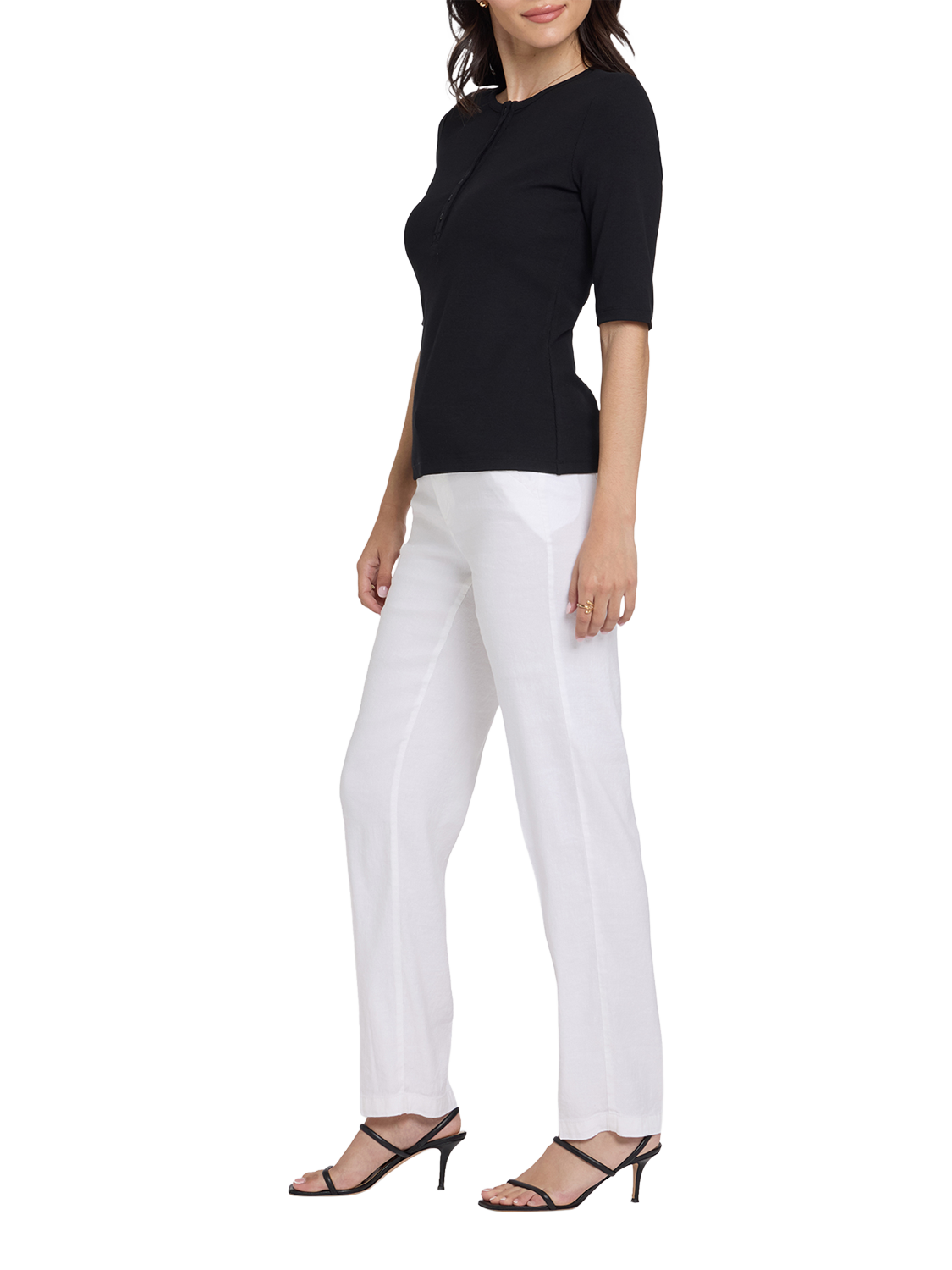 Comfort and versatility make NYDJ's Ribbed Elbow Sleeved Henley a wardrobe must-have. It feels fabulous in a viscose-cotton blend and has a classic yet feminine look with a scoop neckline, elbow sleeves and a front button placket.