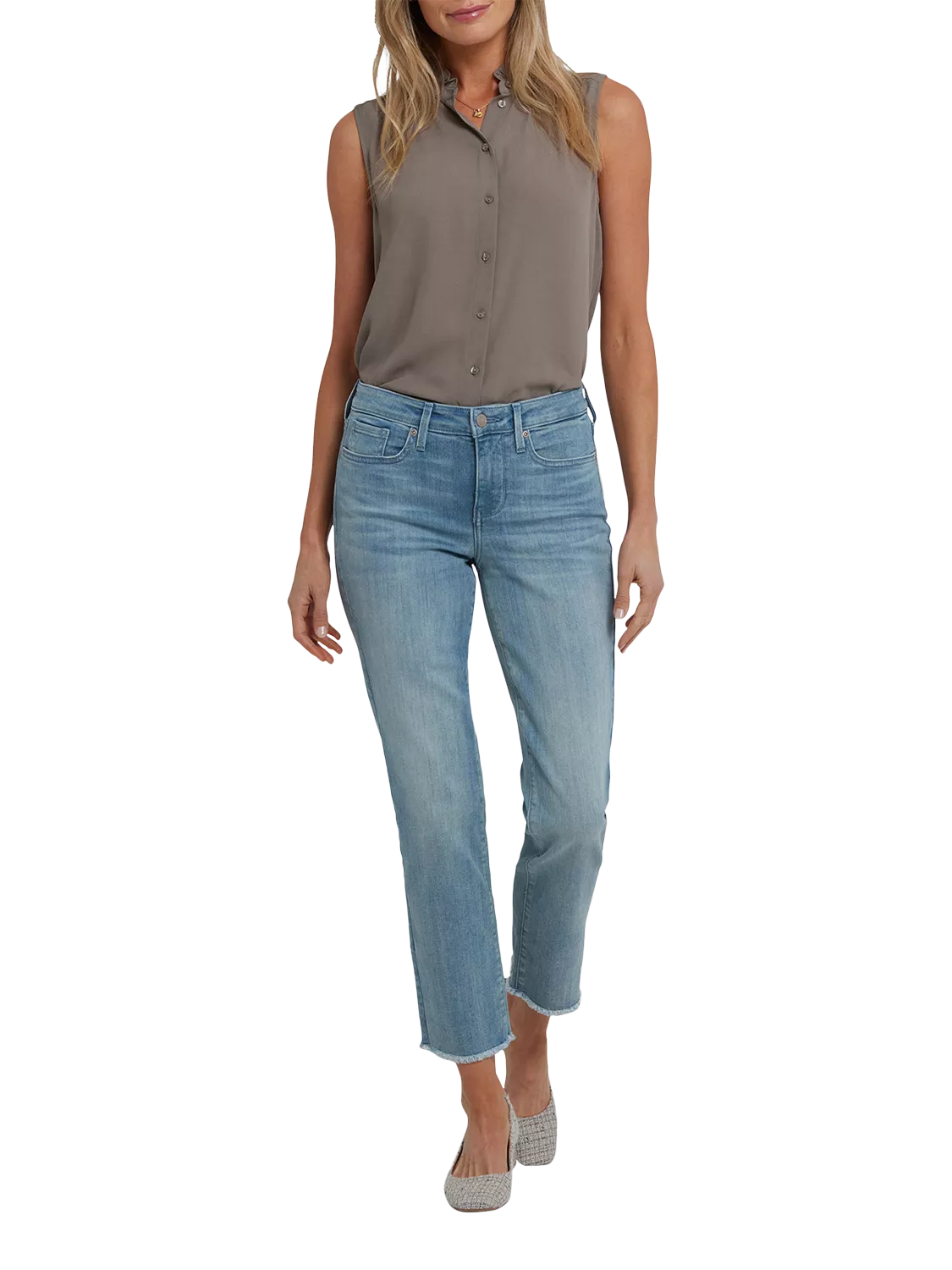 Between skinny and straight, you'll find the perfect body-hugging slim fit in NYDJ’s Sheri Slim Ankle Jeans with Frayed Hems. Enhance your assets and streamline your silhouette with our signature Lift Tuck® Technology, which flattens and flatters using a proprietary slimming panel with a patented criss-cross design. Features frayed hems, classic five-pocket styling, zip fly and button closure. Light Paradise is a light indigo wash with a slight tint that creates a warm vintage cast as well as whiskers and soft sanding for a worn-in look.