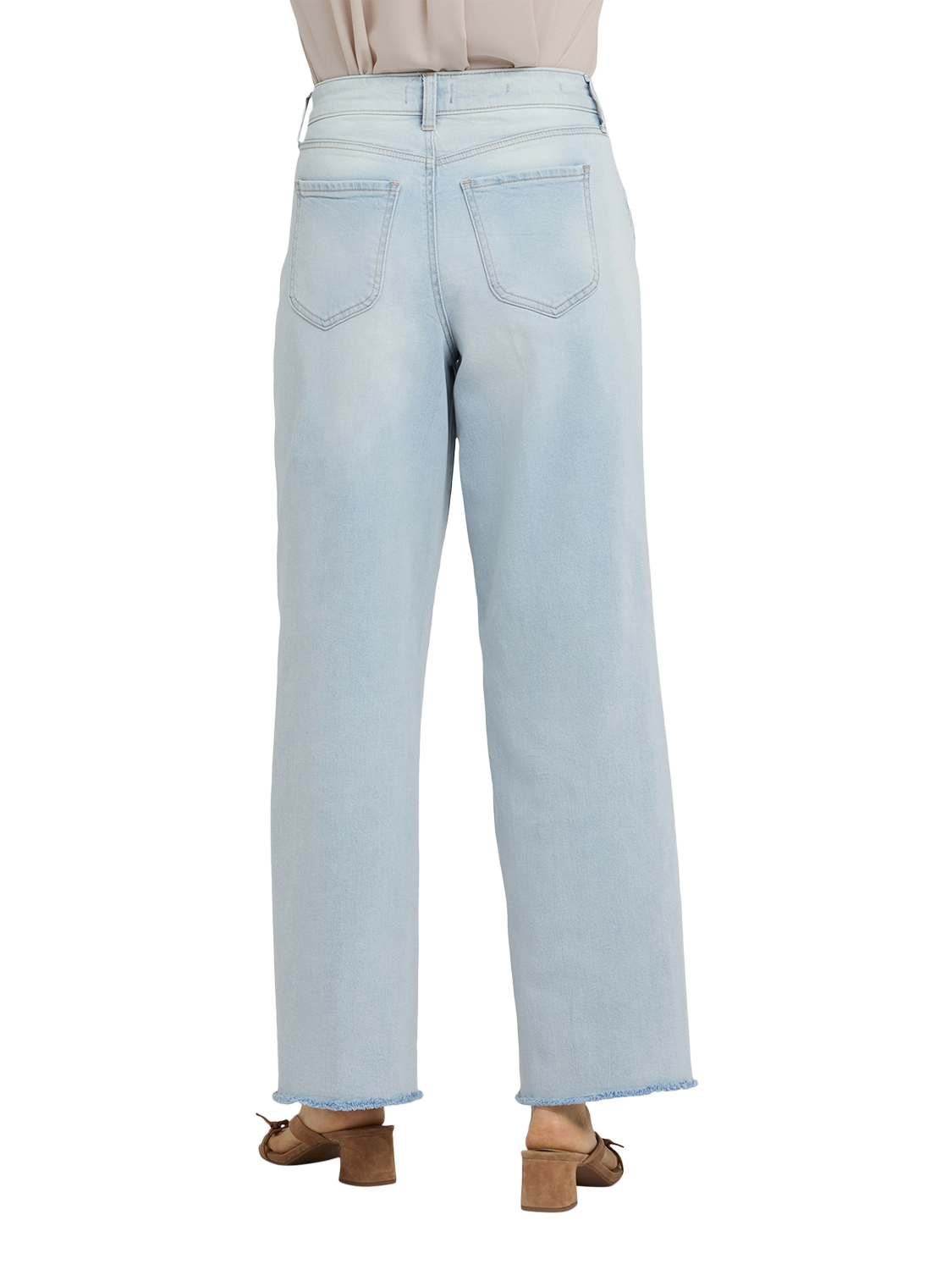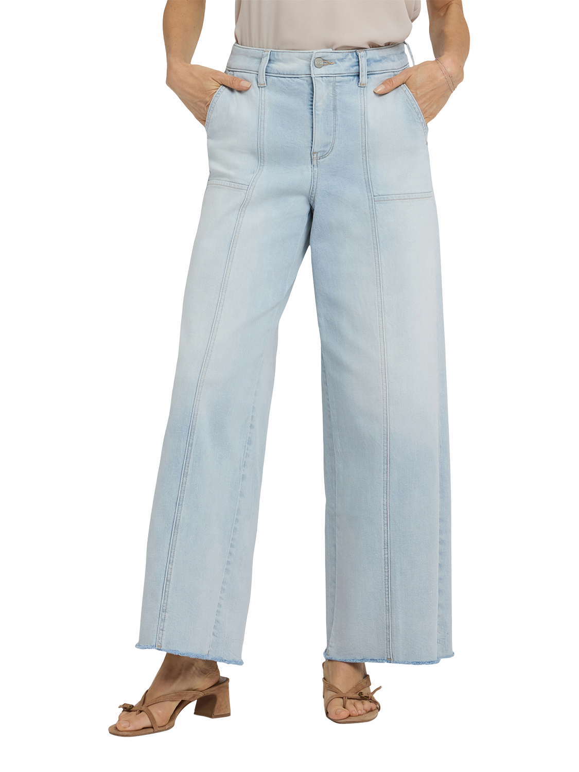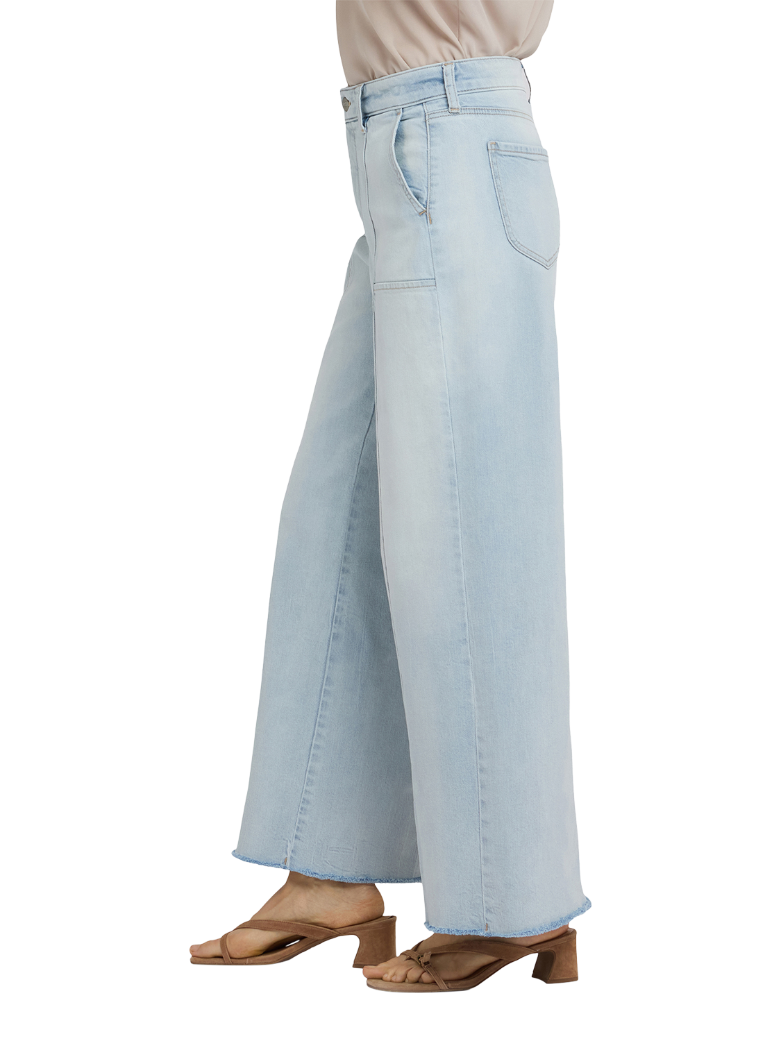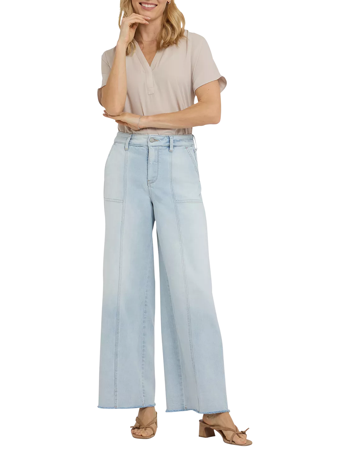 Add bold style to your denim collection with the Simone Wide Leg Jeans by NYDJ. Smooth through the waist and relaxed through the thigh with a full wide leg, the silhouette elongates and flatters. Front utility pockets and seaming bring on-trend edge to the design. Finished with back patch pockets, zip fly, button closure, and raw hems. Salton is a medium-dark indigo wash with subtle texture that gives it a worn-in look and feel. This jean is made with earth-friendly methods that result in reduced consumption of water, chemicals, and/or energy.