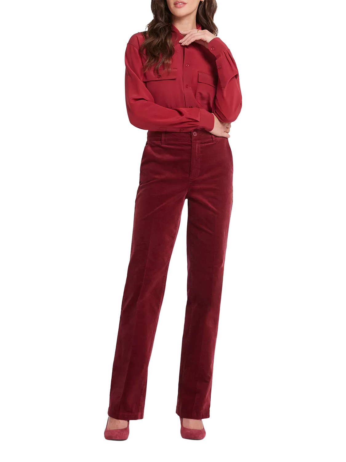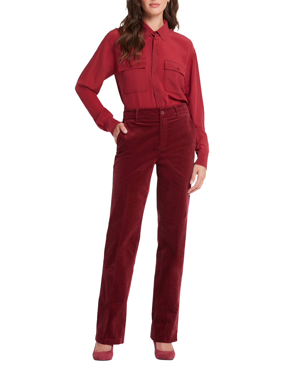 Make NYDJ's Straight Leg Trousers the foundation of all your cosy Autumn / Winter looks. Their styling, with front slash pockets, back welt pockets and pressed leg creases, gives them a polished appearance, while their velveteen fabric with a little stretch keeps them soft and comfortable. Our signature Lift Tuck® Technology also keeps them streamlined and flattering using a proprietary slimming panel with a patented criss-cross design. Finished with a zip fly and button closure and back shaping darts.
