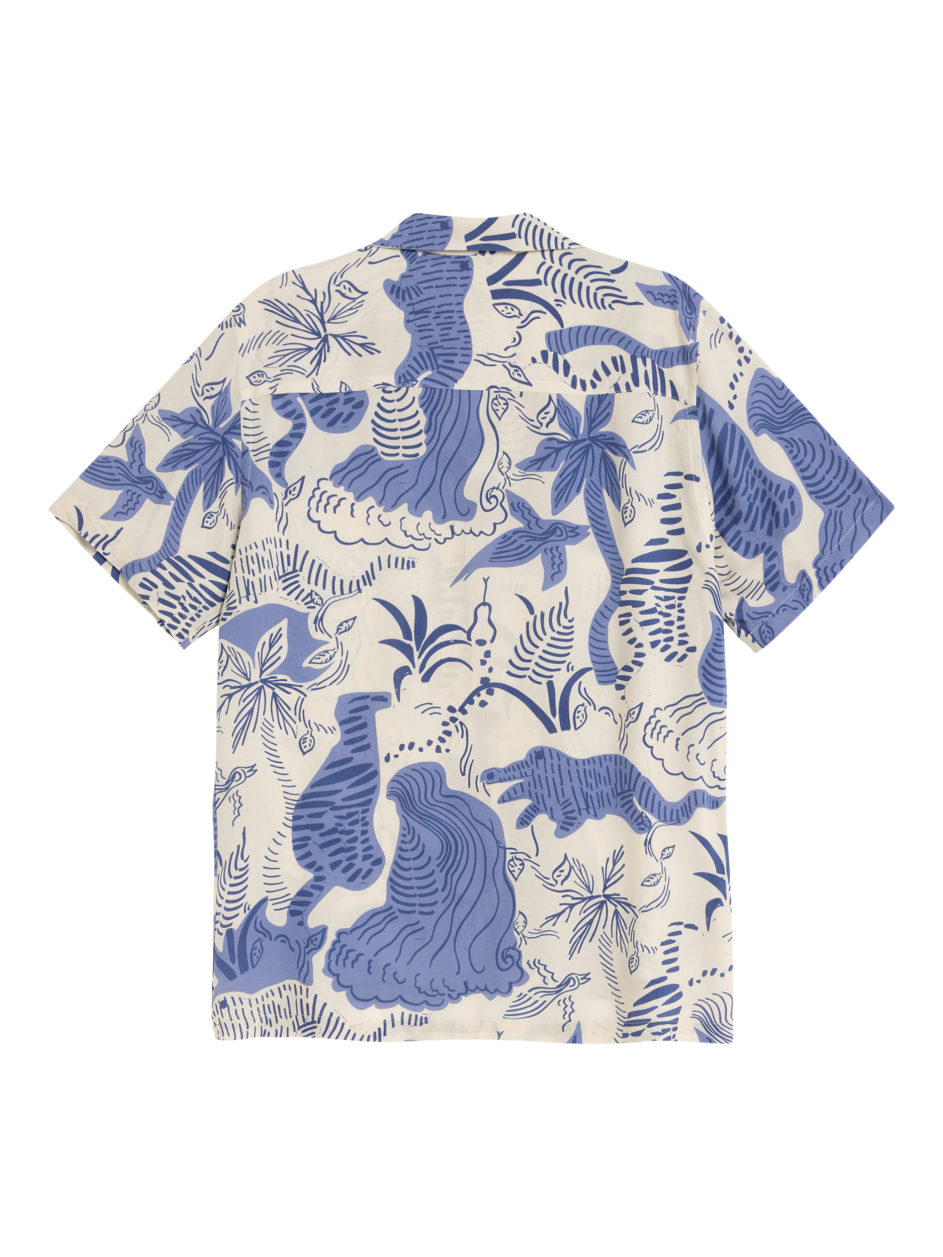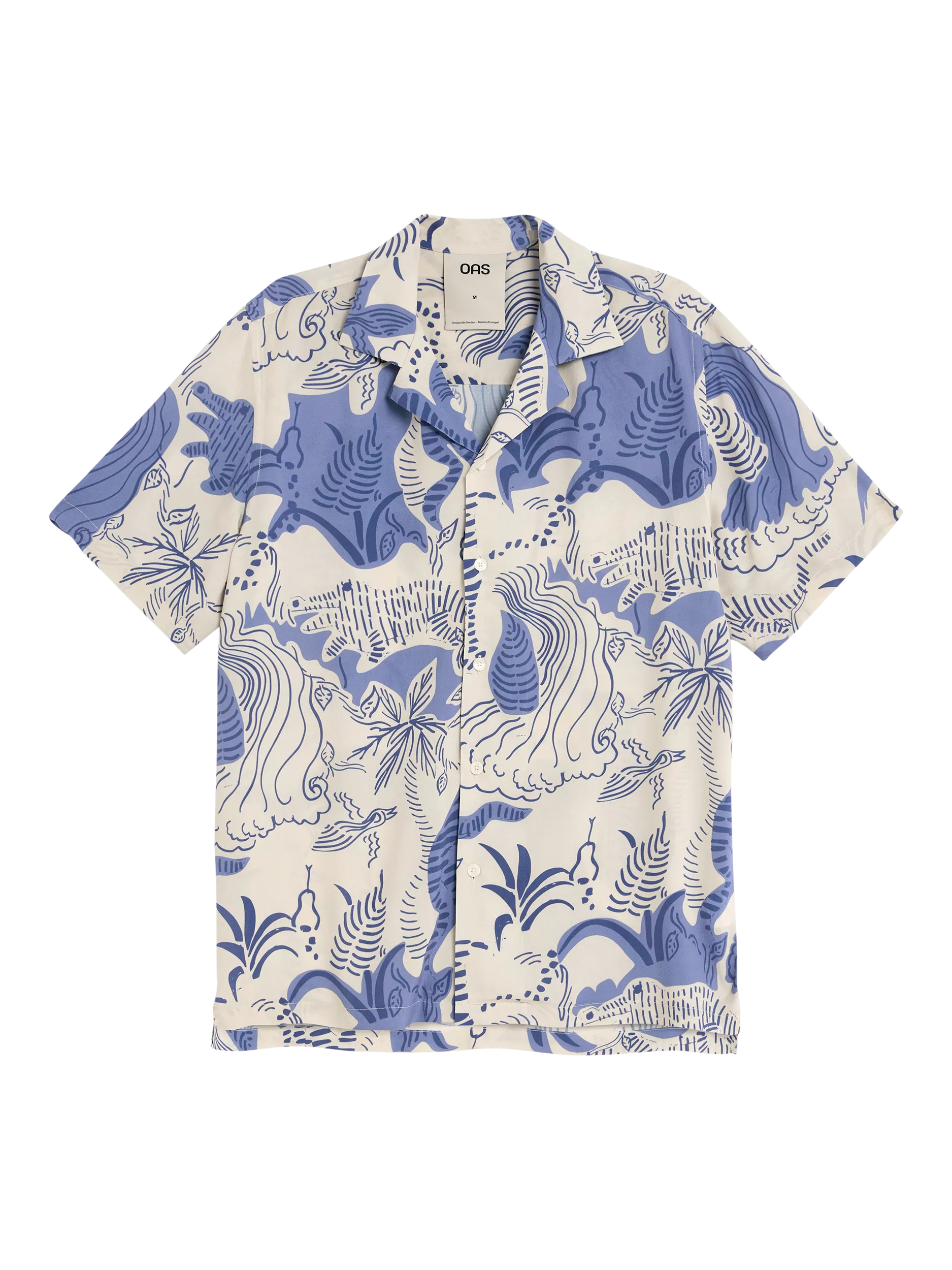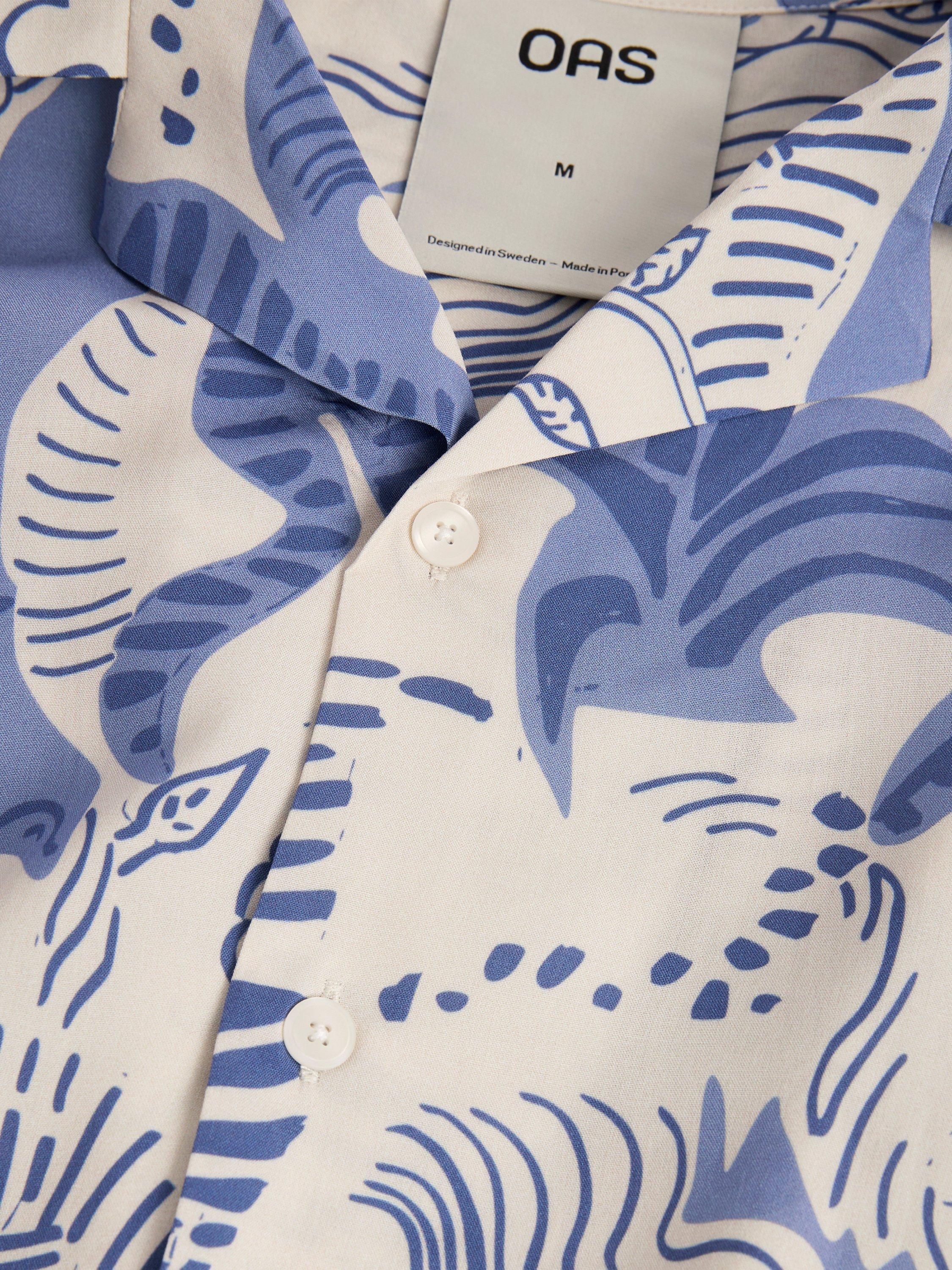 Blue and white short sleeved lightweight viscose shirt. With a pattern reminiscing the tropic beach. Silky, breathable fabric with soft drape. Relaxed fit with slightly dropped shoulders.