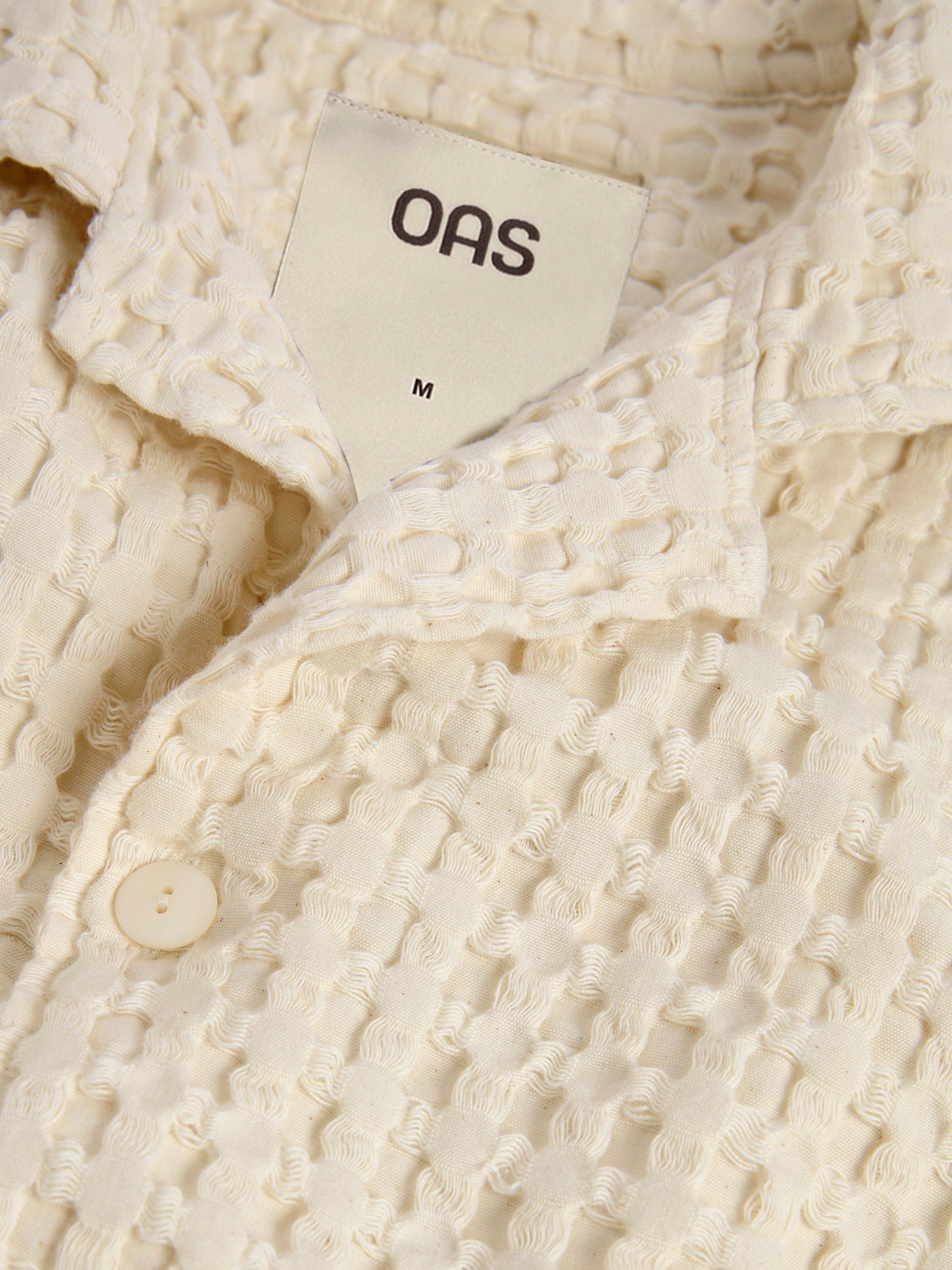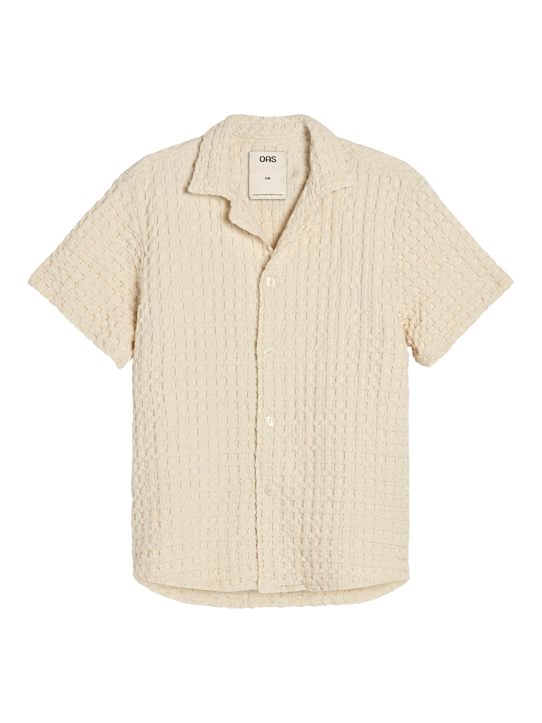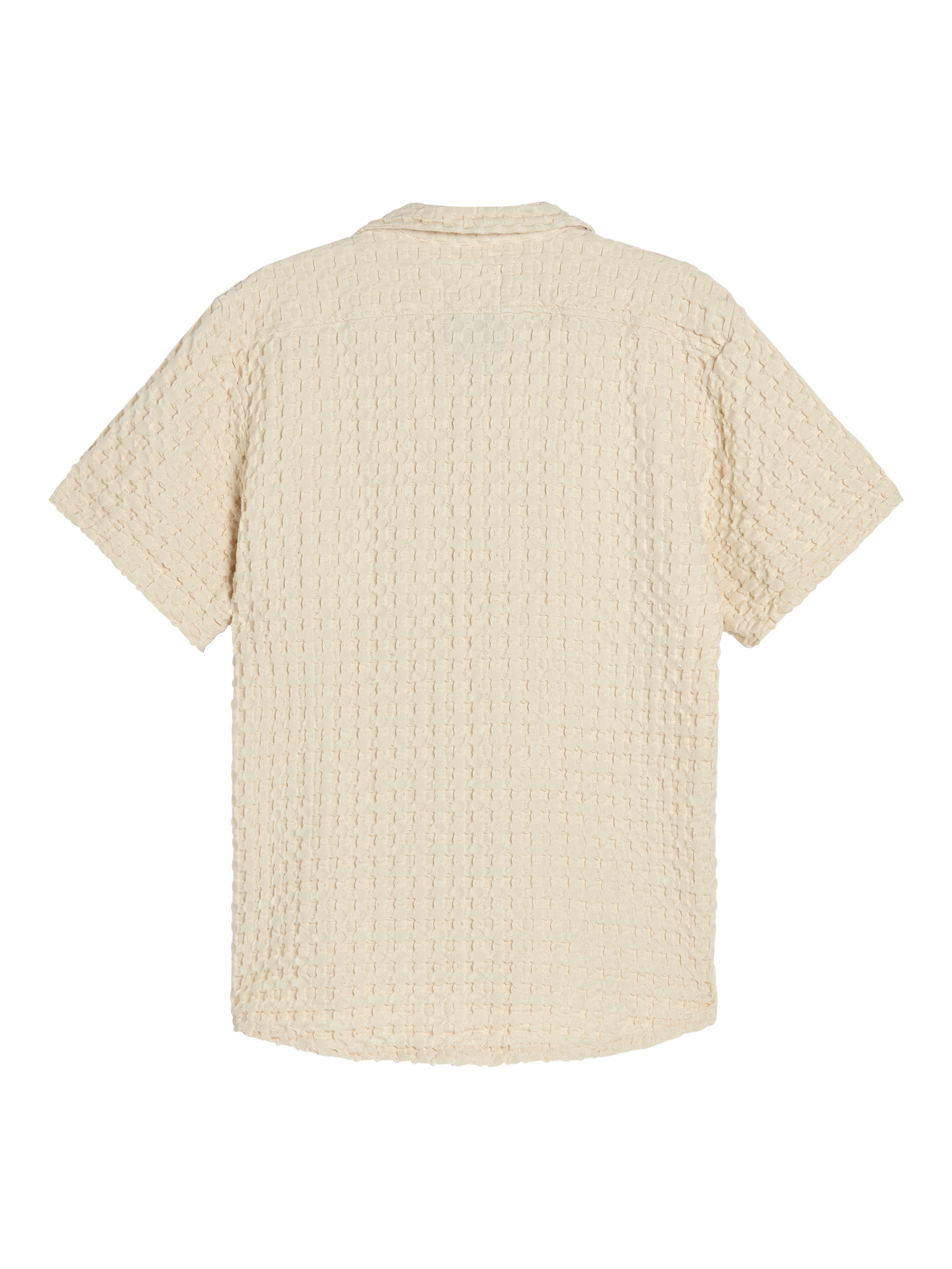 Beige waffle-weave cotton shirt with resort collar and curved hemline. Relaxed fit with textured surface and dropped shoulders.