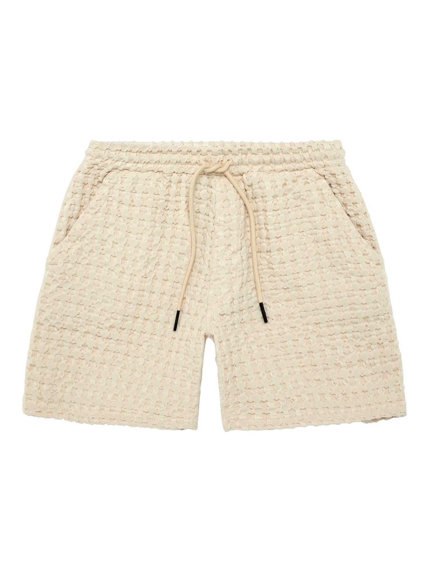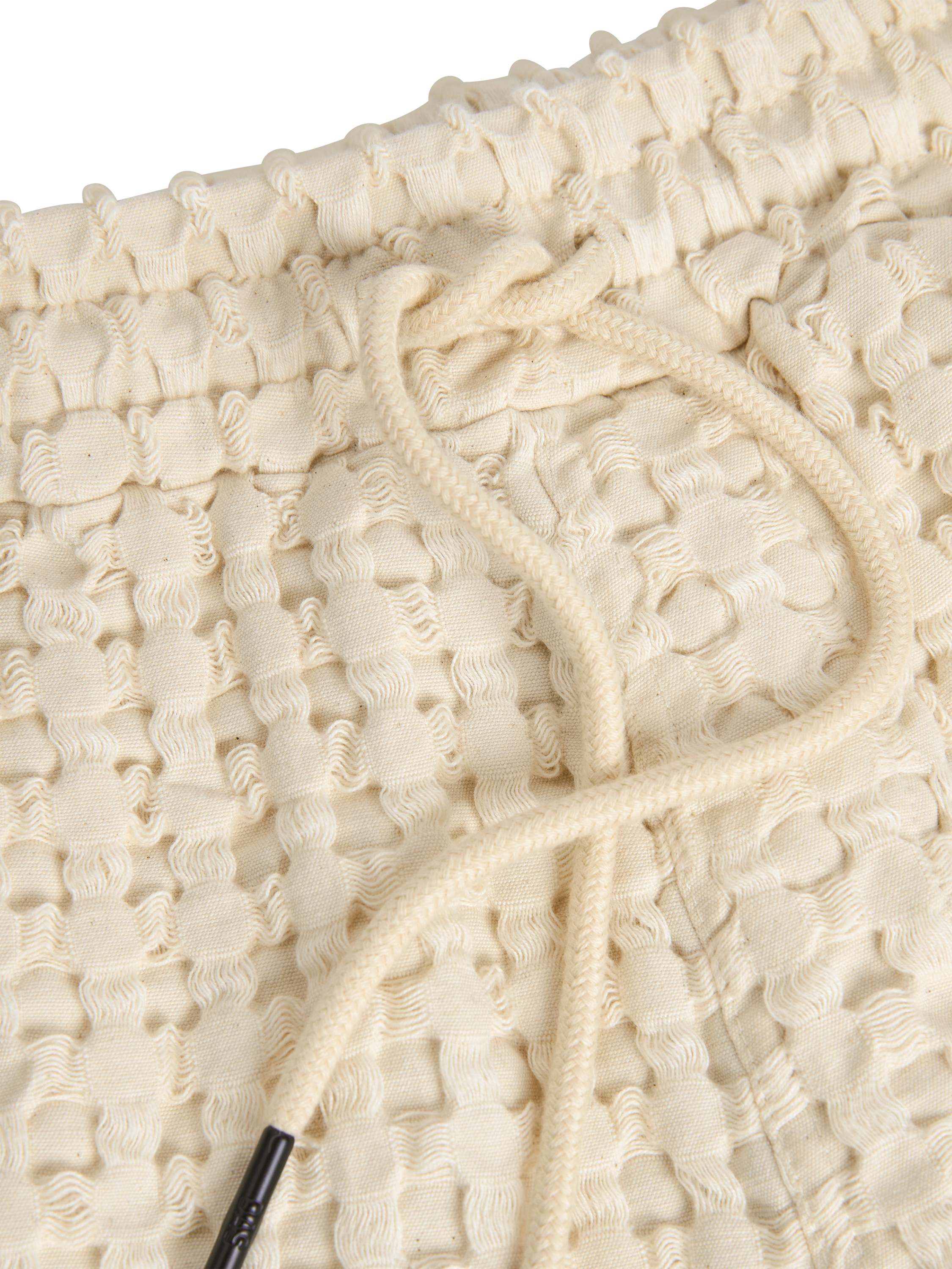 Undyed shorts in heavyweight cotton waffle-weave. Elastic waist with drawstring, two slanted side pockets and one back welt pocket. Regular fit and mid-rise.
