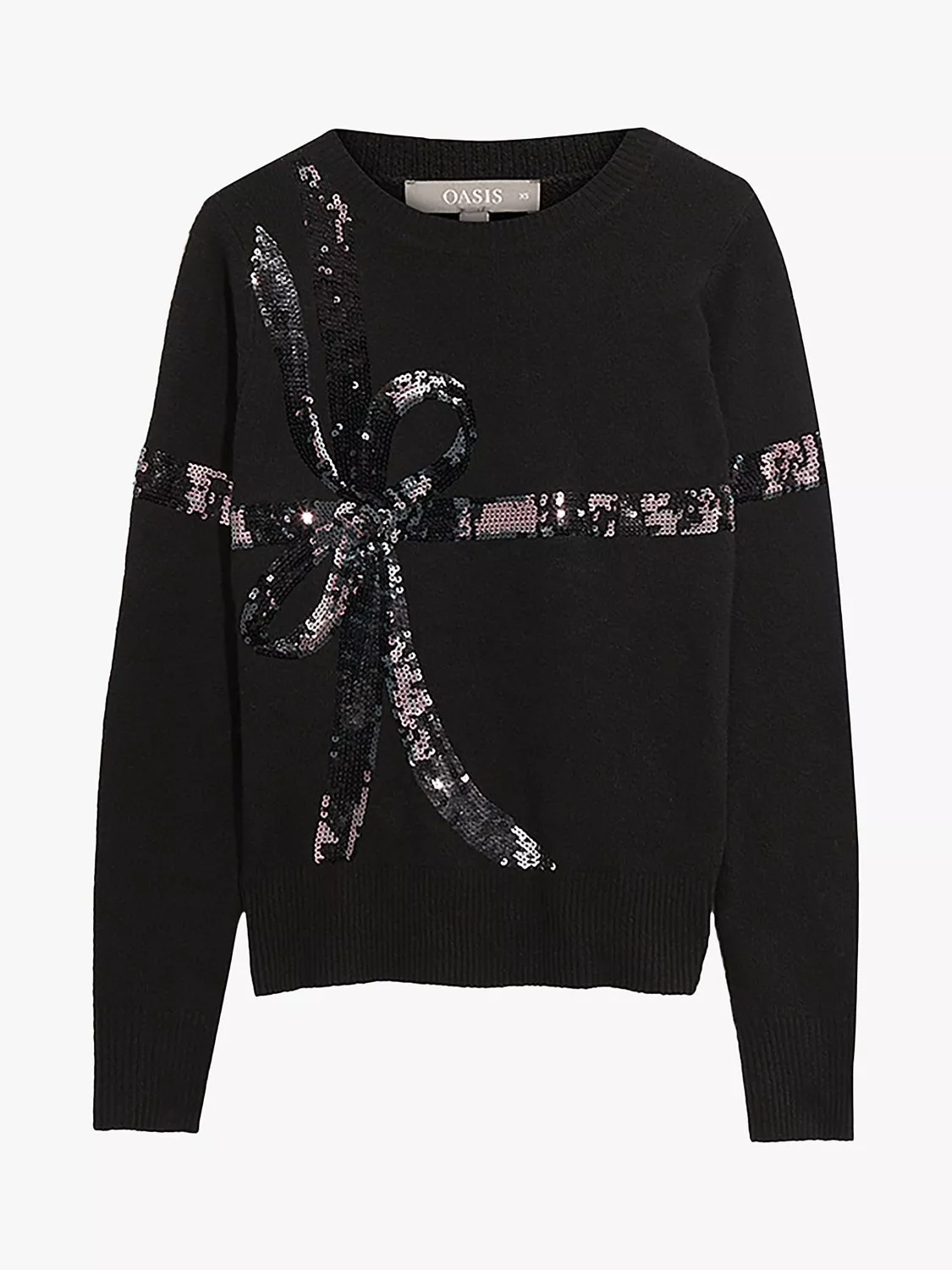Featuring a beautifully embellished sequin bow and cut to a relaxed fit with a round neckline, this piece is ideal for pairing over jeans and boots on those chilly festive days.