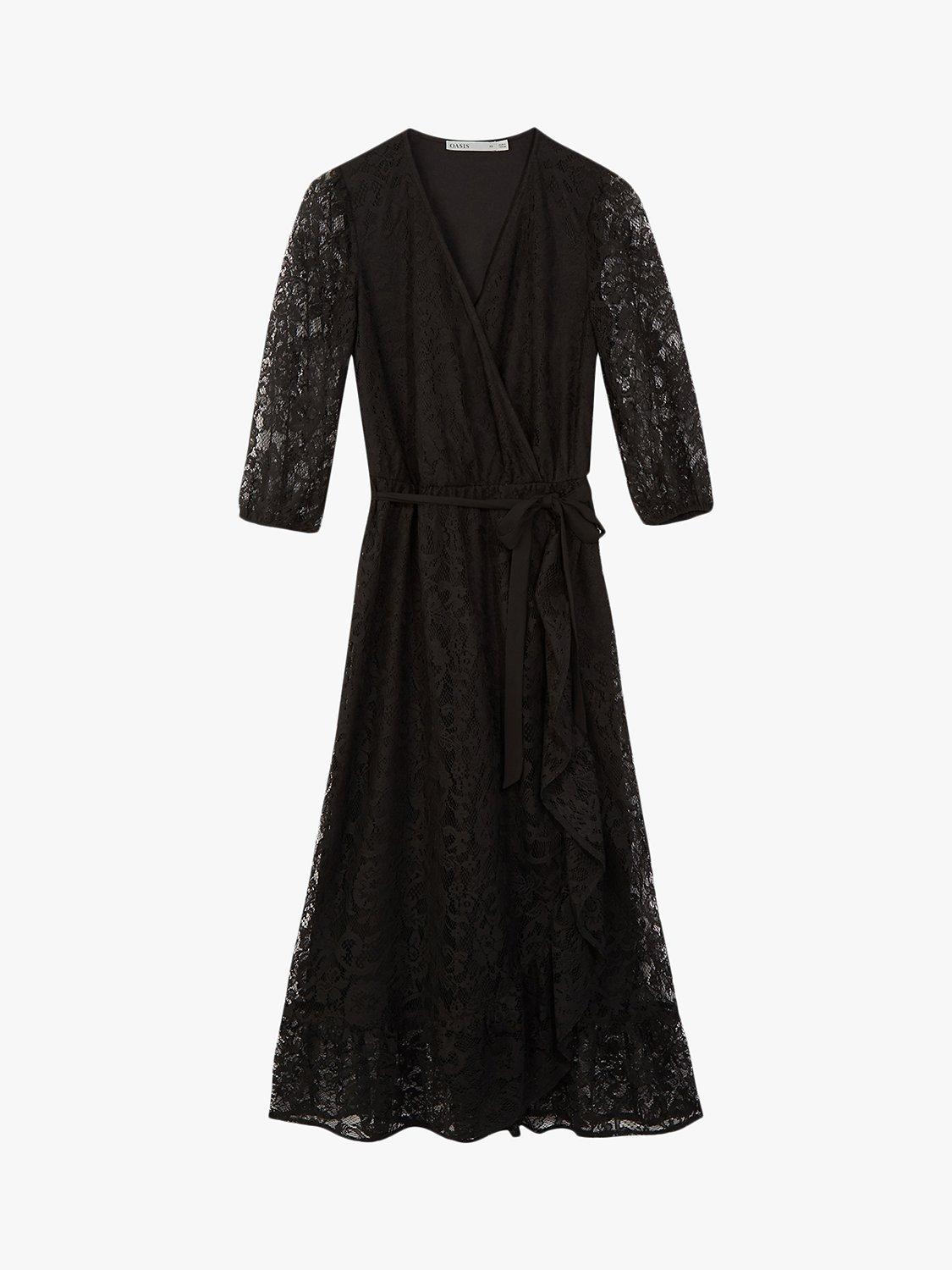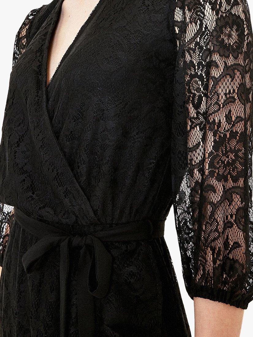 The black lace design has a somewhat decadent feel. Its sheer sleeves and hem evoke elegant femininity, while the wrap neck can be complemented by a gentle pendant.
