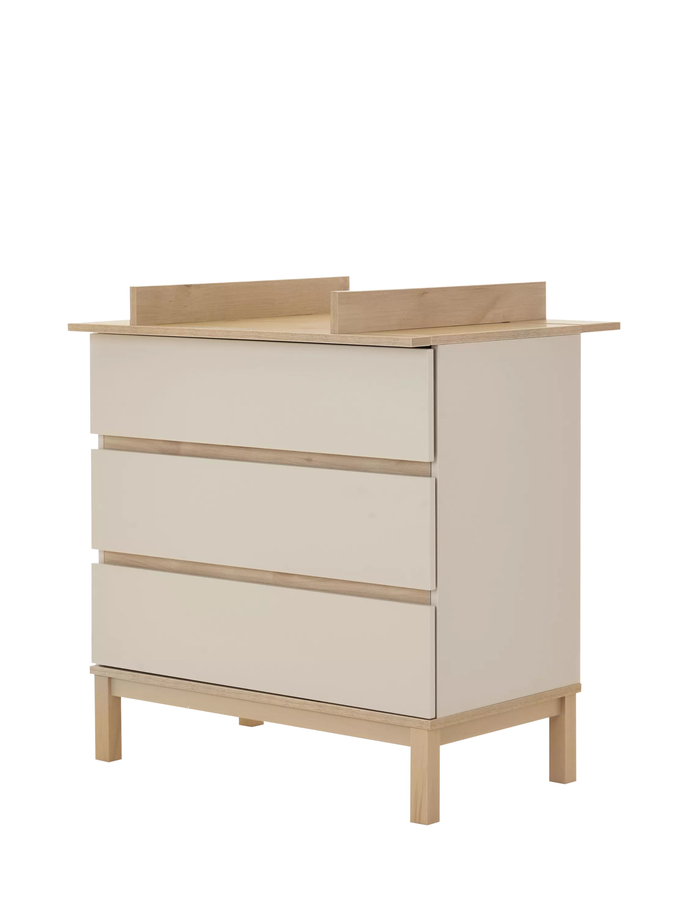 Astrid is designed with clean lines and a two-tone colourway. The three large drawers fronted by a no-handle design provide plenty of storage. While the clever positioning of the changing top means you are stood face on to baby, allowing plenty of precious one-to-one time. Once you no longer need to use the changer, the removable top ensures you have a stylish chest of drawers.