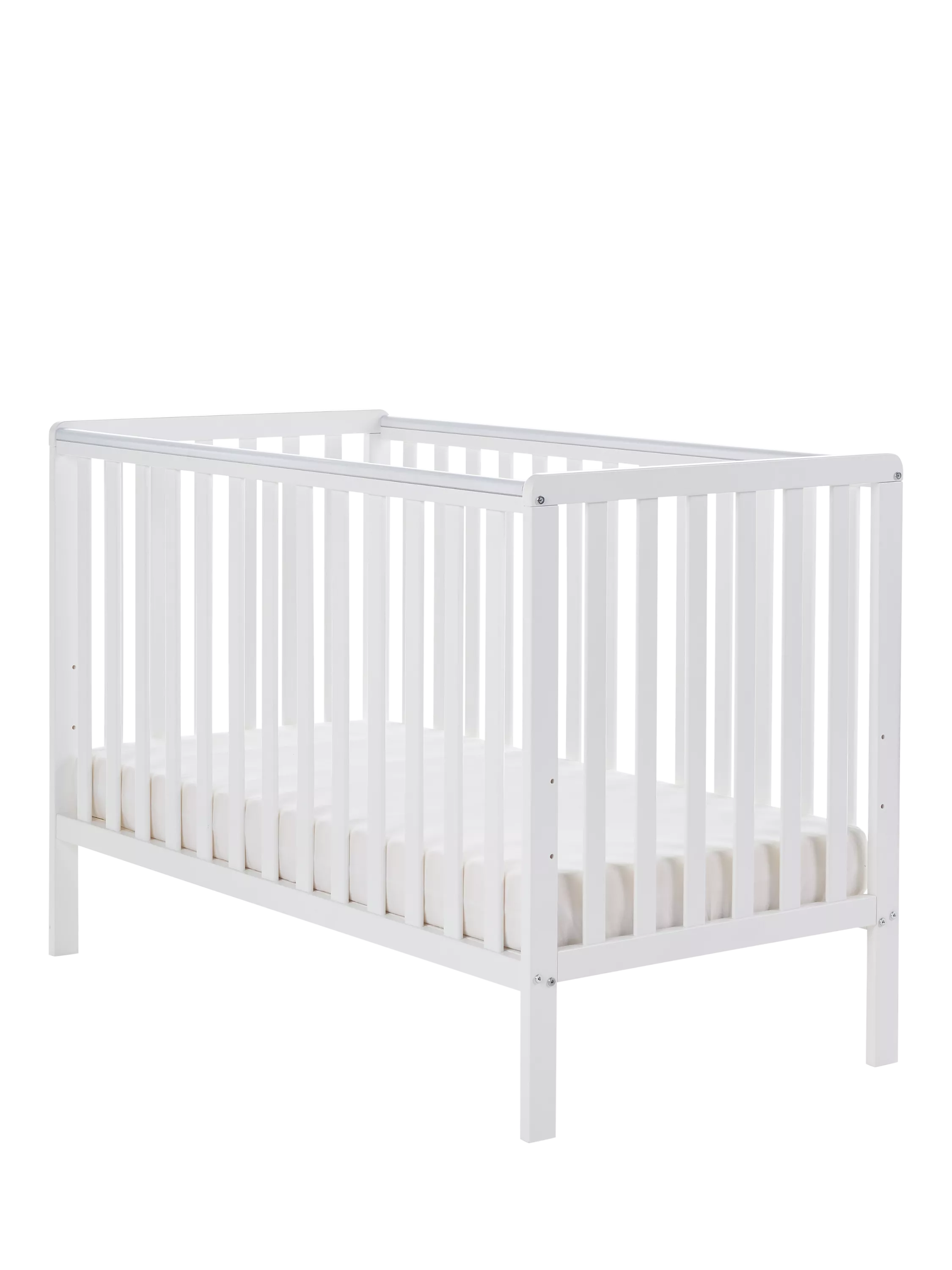 The Obaby Bantam cot features protective teething rails assuring you that your little one’s first teeth are protected, a fully open slatted design meaning you can keep an eye on your baby at all times and a three-position adjustable mattress base. The highest setting lessens the pressure and strain on your back, and the lower settings ensure optimum security from birth to toddler age.