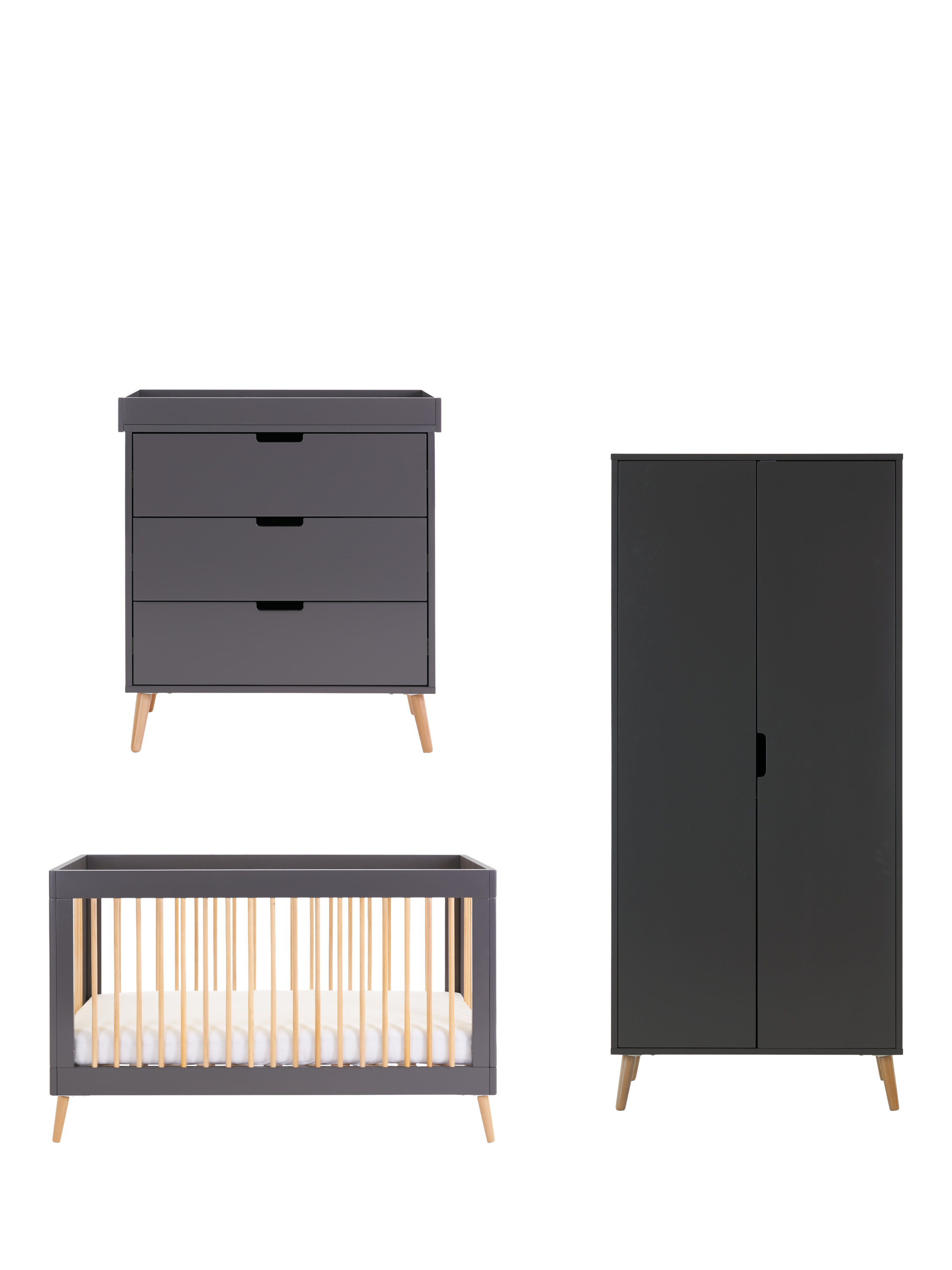The Maya range from Obaby is inspired by Scandinavian design, featuring a clean-cut finish and two-tone colourway, making it the perfect addition for families looking to create a modern and stylish nursery. This 3-piece room set consists of the Maya cotbed, changing unit and double wardrobe.