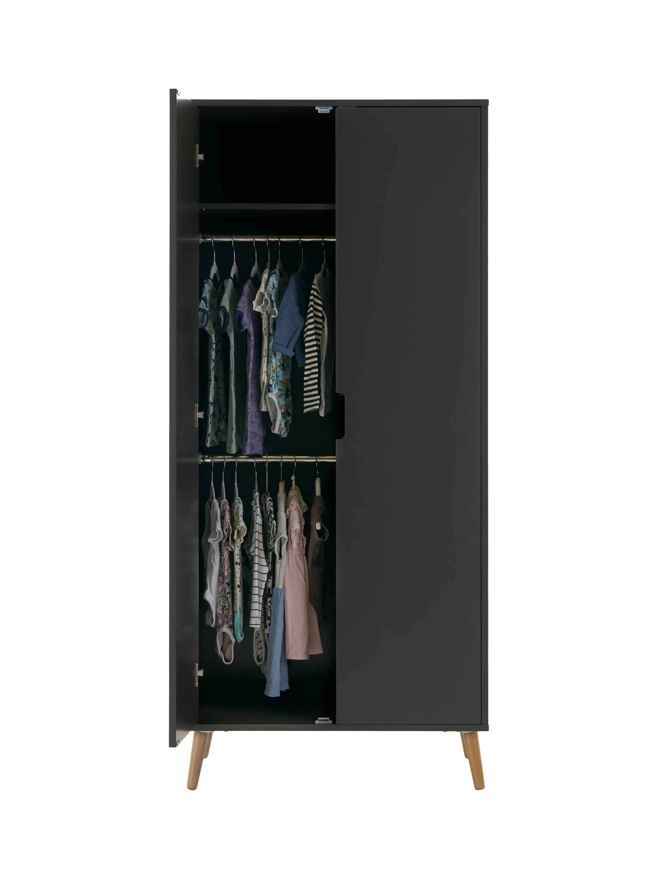 Completing the room set is the double wardrobe. Putting style and functionality at the forefront, the large cupboard space features two hanging rails and a single full-width shelf, all fronted by double soft-close doors with recessed handles.