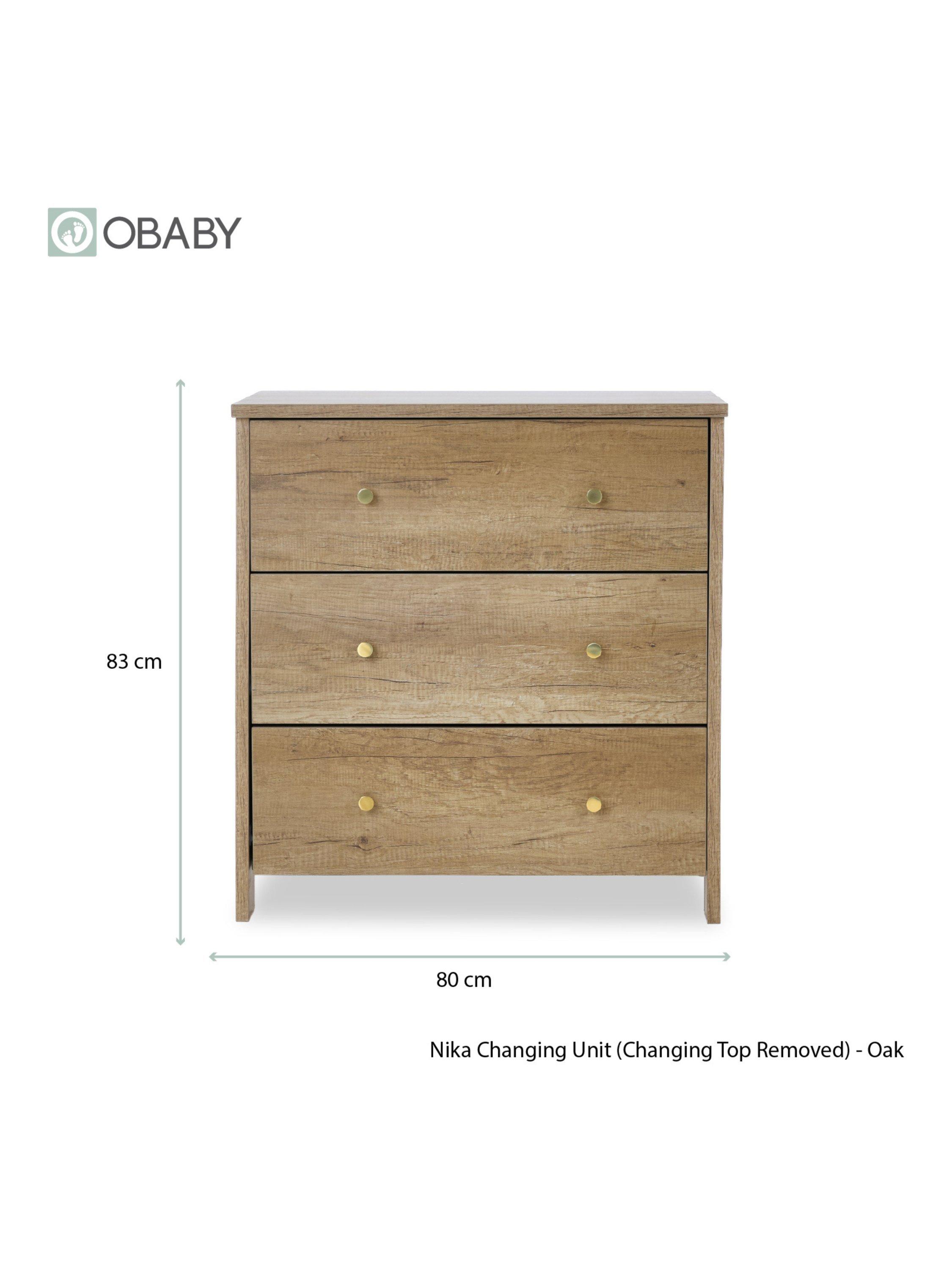 The Nika changing unit has three large 32L capacity, full-depth drawers. All three feature two brushed metal handles and glide on smooth runners. Discreet spring pins allow the changing area to be attached to the top of the unit without any unsightly screws showing. It accommodates a changing mat up to 76 x 46cm and is set at a comfortable height for parents. When the changing area is no longer needed, the frame can be easily removed to create a solid top chest of drawers.