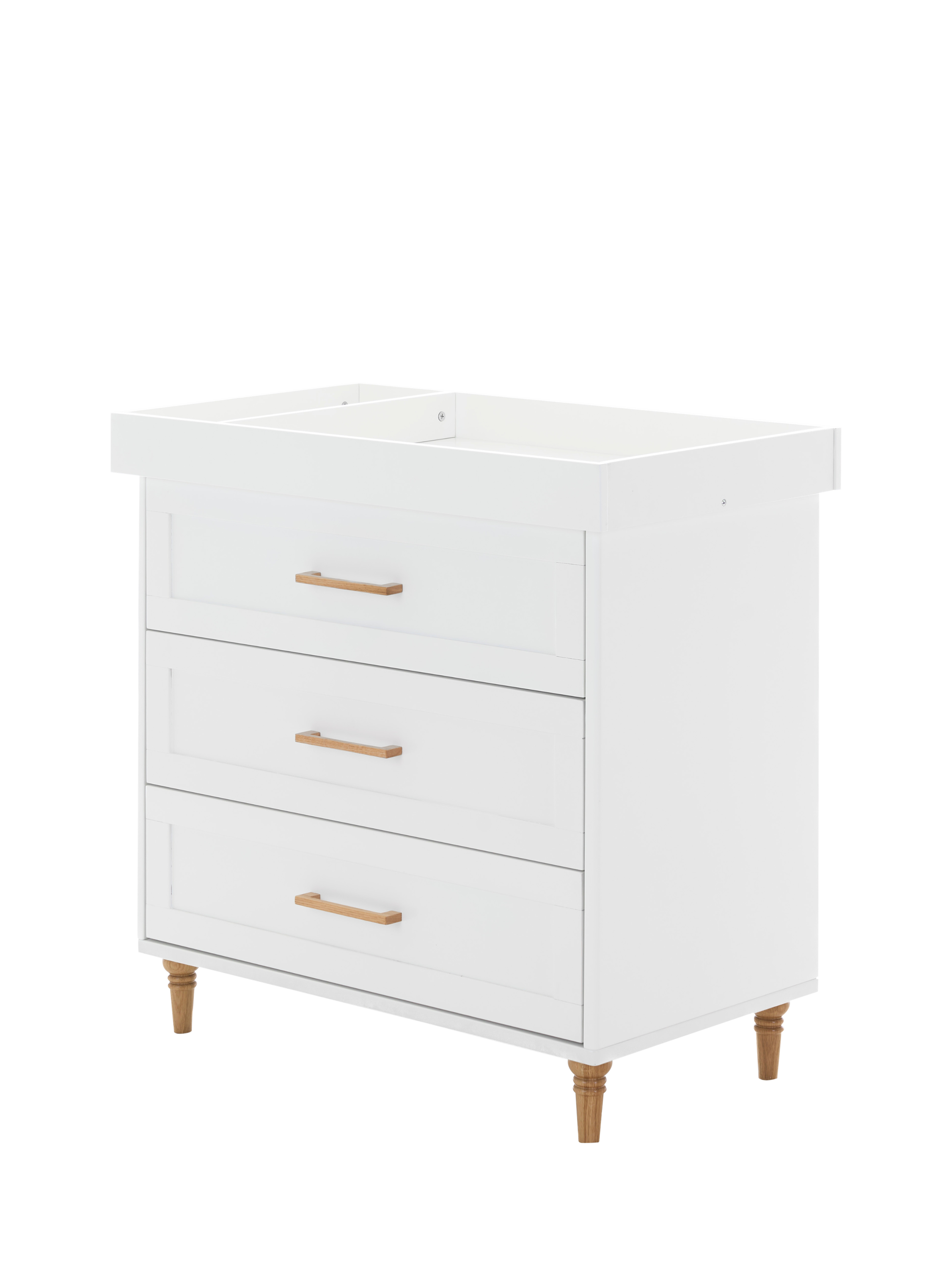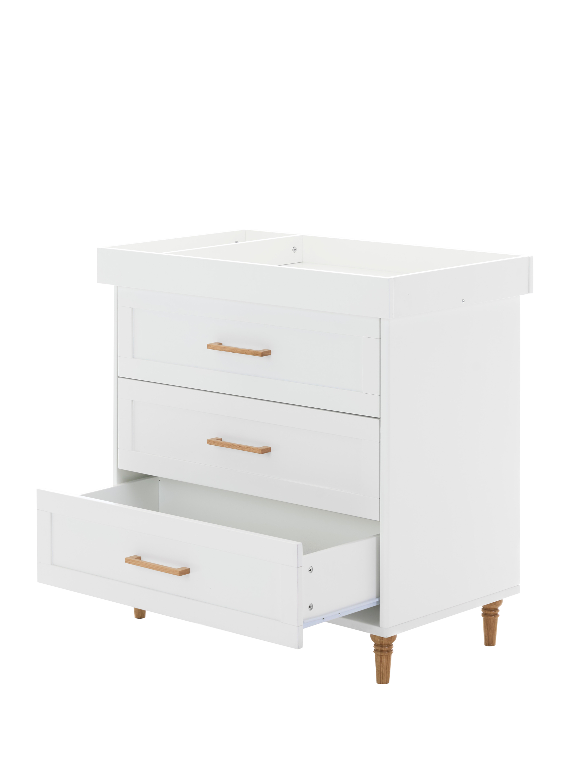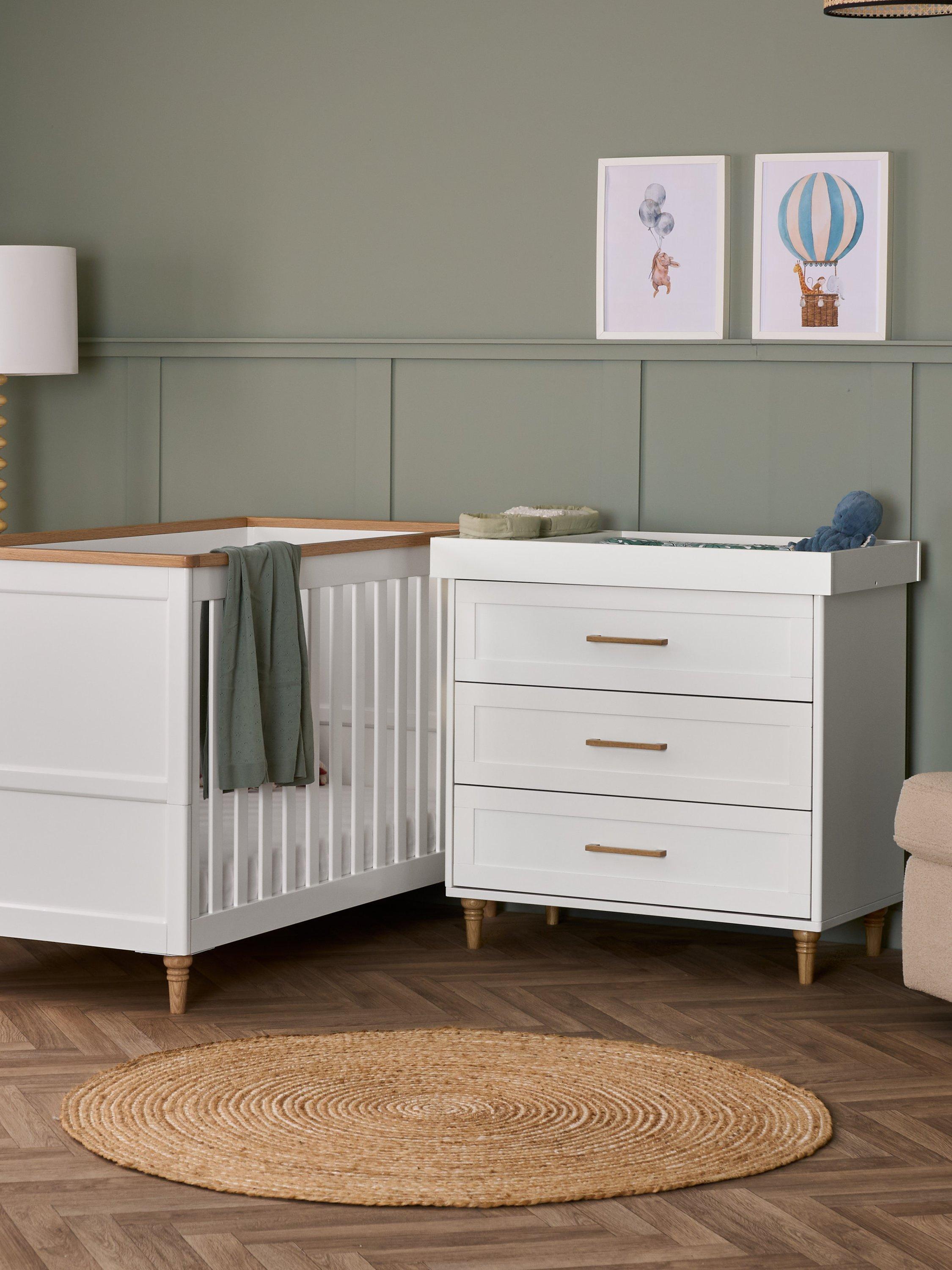 The changing unit makes organised storage easy with its extra-wide Shaker-style drawers. With a removable changing top, it easily transitions into a stylish chest of drawers.