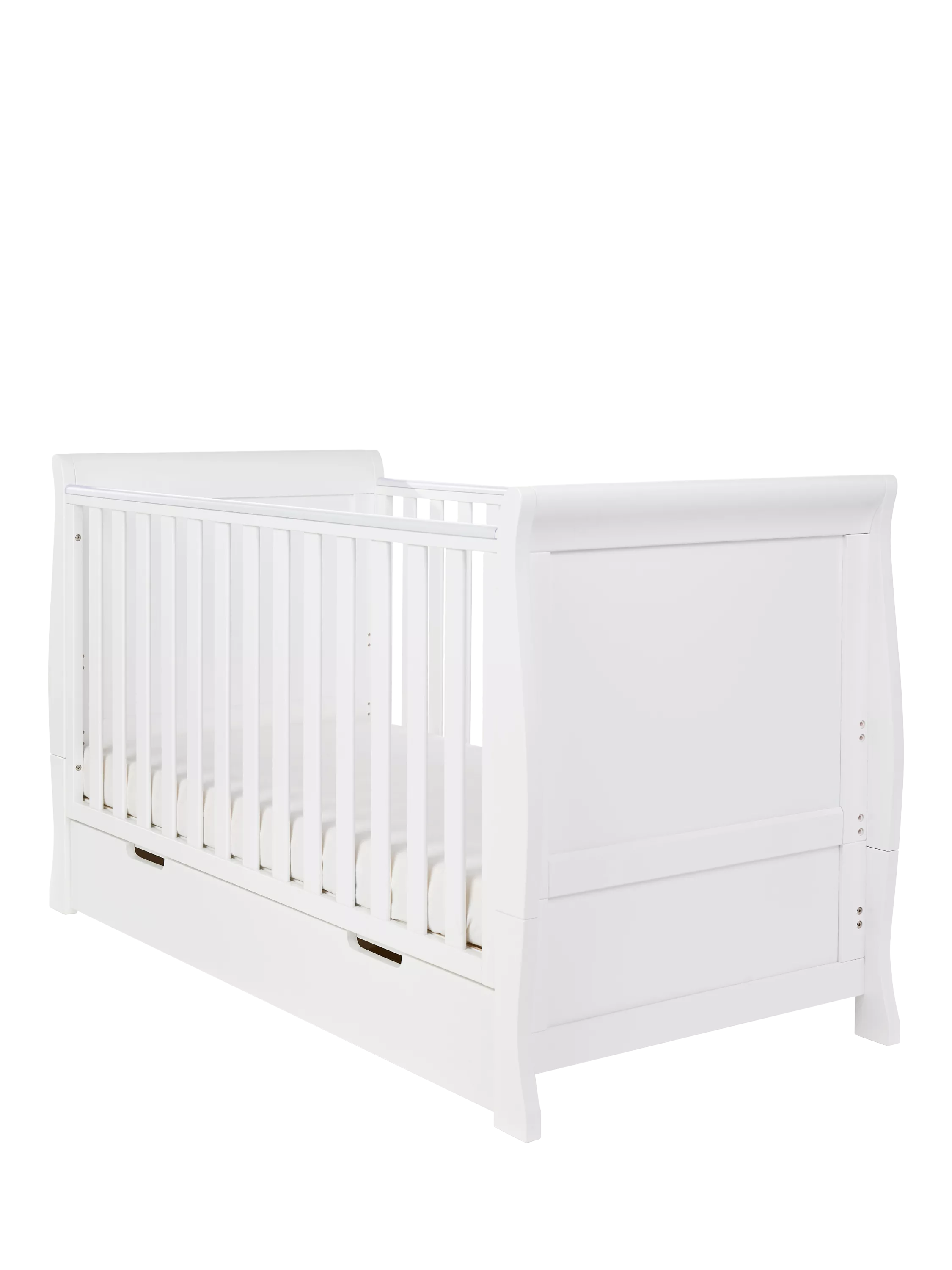 The Obaby Stamford furniture range offers a combination of style, quality and practicality. At the heart of the range is this Stamford Classic cotbed, with its elegant sleigh design offering traditional styling with a contemporary finish.