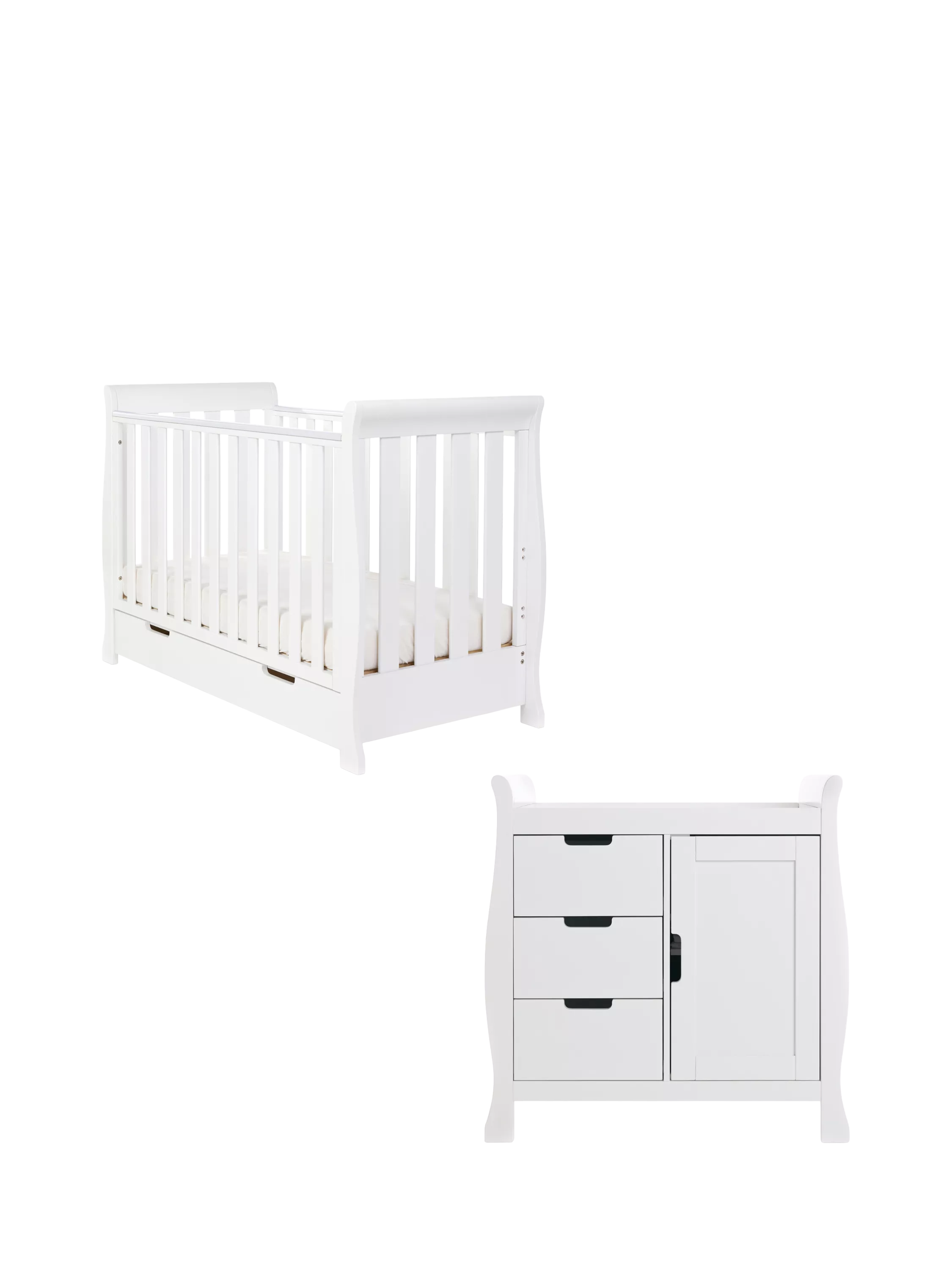 Obaby's Stamford furniture range offers families the perfect combination of style, quality and practicality. The Stamford Mini two-piece room set consists of the beautiful Stamford Mini cot bed with an under drawer and a closed changing unit. Both pieces feature the same elegant sleigh design that flows throughout the Stamford range.