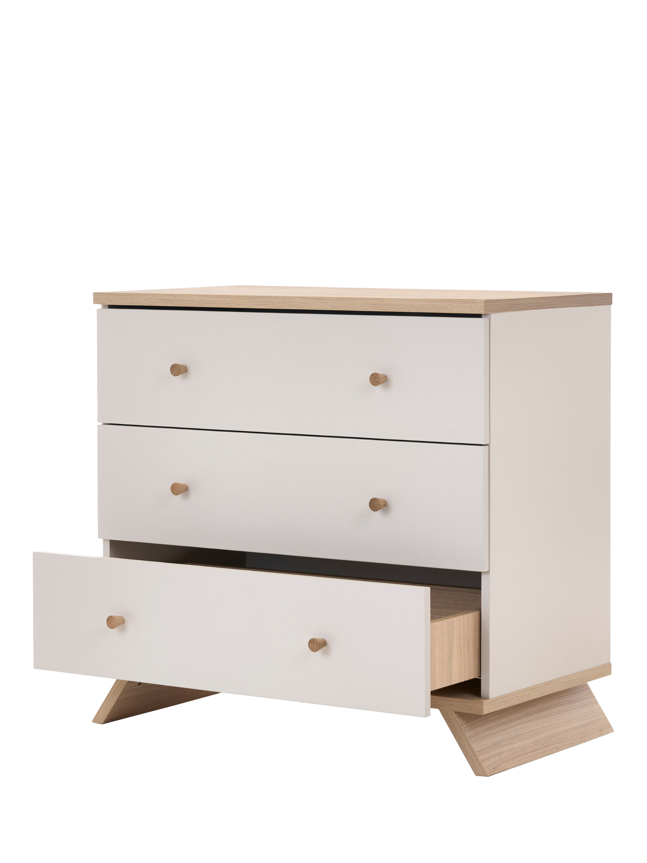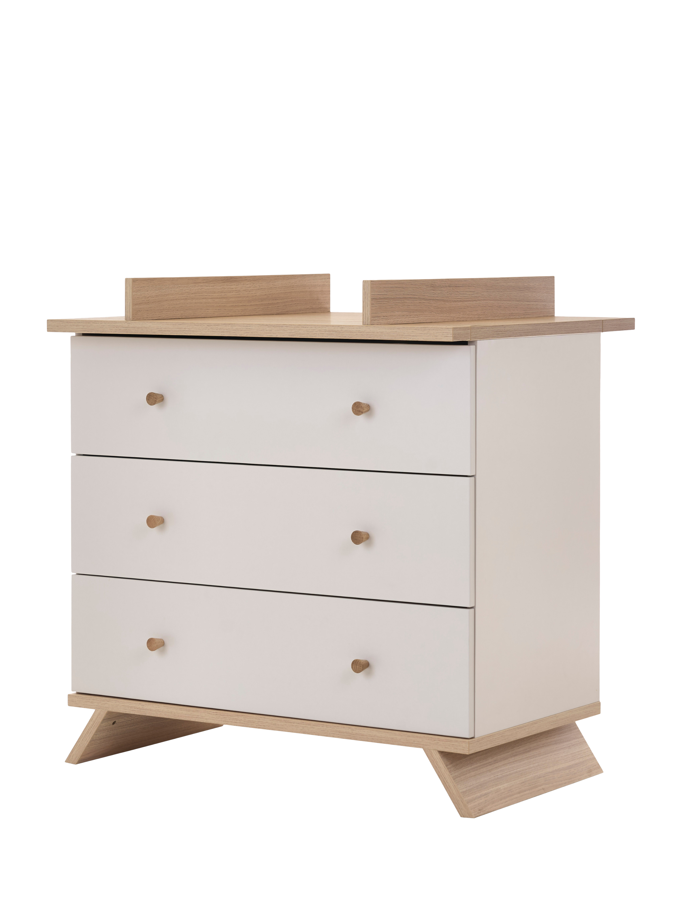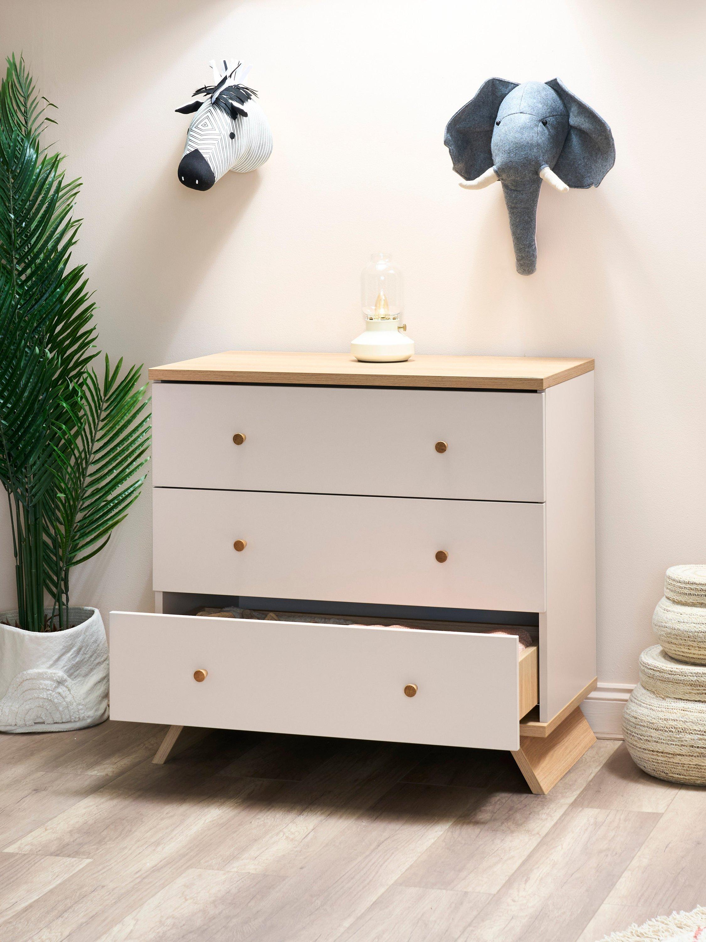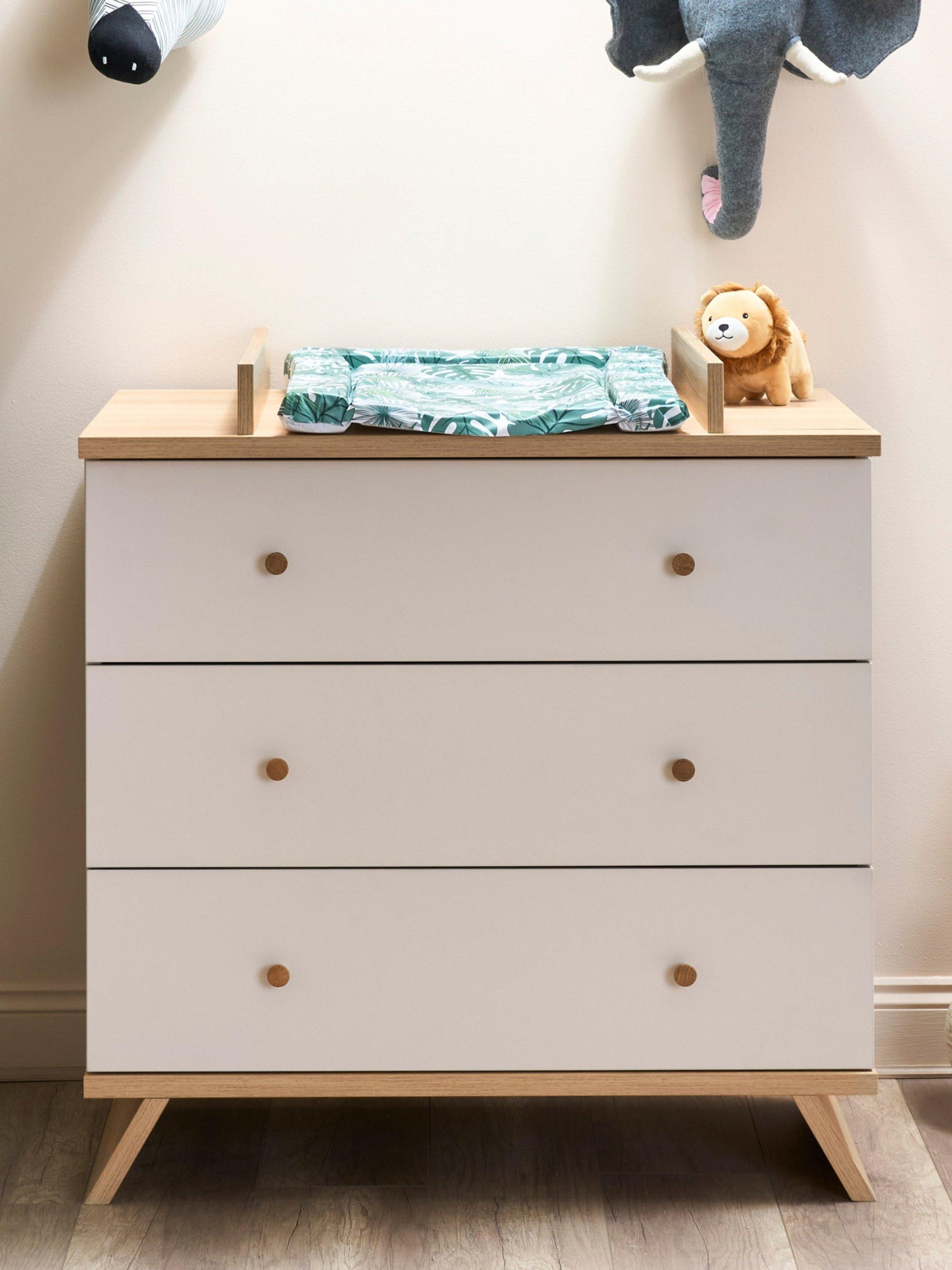 The sleek two-tone design and minimalist craftsmanship of the Thea Changing Unit create a sophisticated look while ensuring maximum practicality. The unit features three spacious drawers, providing plenty of room to store nappies, baby clothes, and essentials, keeping everything neatly within reach. With a thoughtfully positioned front-facing changing area, the unit allows you to stand comfortably while interacting with your baby, making every change a comfortable and bonding experience. As your child grows, the removable changing top ensures a smooth transition into a classic chest of drawers. The high-quality craftsmanship ensures durability beyond the nursery years, making this piece a lasting part of your home.