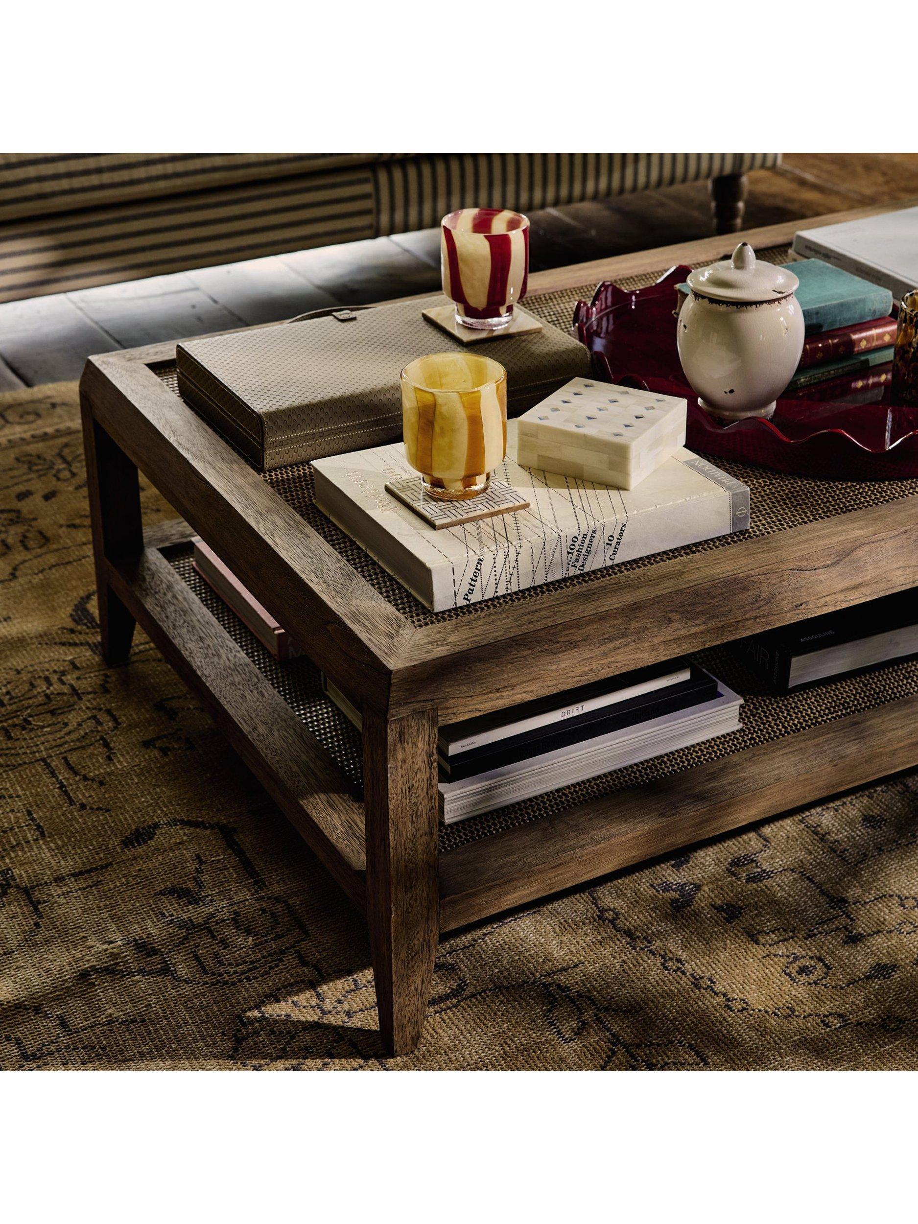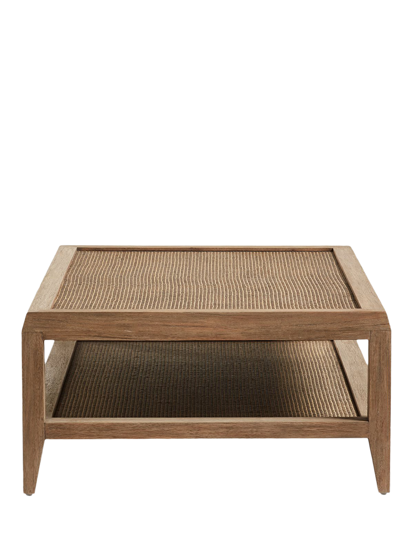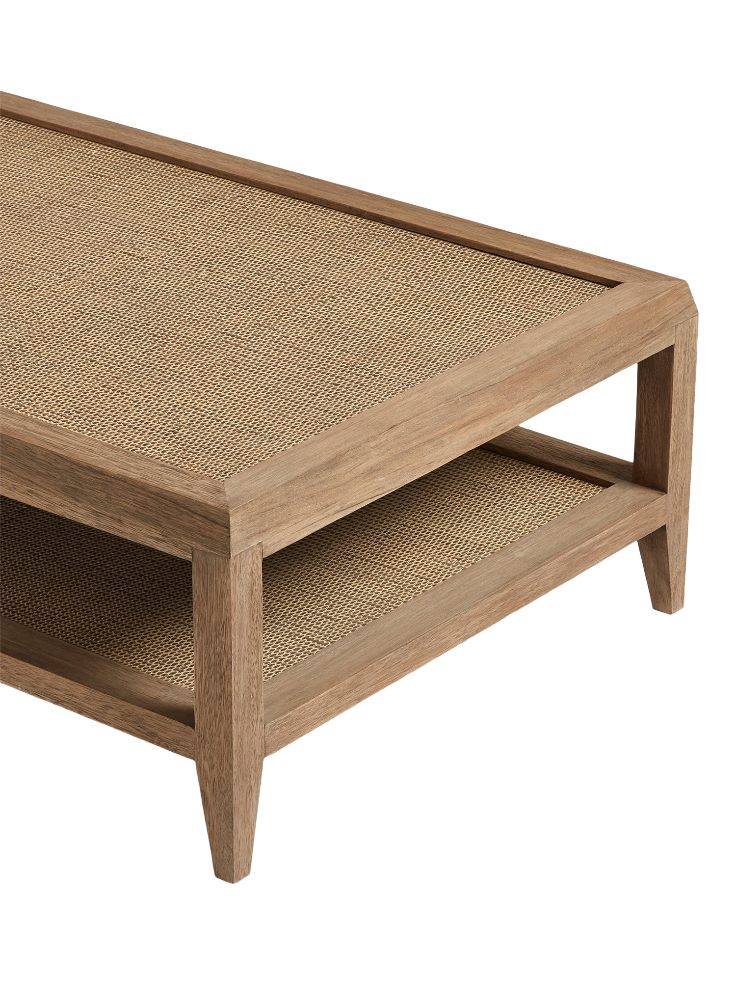The Alicia Coffee Table features a frame made using bayur wood and inset woven cane surfaces. Its simple design sits on pleasing tapered legs with a bottom shelf for storing puzzles, games and books.