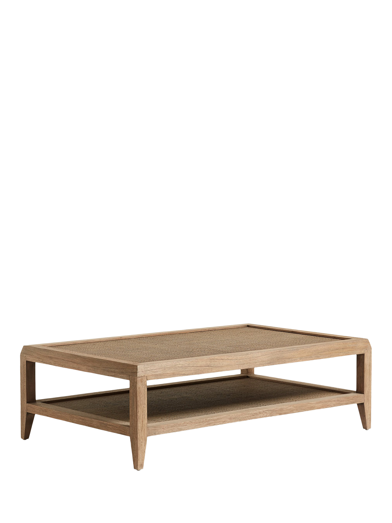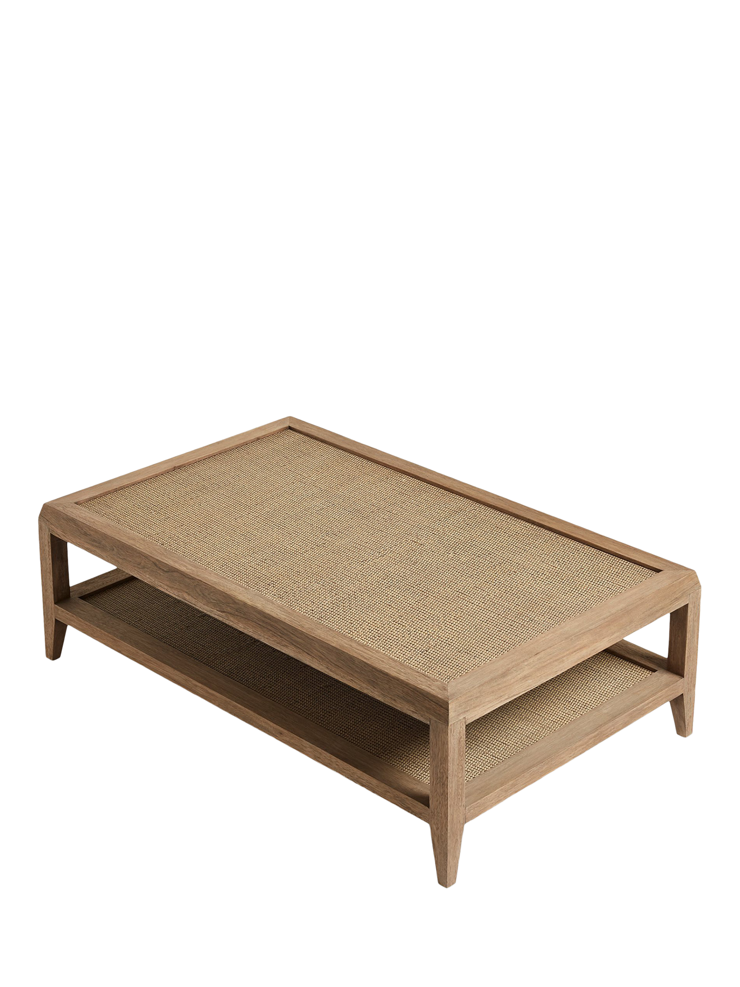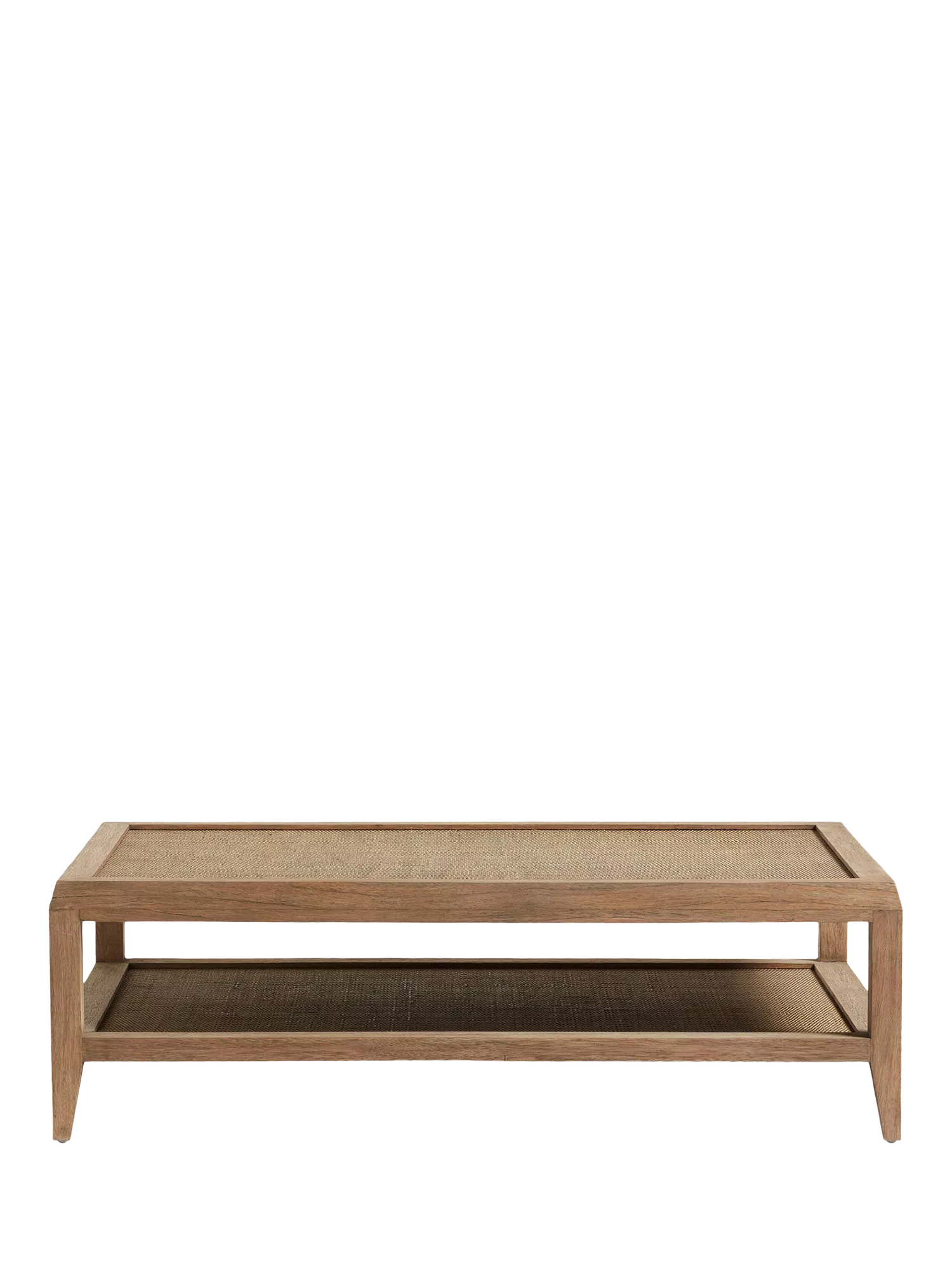 The Alicia Coffee Table features a frame made using bayur wood and inset woven cane surfaces. Its simple design sits on pleasing tapered legs with a bottom shelf for storing puzzles, games and books.