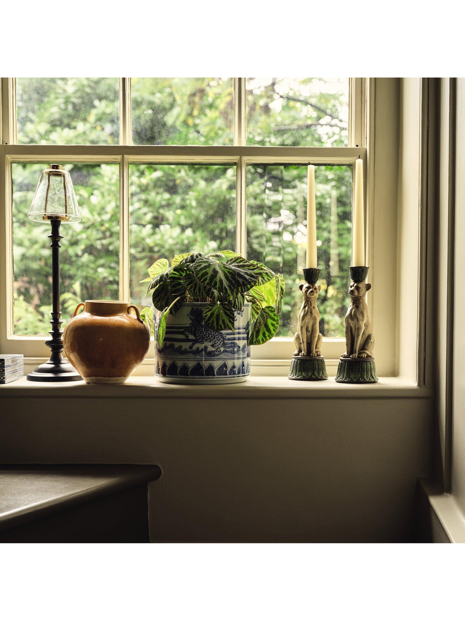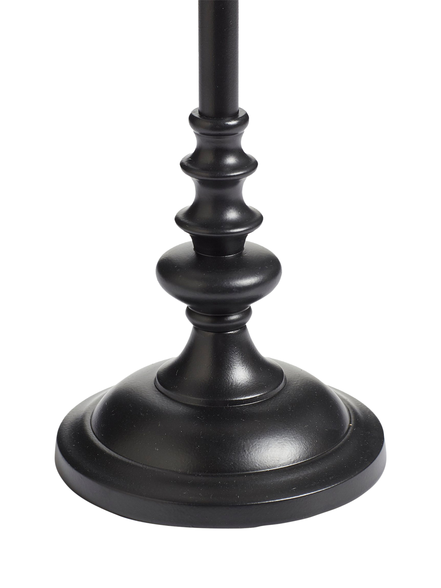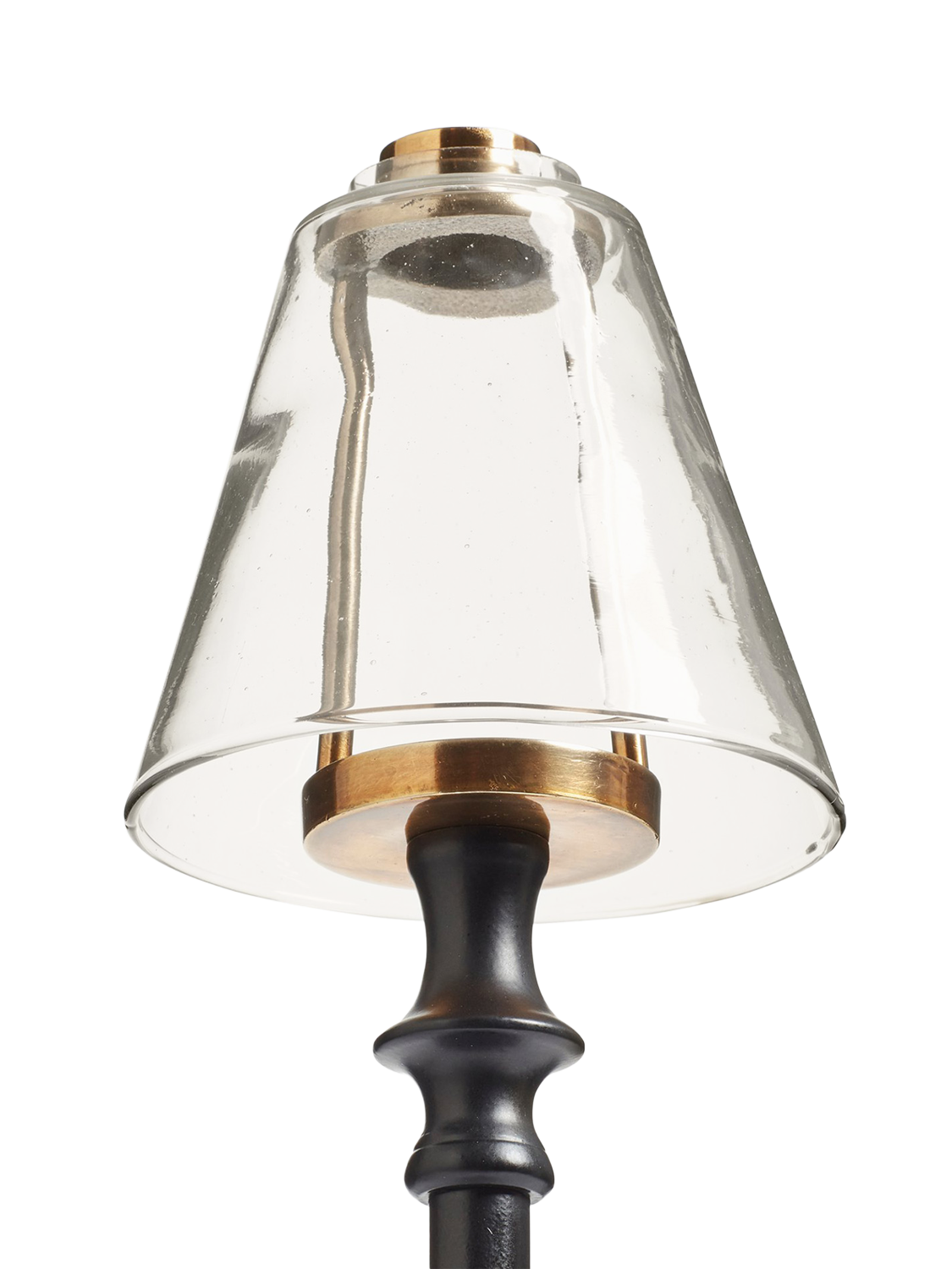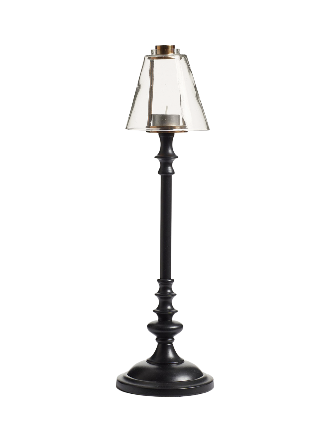 The Barton Candle Holder has a classic feel with its ornate metal base that's sand casted to have a turned effect. This process involves incorporating the design pattern into sand, then filling the cavity left behind with molten metal which is left to cool before the sand mould is removed. A mouth-blown glass shade protects the flickering flame of the candle, which means this piece also works well outdoors, as the shade shields the candle from any breeze.
