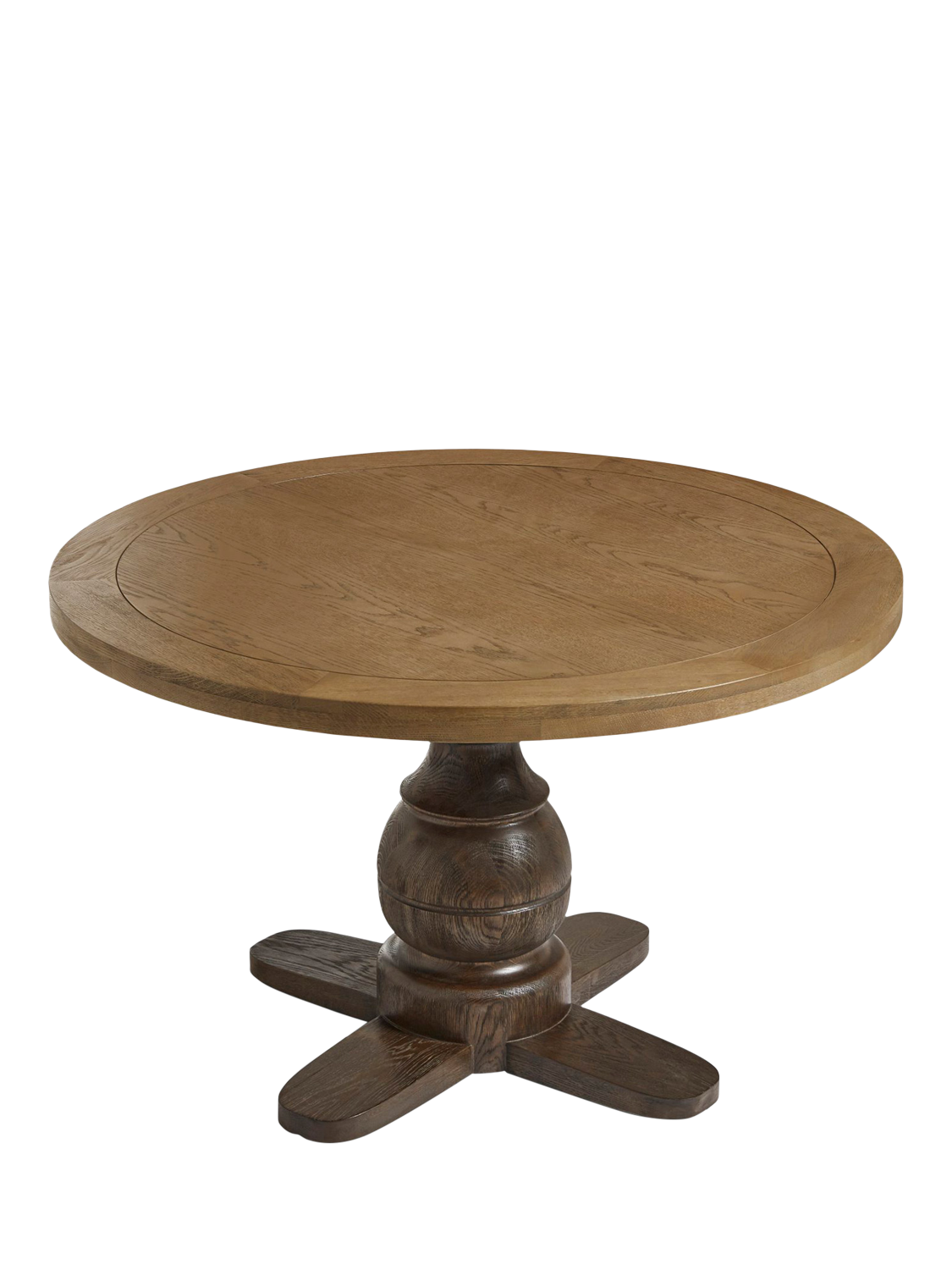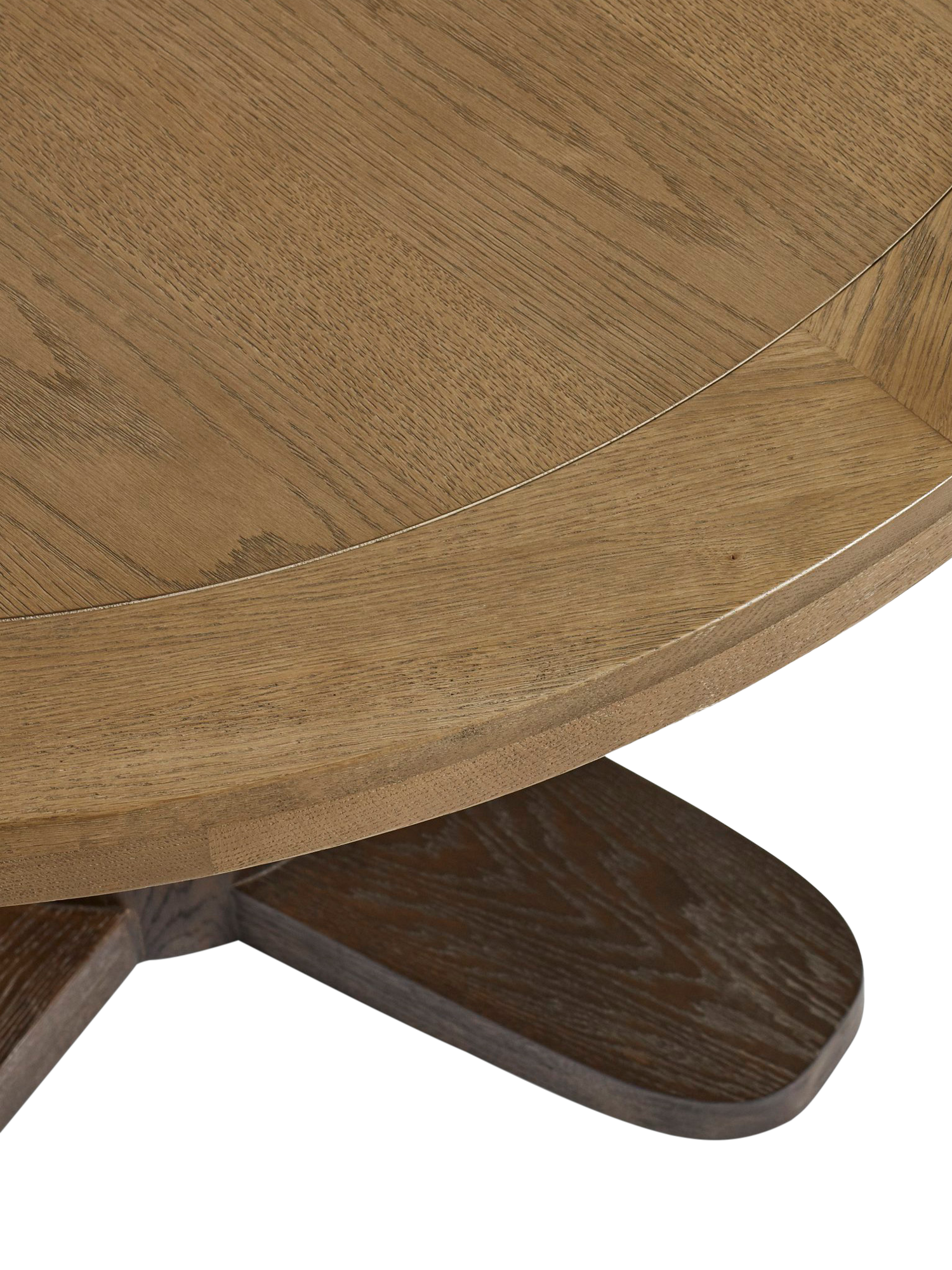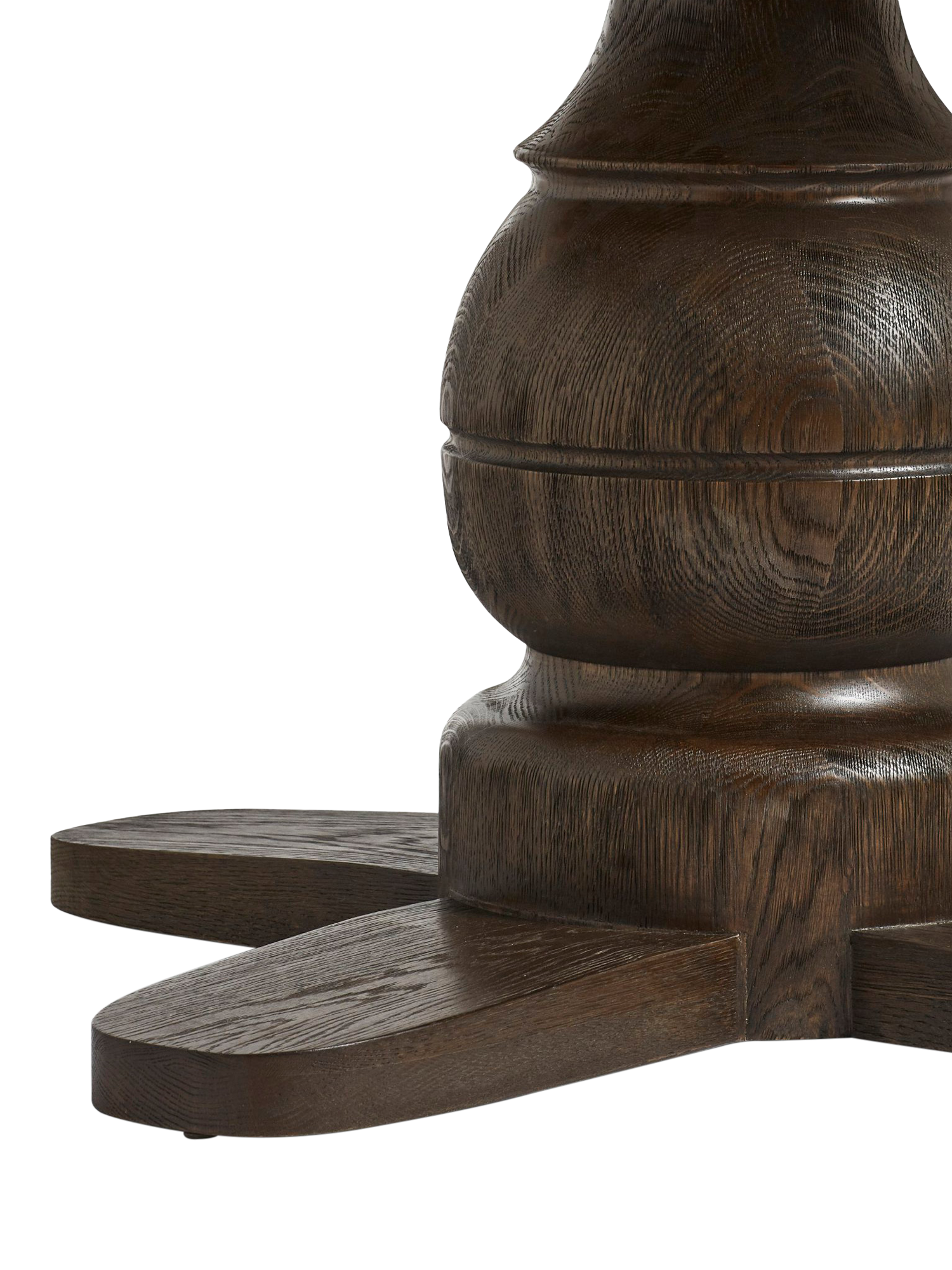 The central pedestal is boldly turned with a bulbous, rounded form that nods to traditional woodworking techniques. It gives the table a substantial presence while allowing for generous legroom. The contrasting timber finishes help define the base structure and add a two-tone effect to the piece.