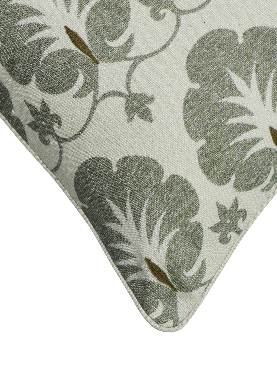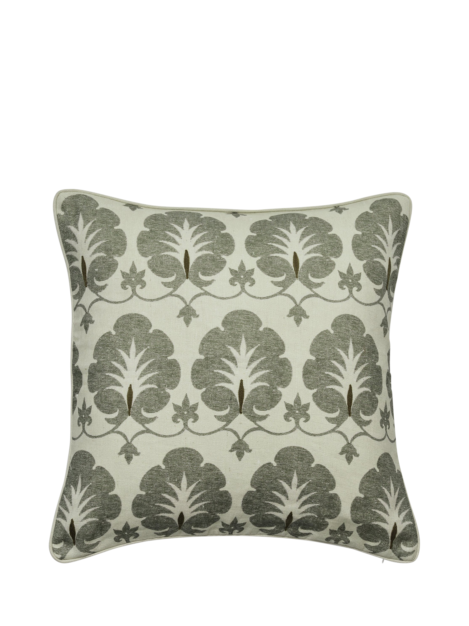 The Samamit cushion features a damask pattern that’s digitally-printed on a single side of dyed linen. Adding tactility, chain-stitch embroidery – one of the oldest and most decorative stitches across cultures – appears on the inner-motif.