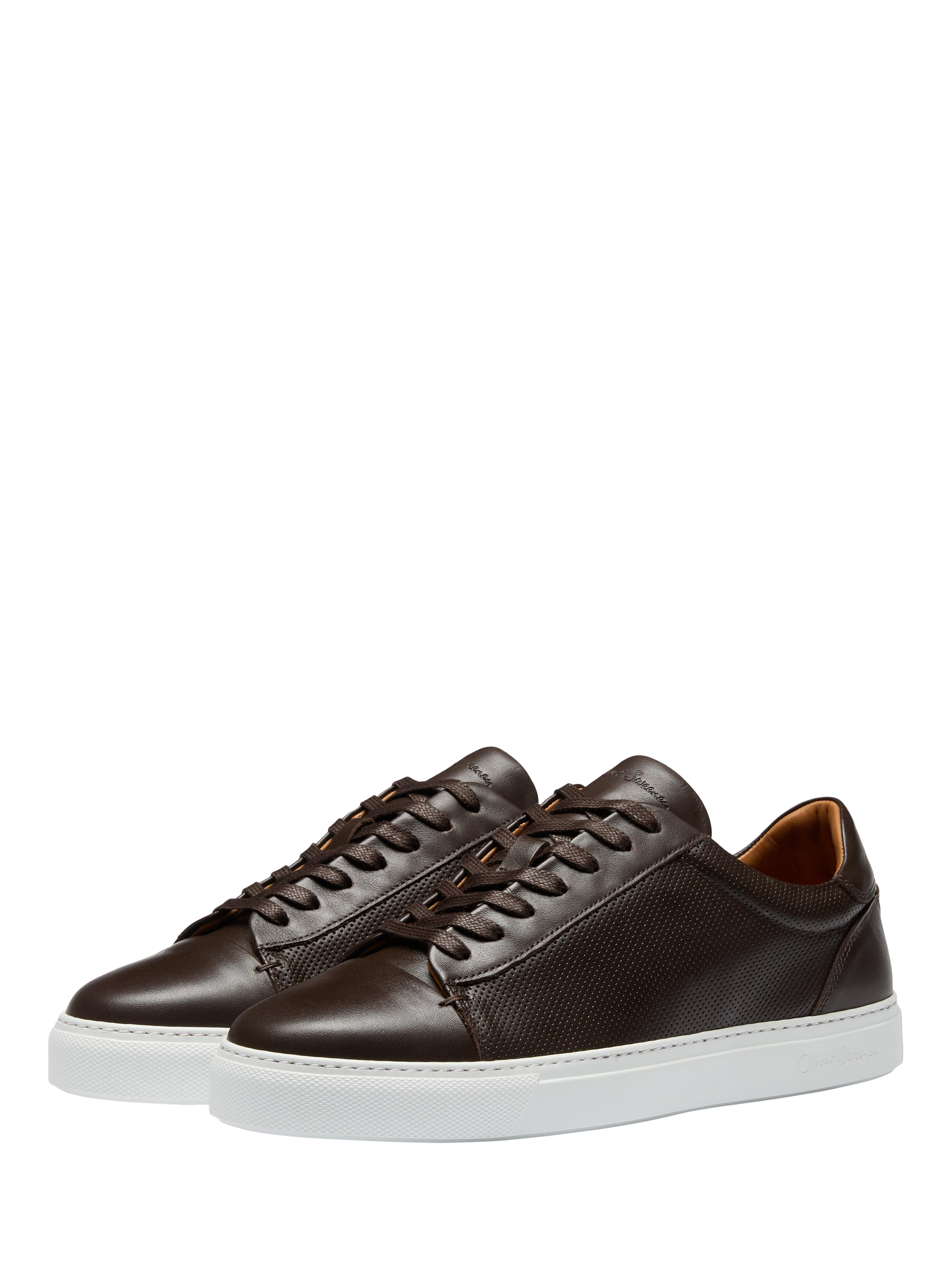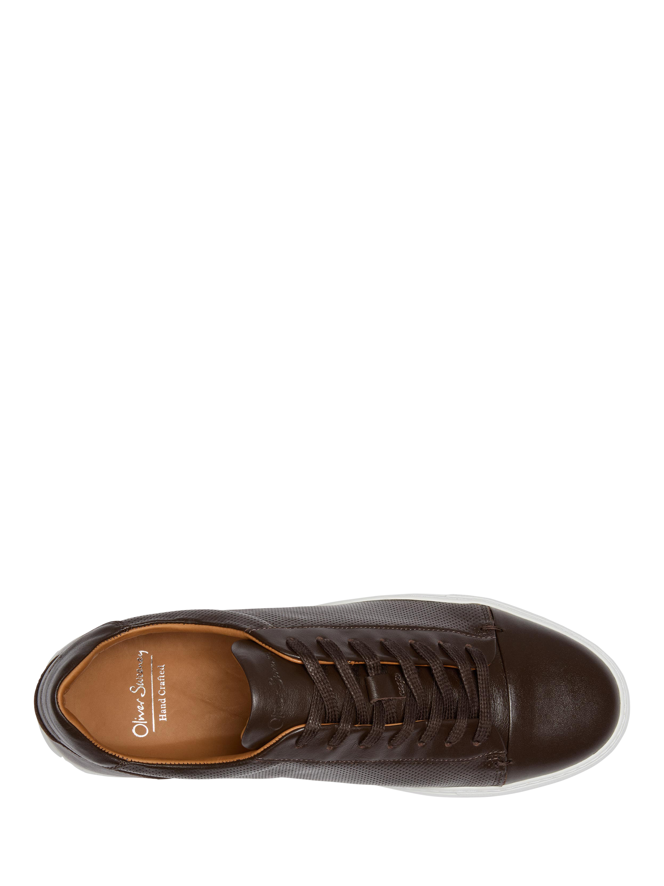 These perforated trainers from Oliver Sweeney are a combination of smooth and punched calf leather with a matt finish. The upper pattern features a toe cap with a neatly folded seam, punched quarter panels, a padded collar and a bagged topline and tongue. Inside they've included a full calf leather lining and deep-cushioned leather insole. The trainers are made traditionally and cemented to a lightweight cupsole secured with a side stitch.