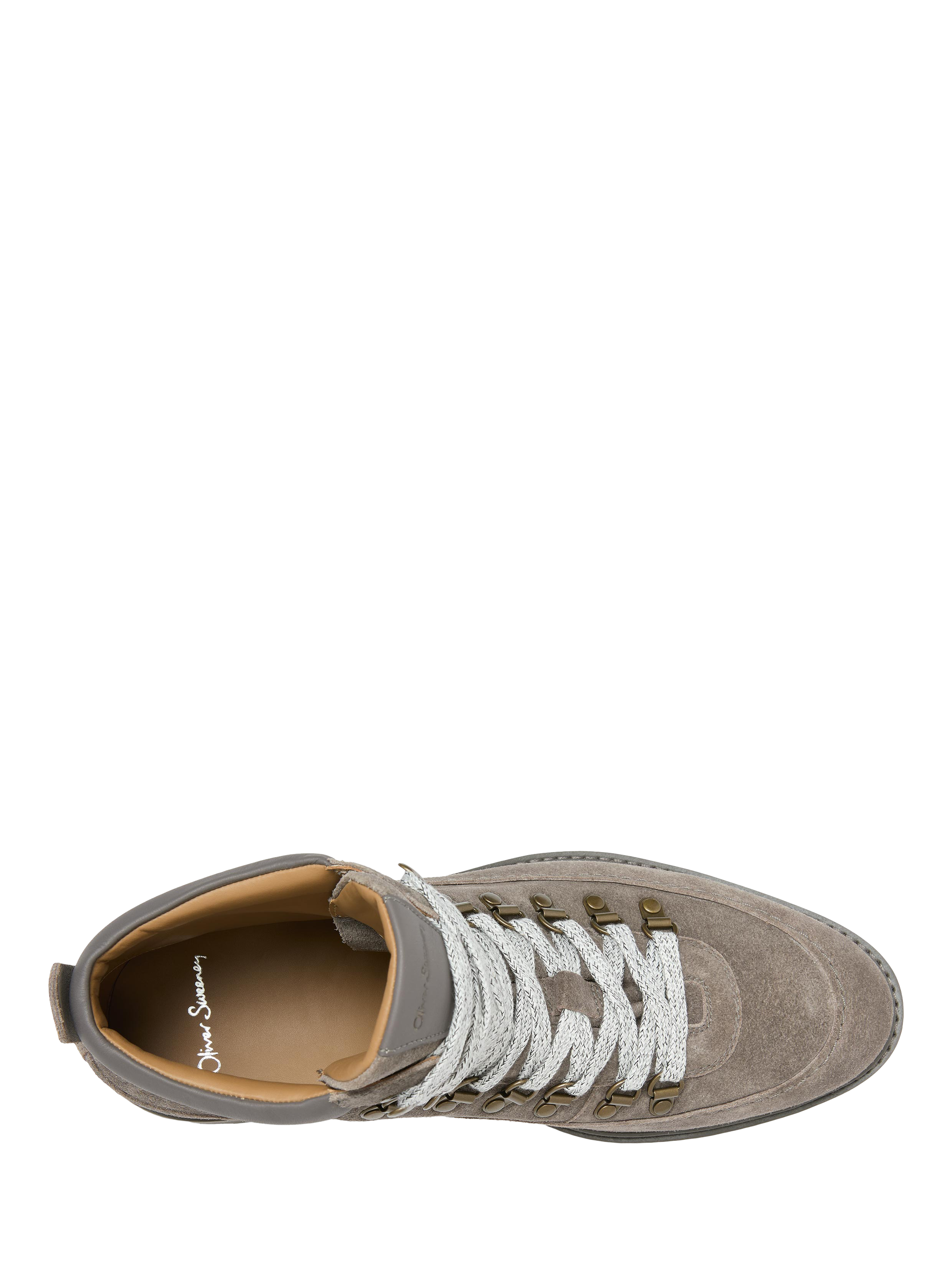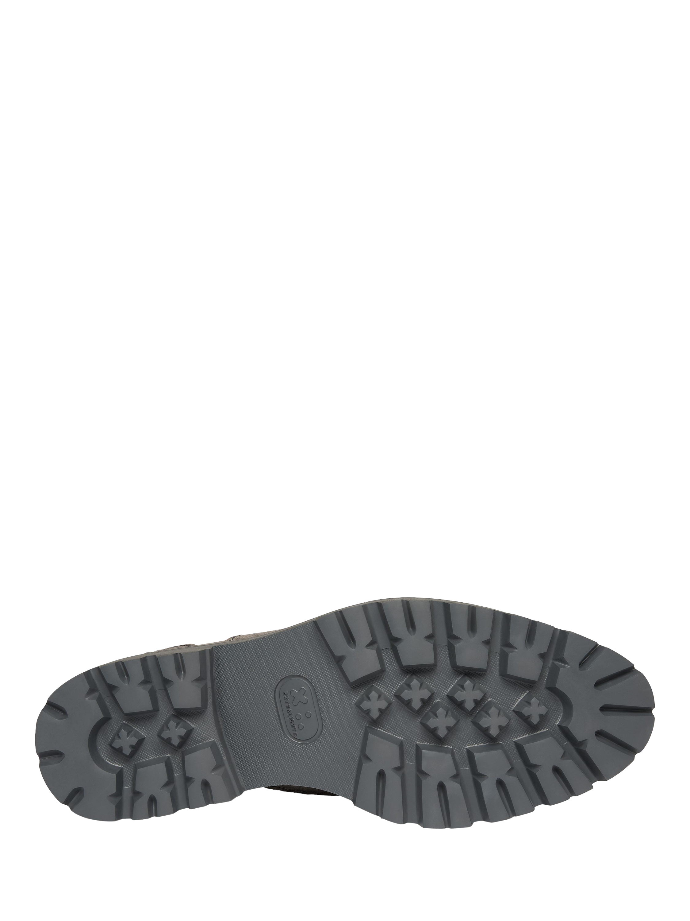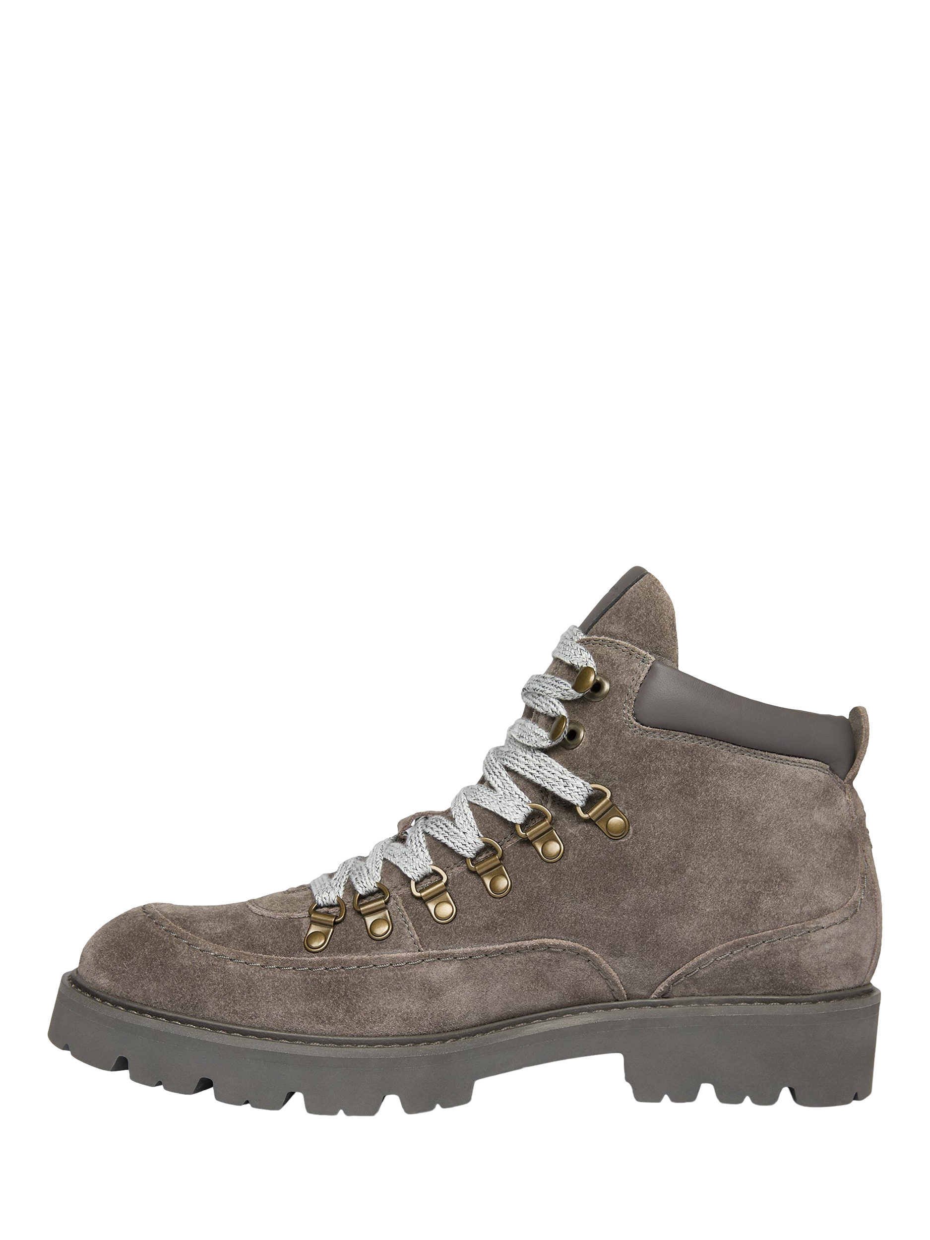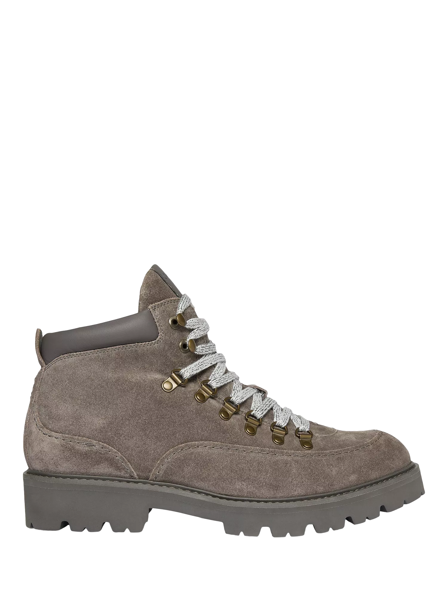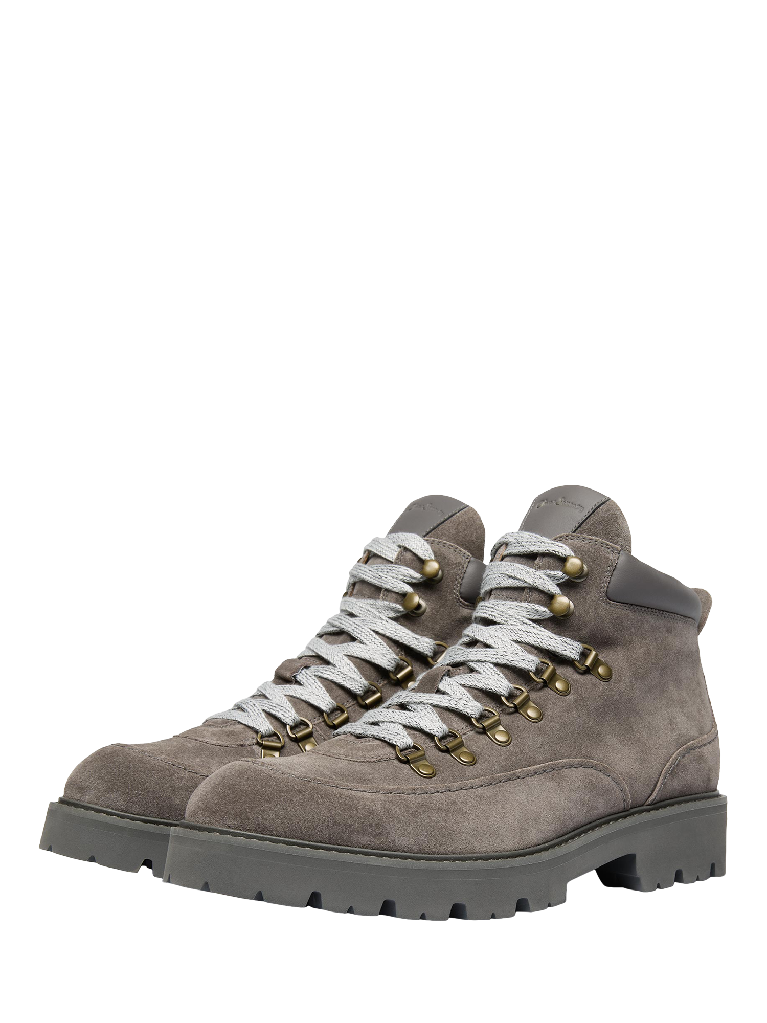This hiker is made from soft calf suede on a Finproject Extralight cleated sole. A series of antique brass D-rings and ski hooks provides an easy closure with a flexible fit. The bellows tongue is made of super-soft, flexible suede sewn over the facings to seal the upper. Made with light padding in the collar and tongue top, and inside, there is a half calf leather lining and a cushioned leather insole.