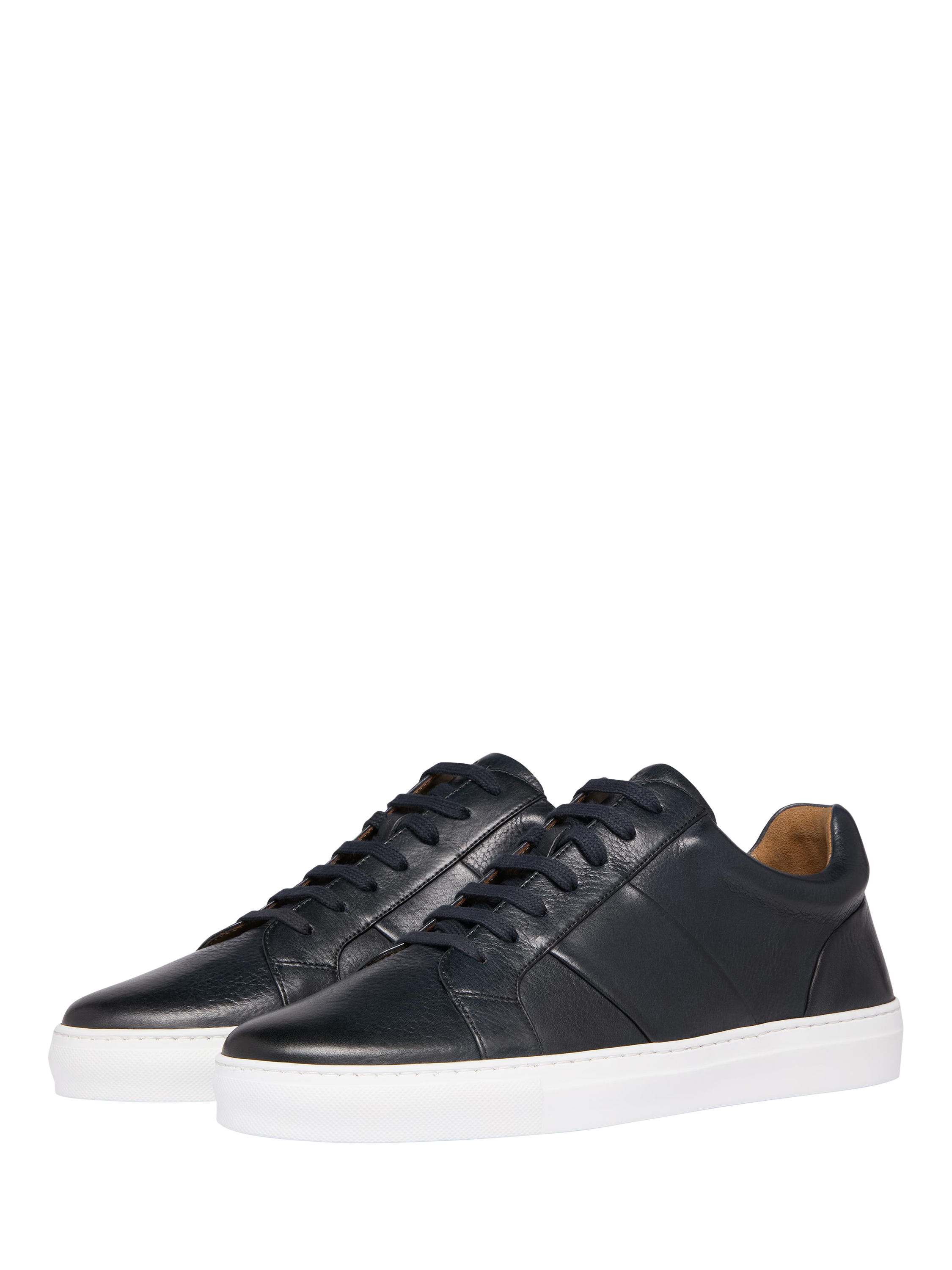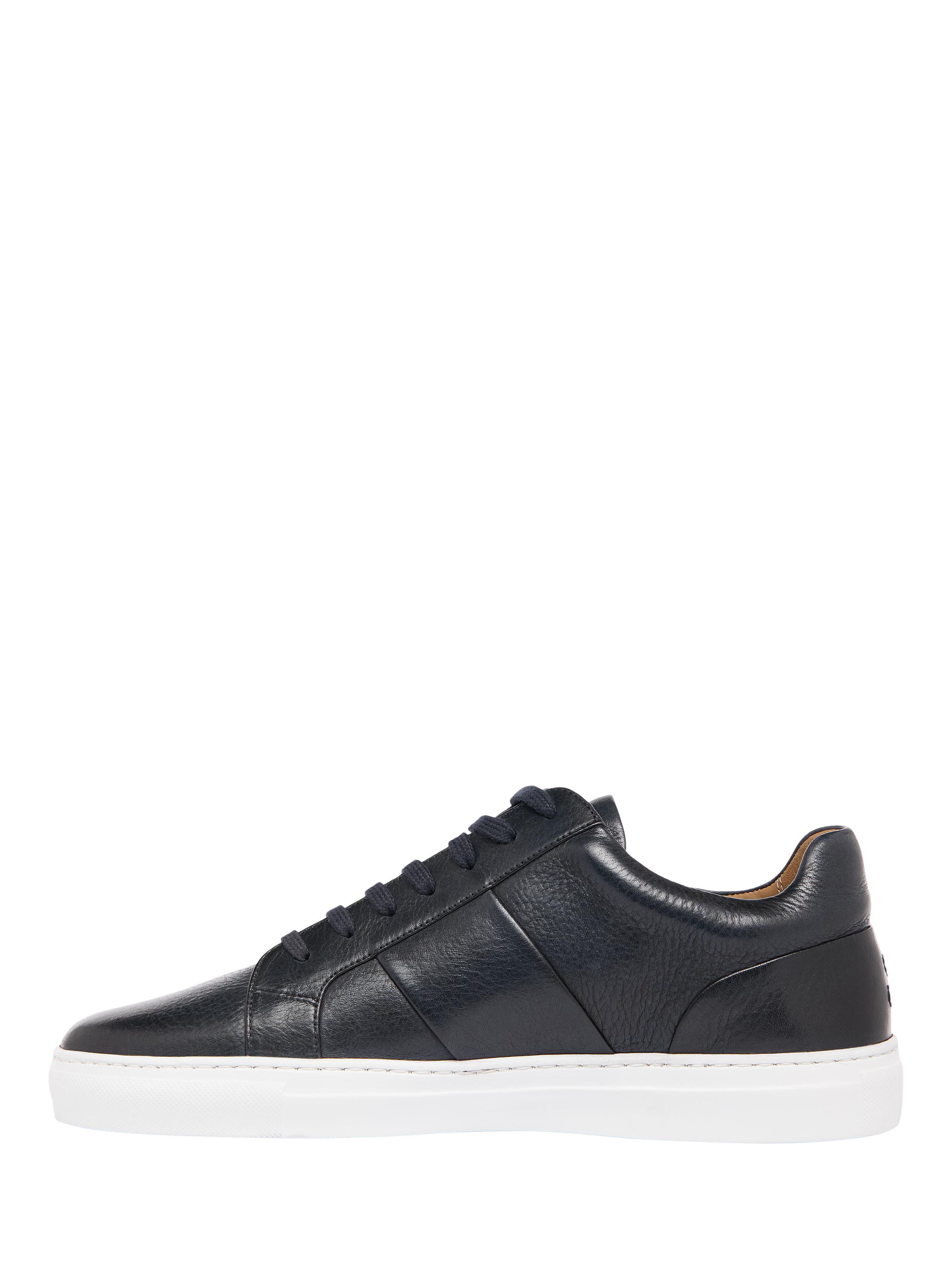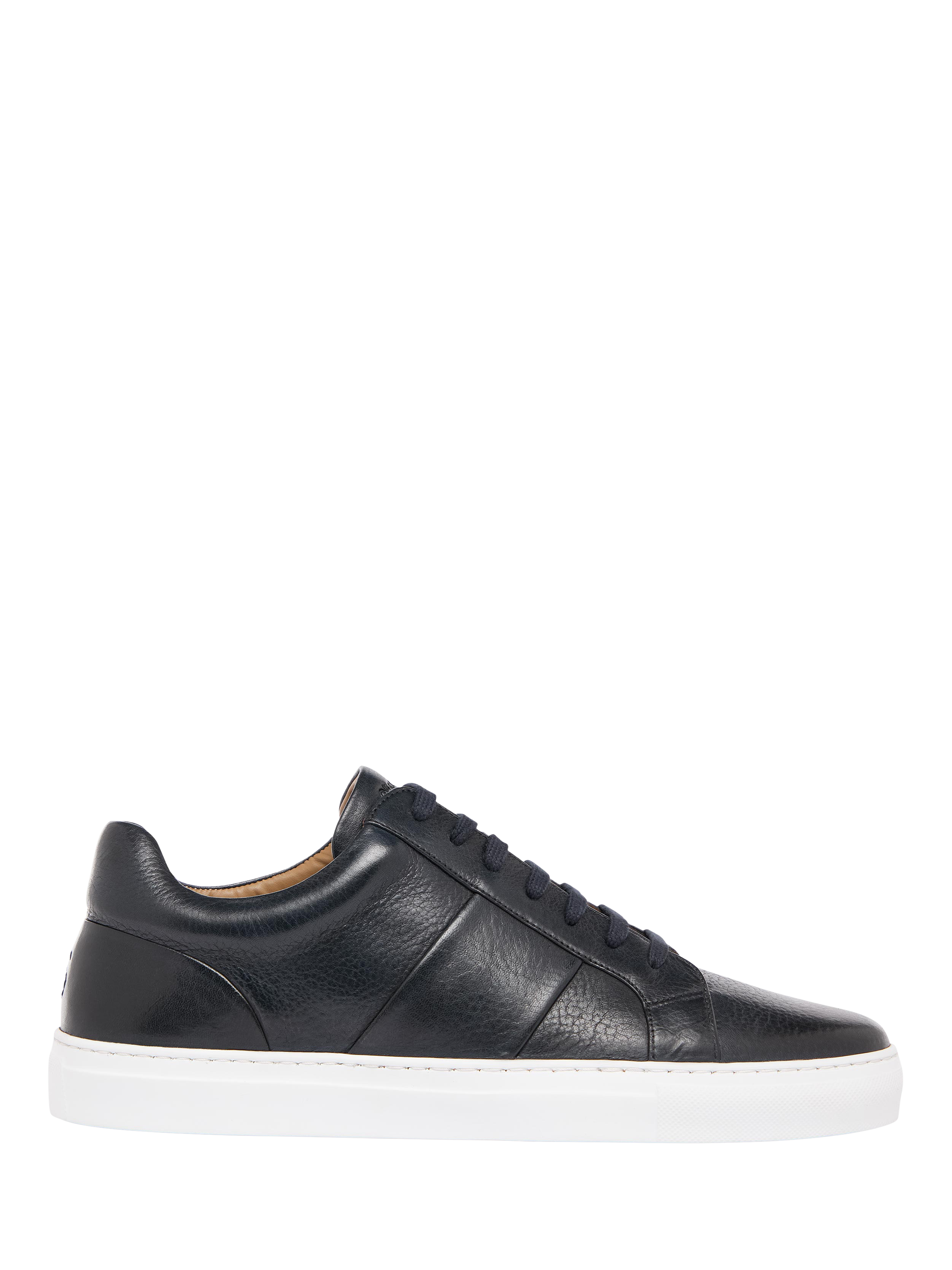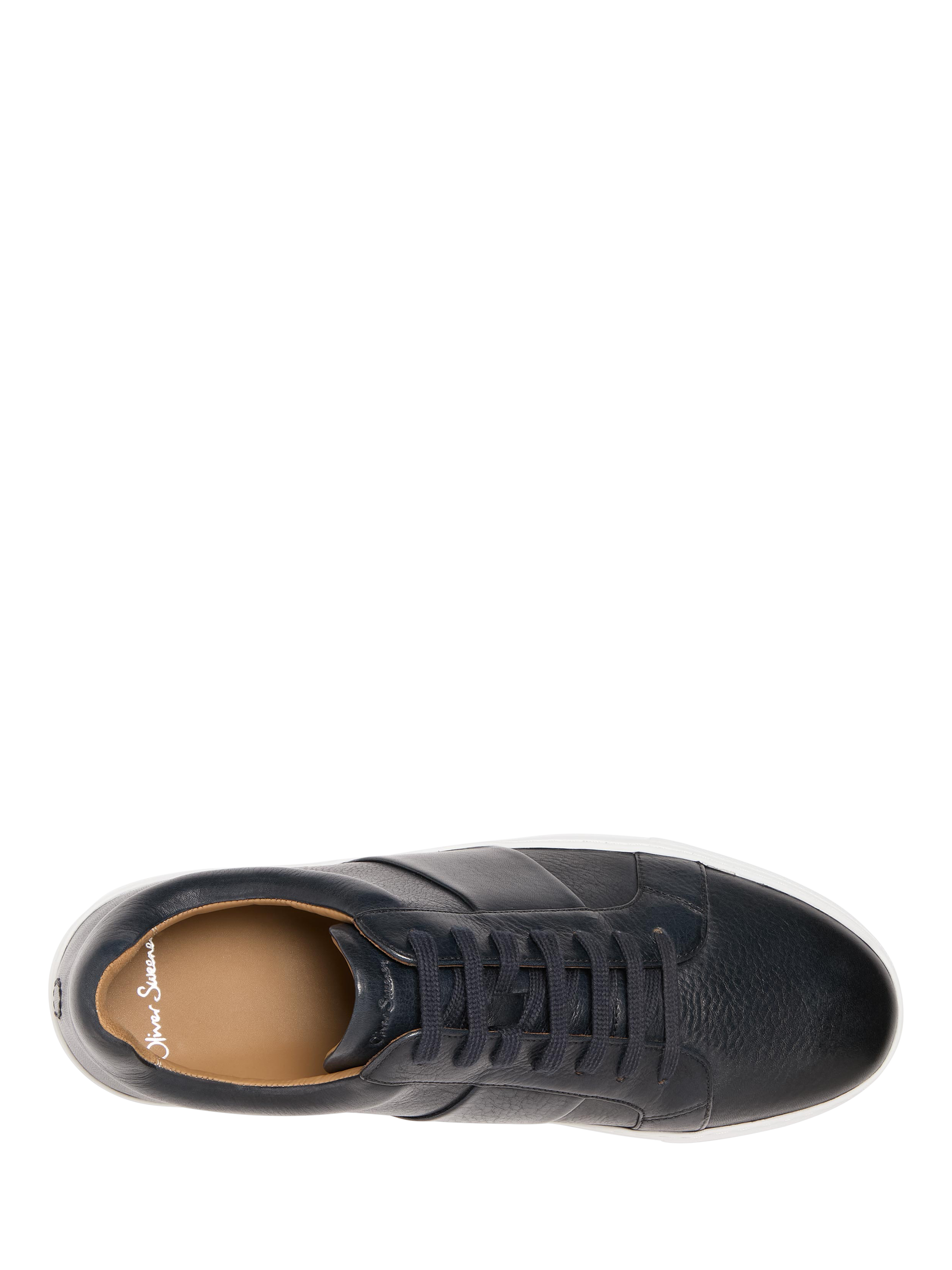 Oliver Sweeney's new cupsole trainer is made from milled leather, a tumbled, grainy textured leather with a soft feel. The upper pattern has clean lines with neatly folded seams and side panels and a cushioned collar.
